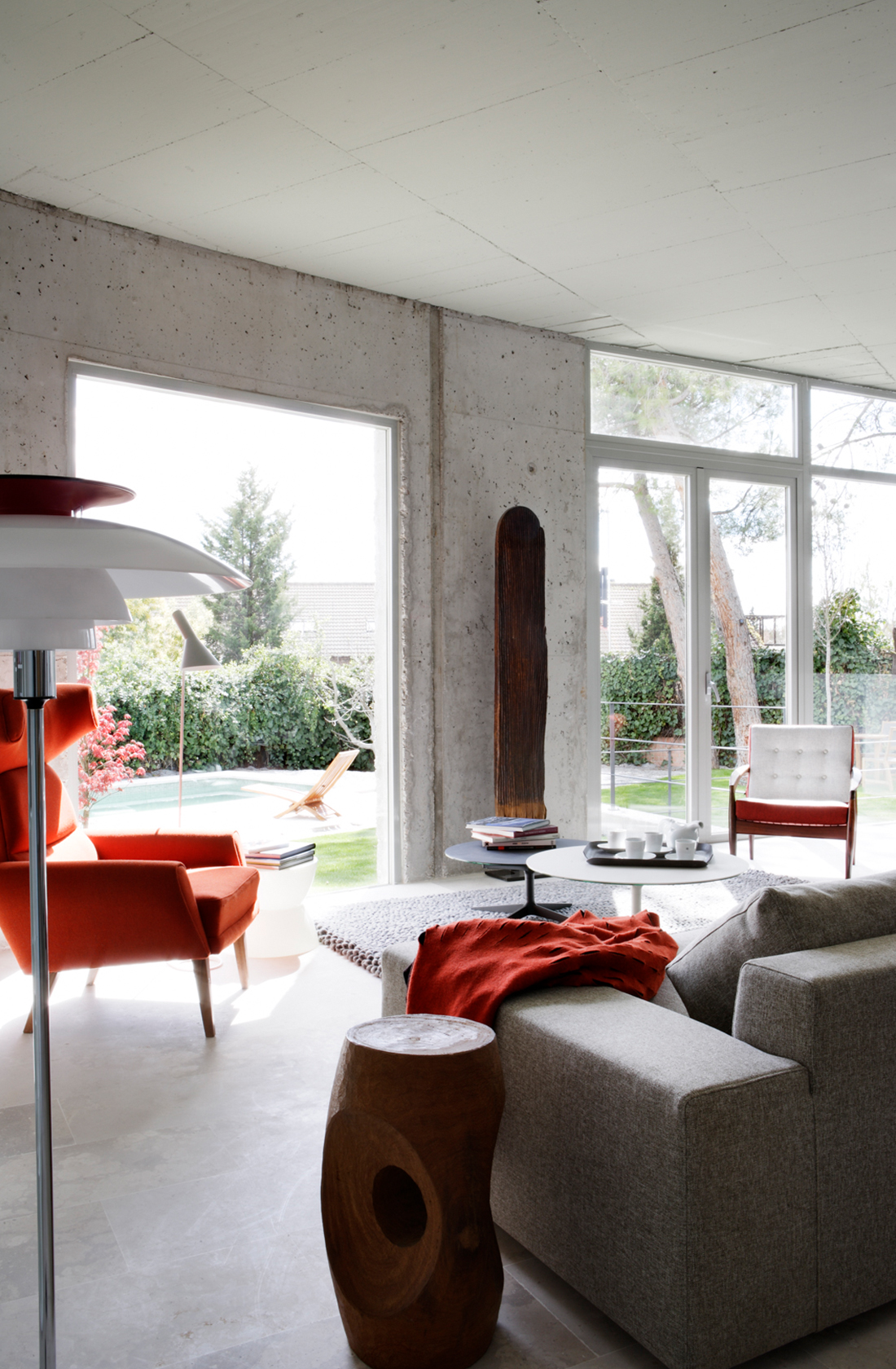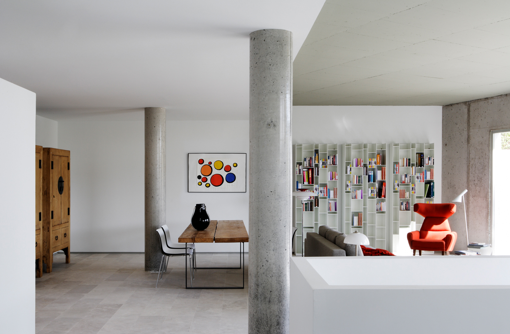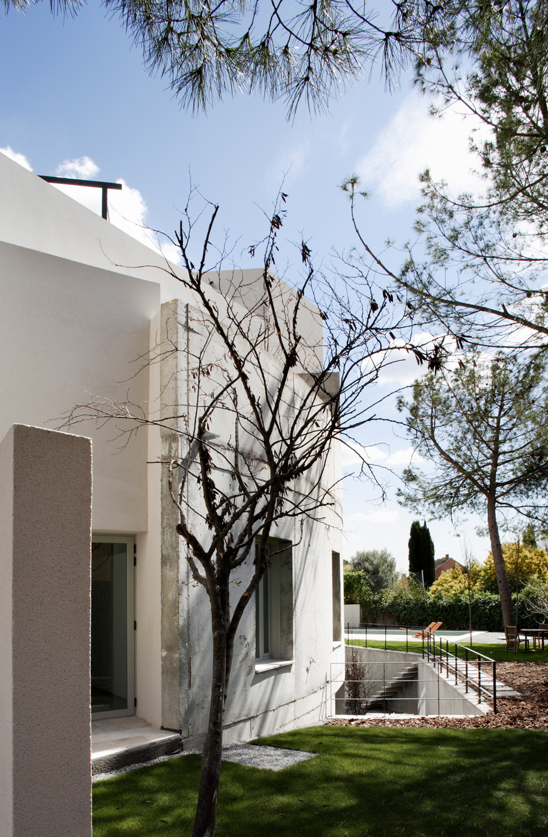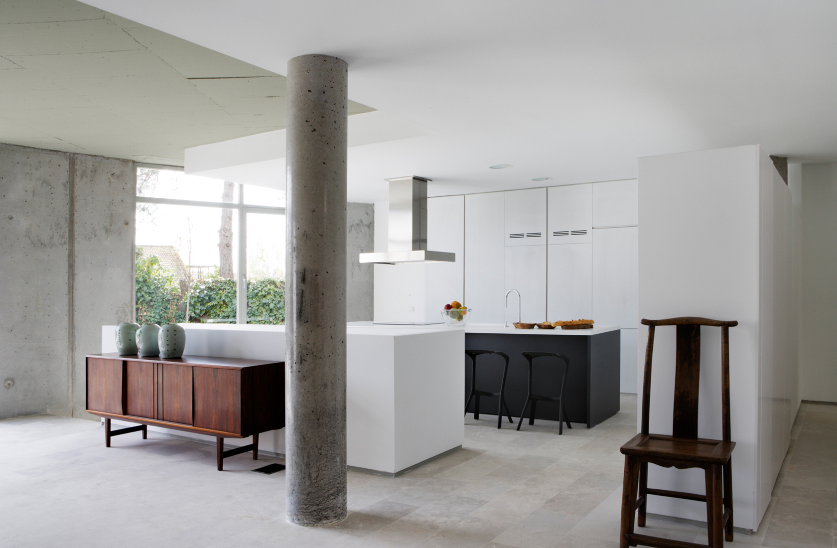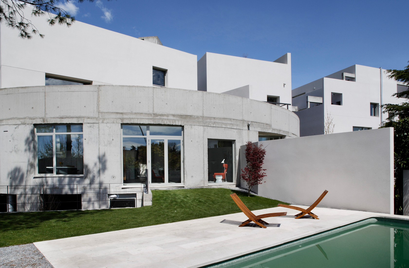 Ground floor flat in which the different areas are linked to each other as well as to the garden outside. The southern face is a rounded concrete wall with a private garden and swimming pool behind.