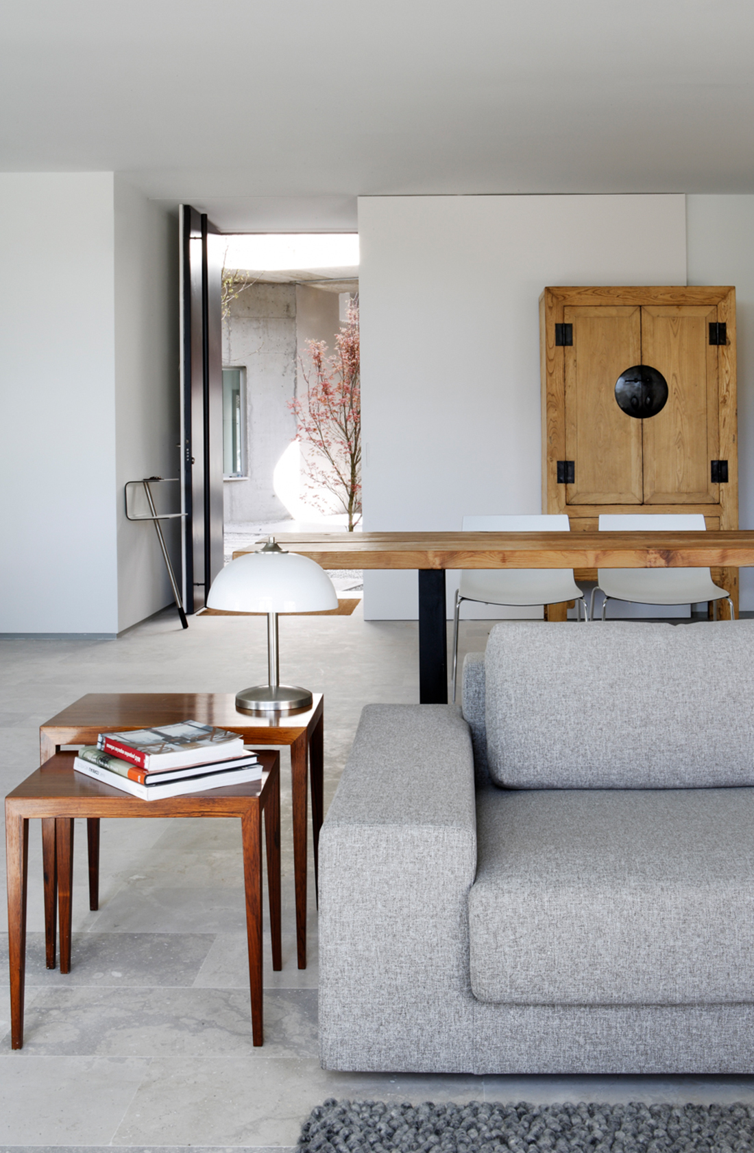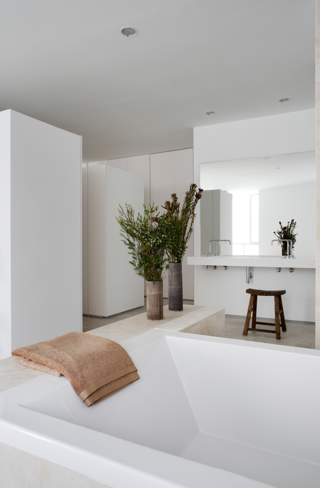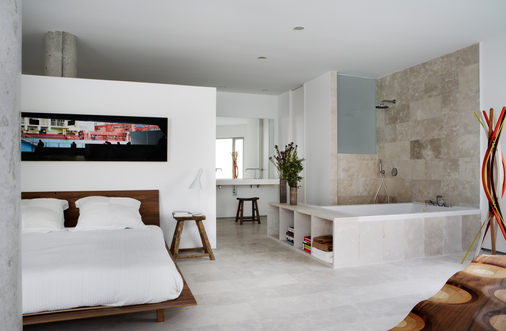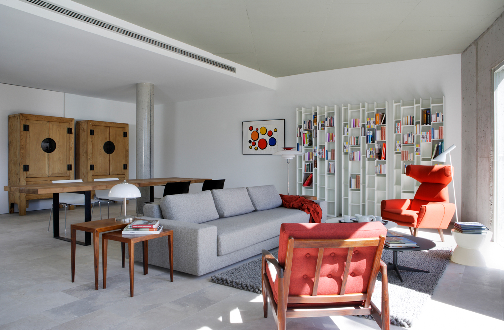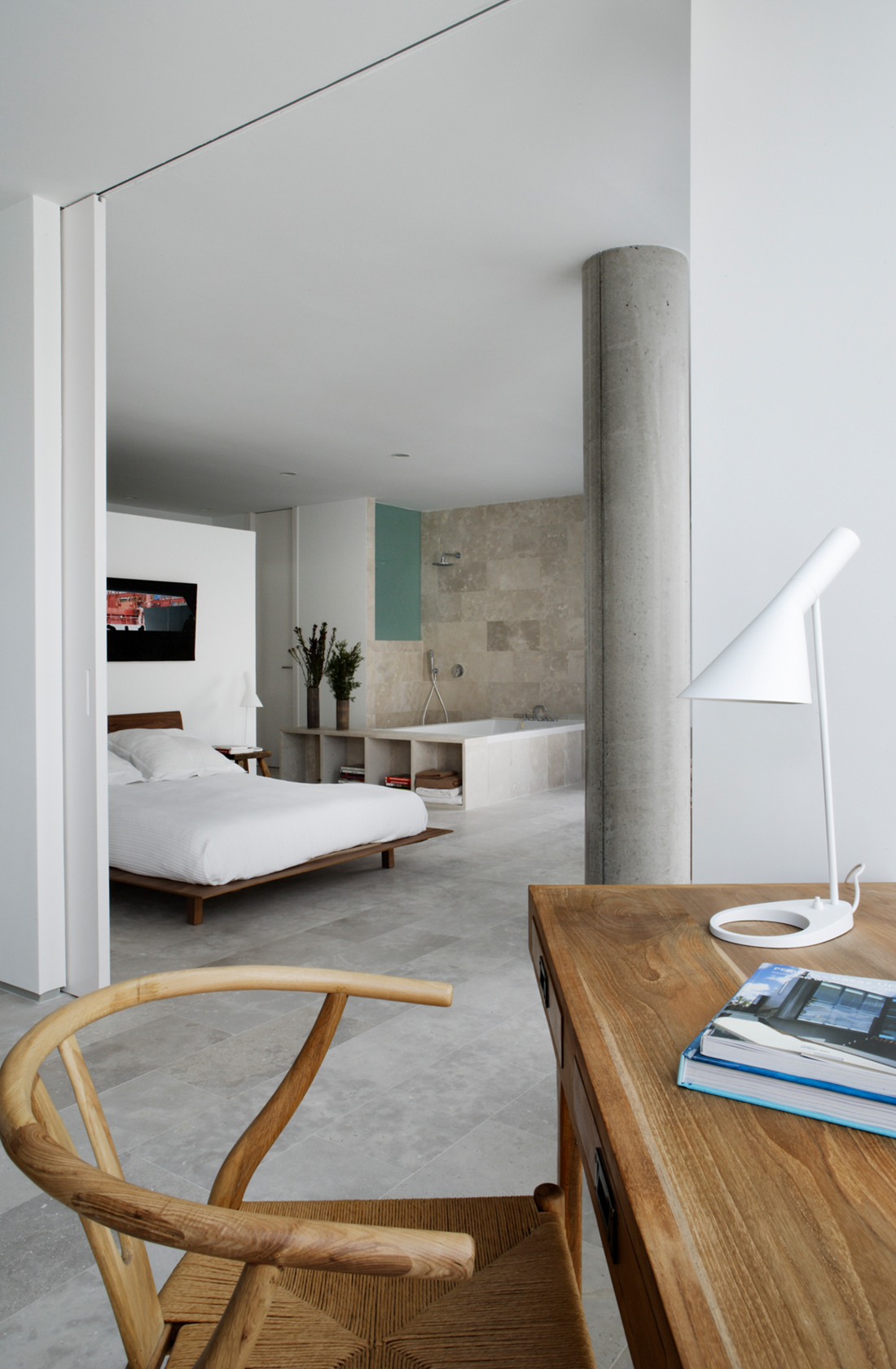 Ground floor flat in which the different areas are linked to each other as well as to the garden outside. The southern face is a rounded concrete wall with a private garden and swimming pool behind.