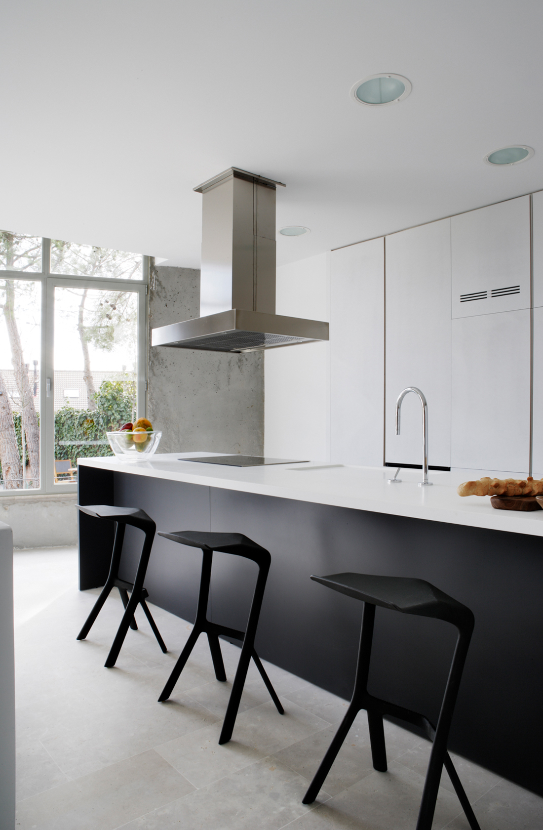 The kitchen was conceived as a social area openly connected to the other rooms. Only two constructive materials were used: limestone for floors and damp areas and white matt paint on walls, cupboards or sliding doors.