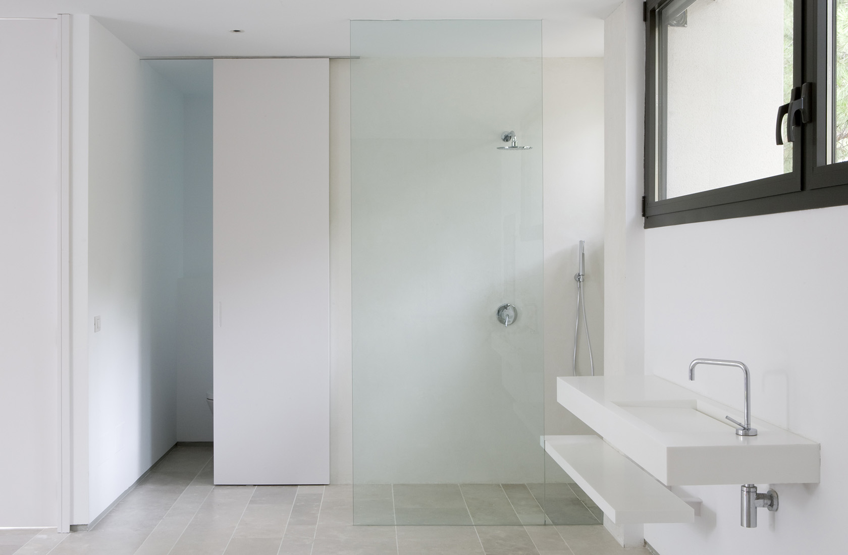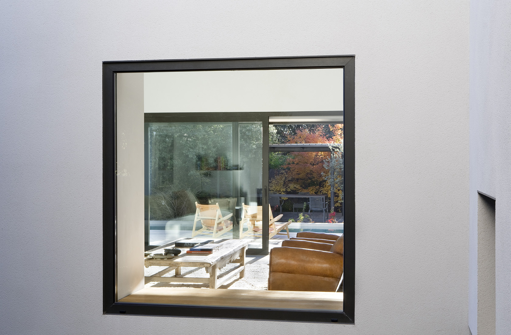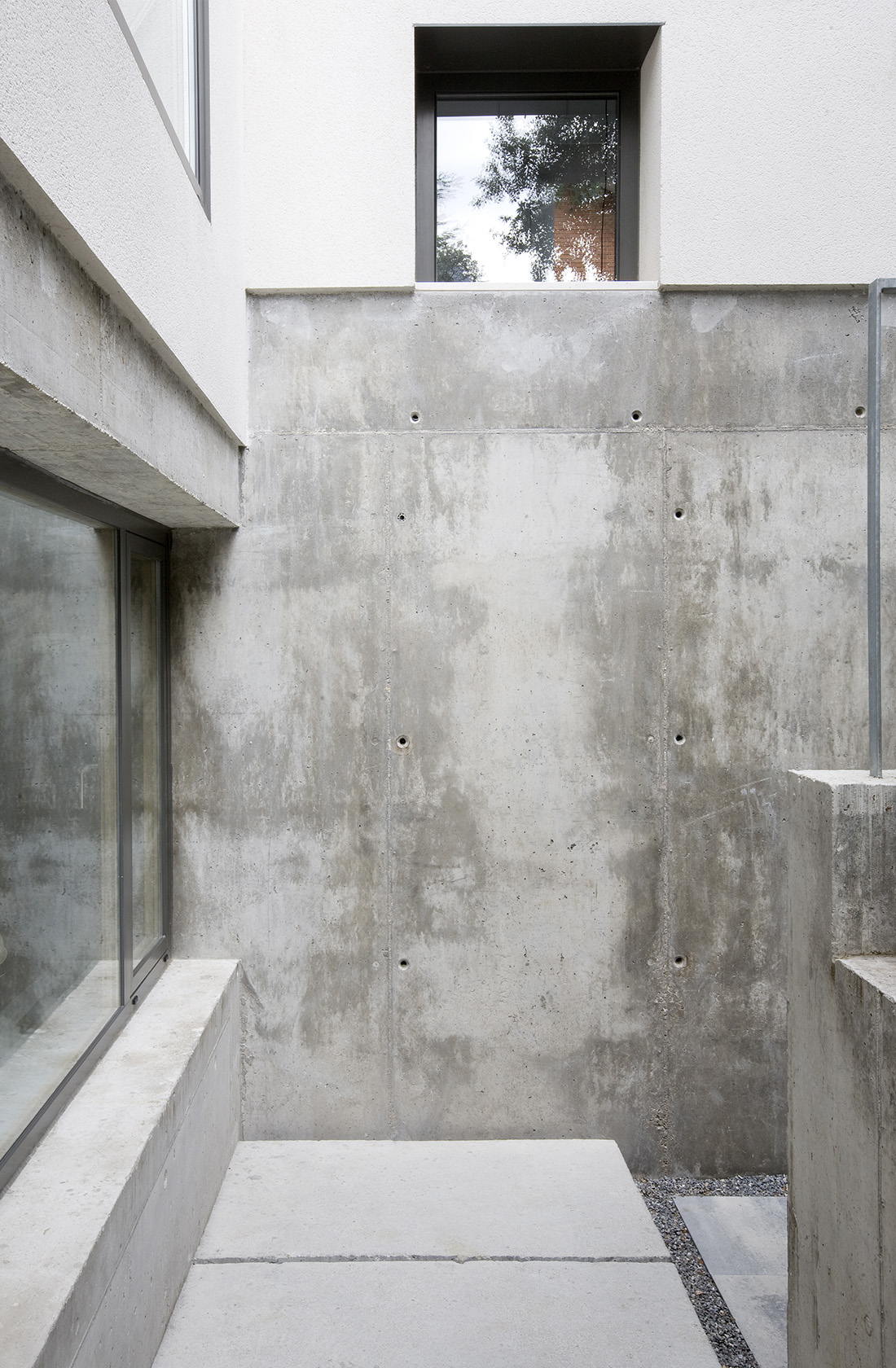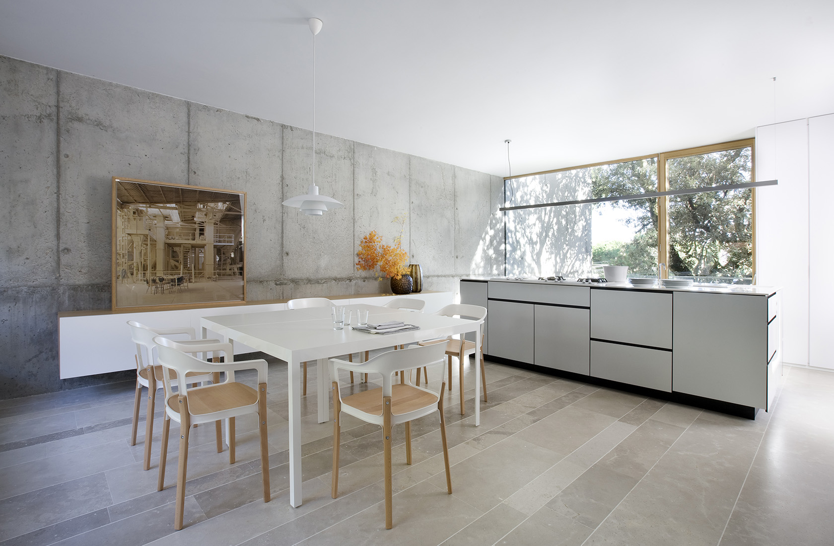 As for the main materials used in the build: Honed limestone floors laid over an under floor heating system. Plastered walls finished in matt white paint. Facades clad with coloured mortar render. Flat roofs layered with gravel. Interior woodwork and doors made from white-lacquered MDF. Exterior joinery made from lacquered aluminium.