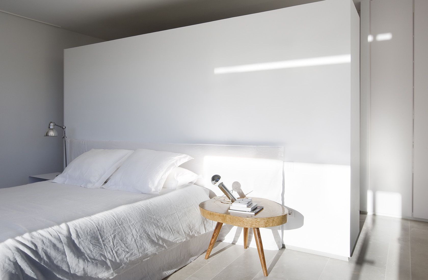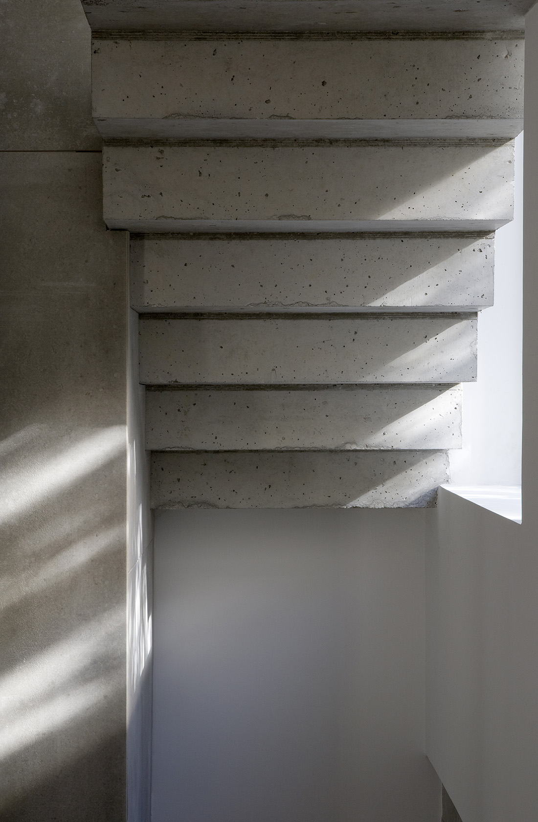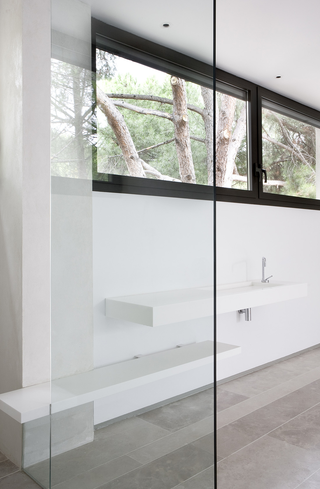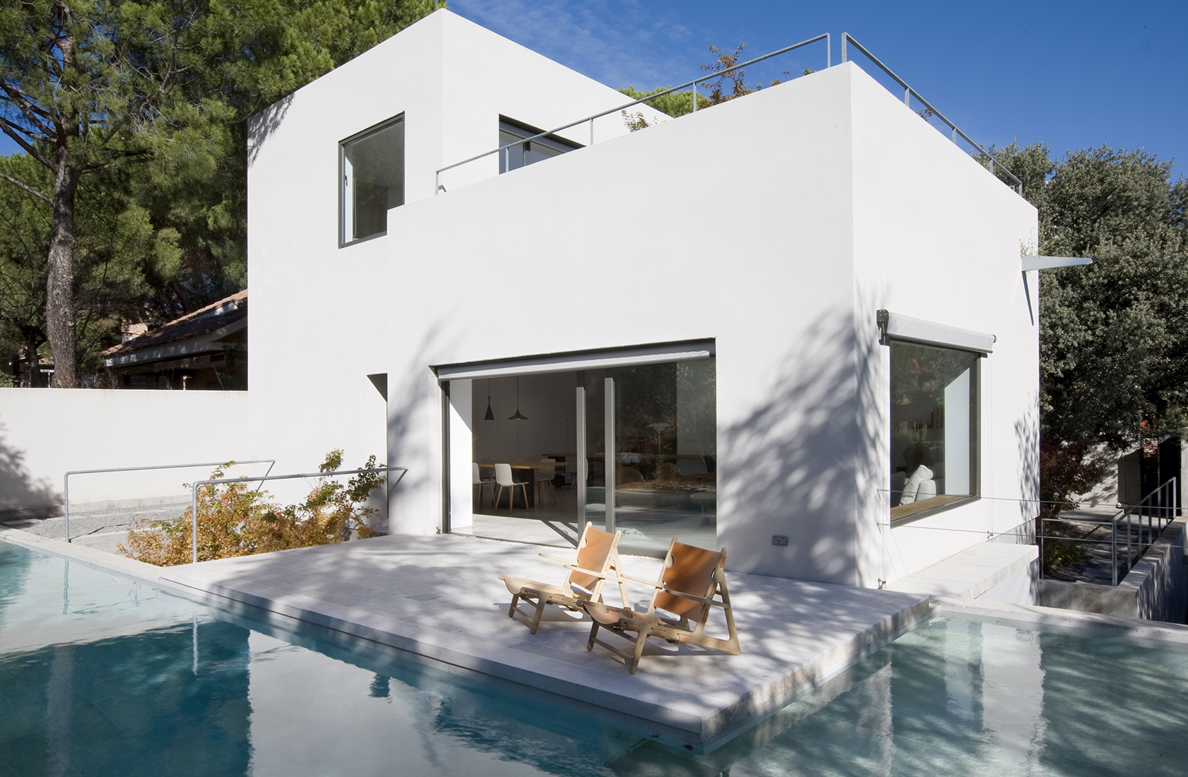 As for the main materials used in the build: Honed limestone floors laid over an under floor heating system. Plastered walls finished in matt white paint. Facades clad with coloured mortar render. Flat roofs layered with gravel. Interior woodwork and doors made from white-lacquered MDF. Exterior joinery made from lacquered aluminium.