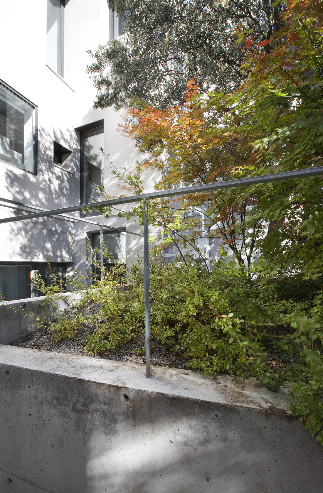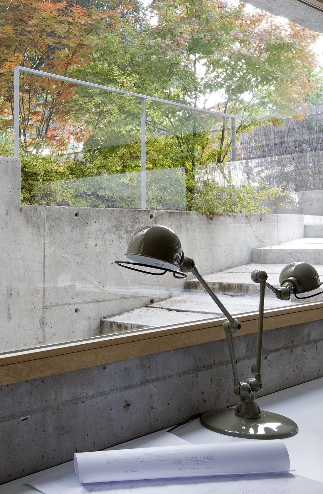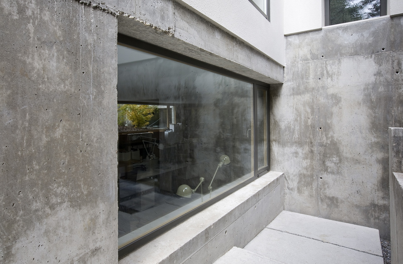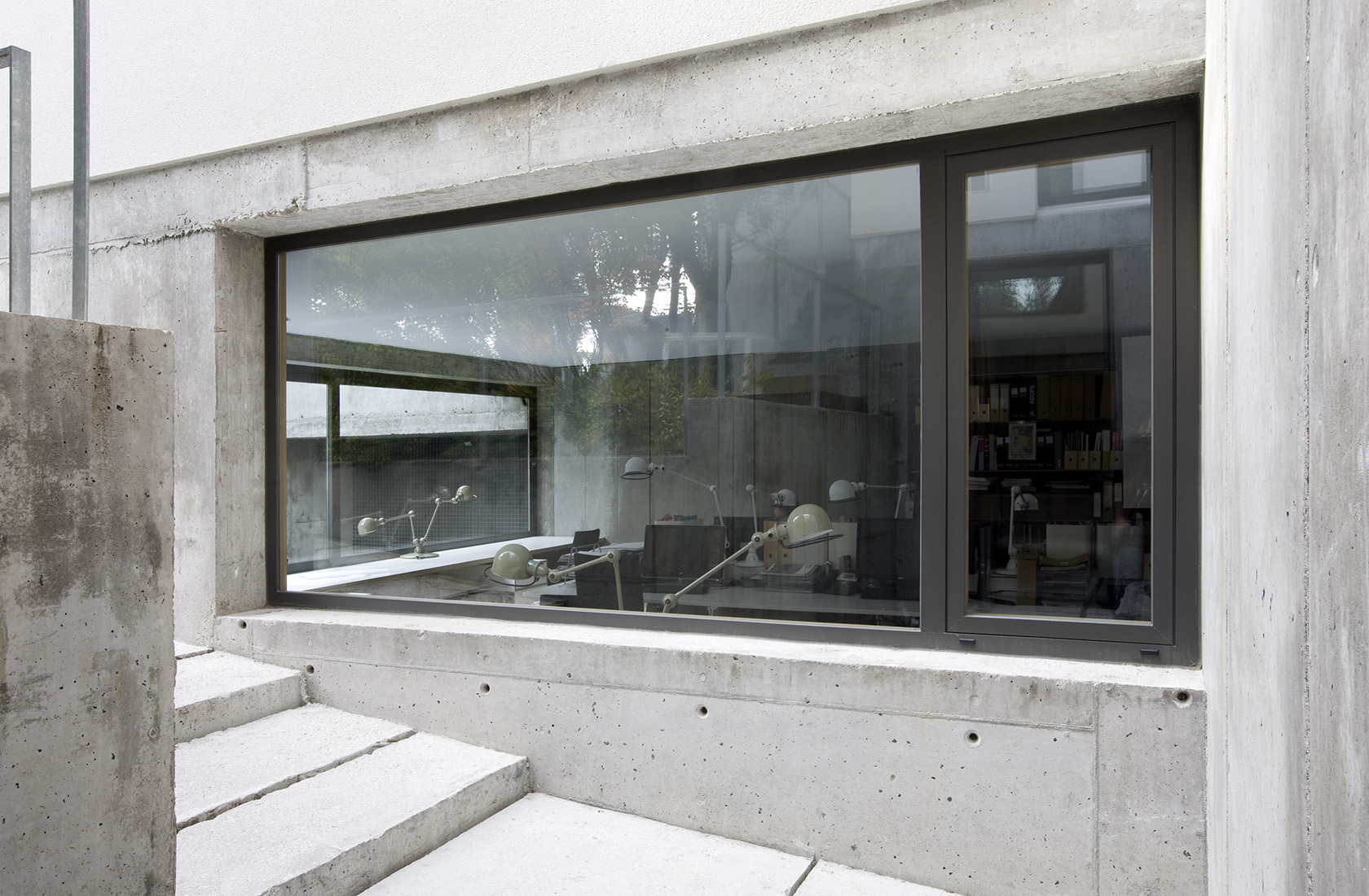 The large swimming pool helps to clear the heat coming from the absorption machine. The concrete walls in the basement were covered with shelves and cupboards increasing thermal insulation. A cube was embedded in the centre of the building and floating above the basement, serves as the heart of the property being the place which leads to the upper areas by way of an interior excavation.