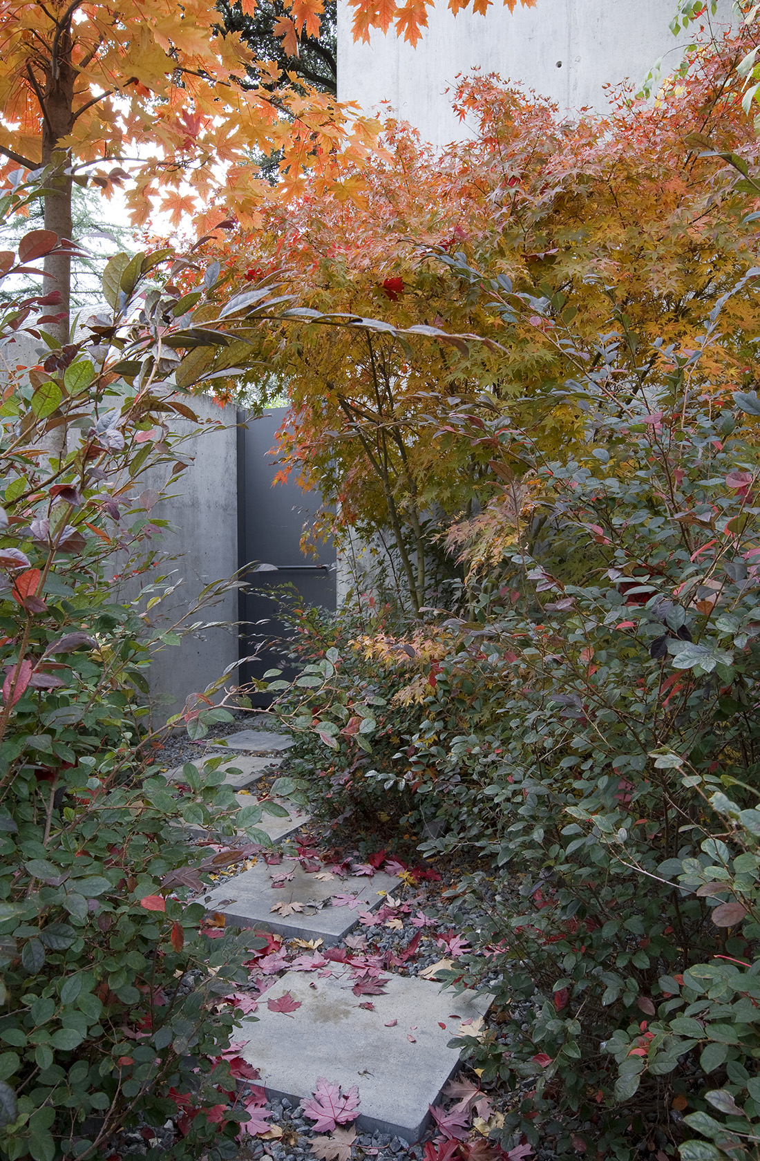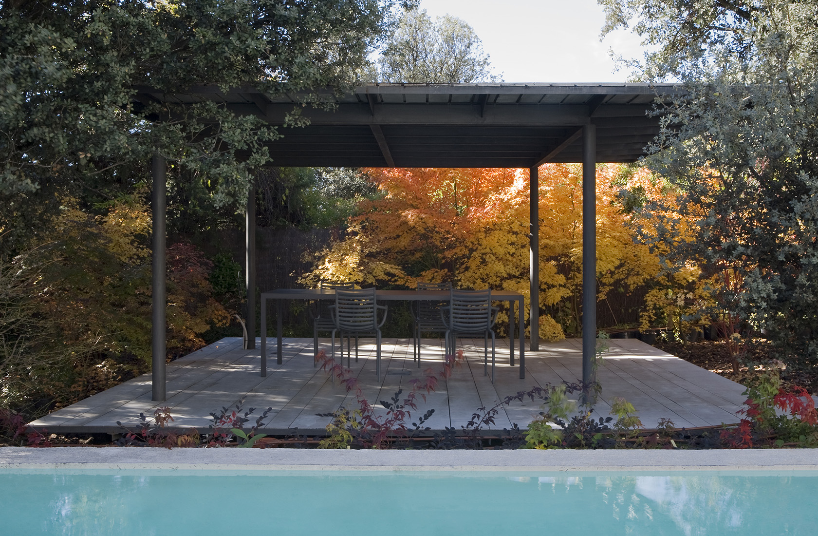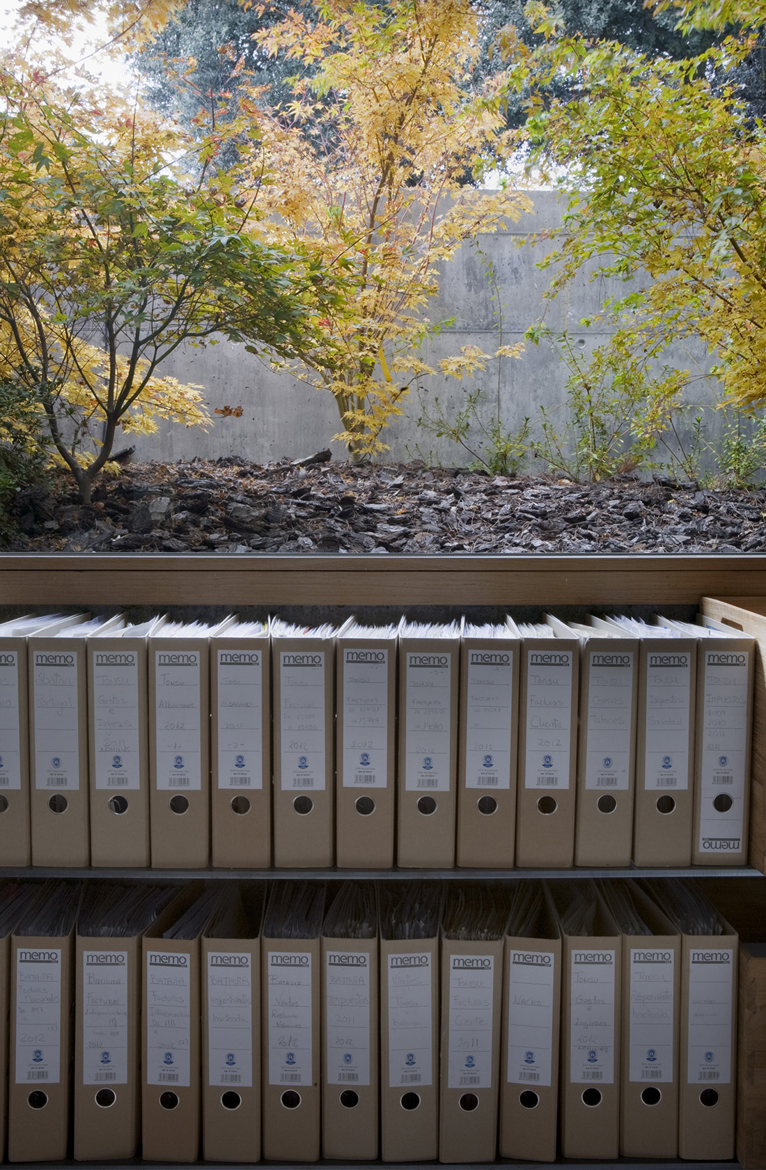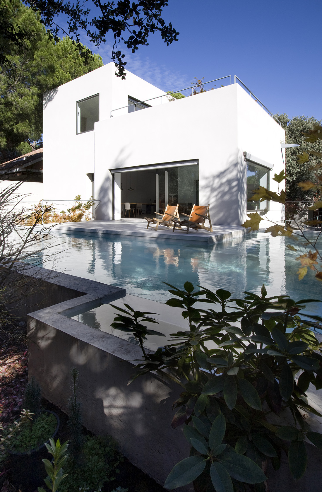 The large swimming pool helps to clear the heat coming from the absorption machine. The concrete walls in the basement were covered with shelves and cupboards increasing thermal insulation. A cube was embedded in the centre of the building and floating above the basement, serves as the heart of the property being the place which leads to the upper areas by way of an interior excavation.