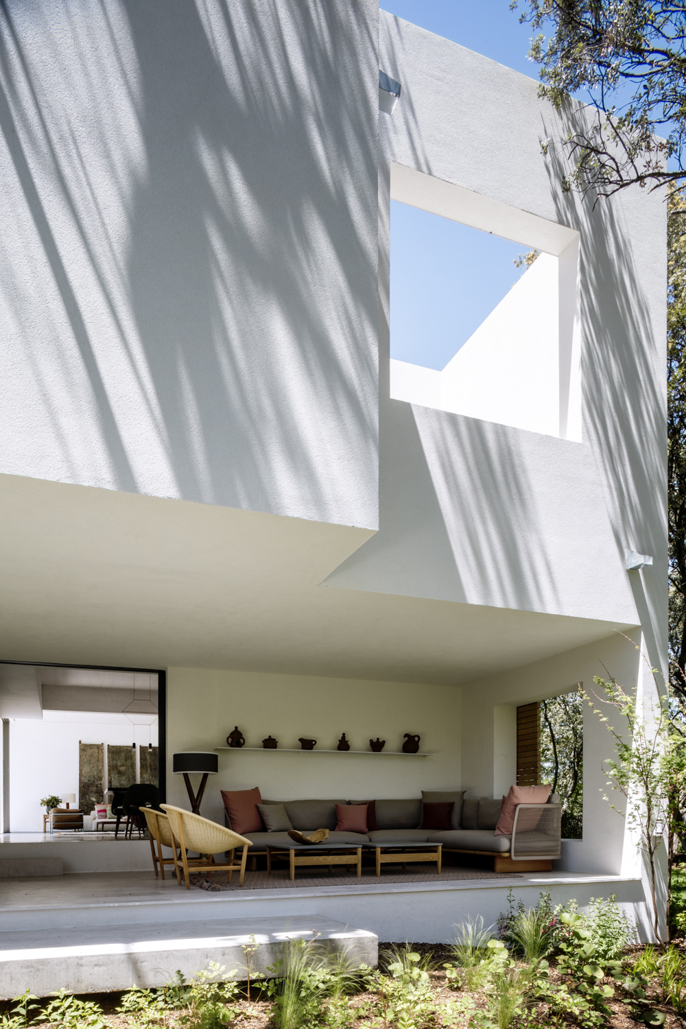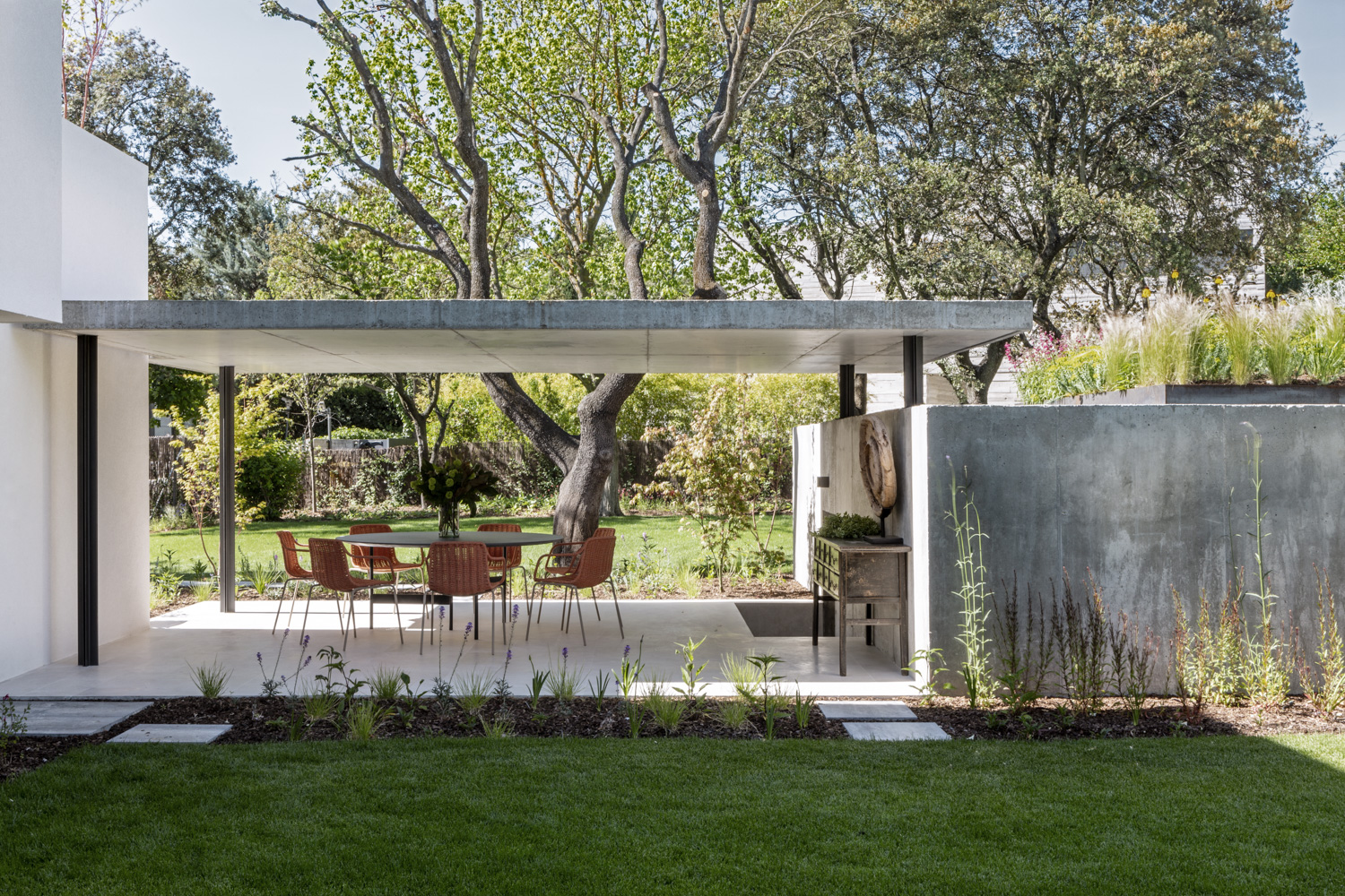 However, on the upper floor, the rooms are displayed as small oases in which each one looks for its own views of the outside. The result is a very luminous house in which the presence of the garden and the existing oaks is always present. The uses are enclosed in volumes of different sizes, which are linked at different heights to create a dynamic result. Two perpendicular volumes of different heights are joined, together with another half-buried one, and they form an open courtyard that faces South and East, trying to optimise the orientation and views and minimizing the presence of the building on the plot. One of the pieces is a volume that is emptied to fit the living room. The perpendicular piece is built with a base over which the bedrooms fly, with a wider span. The stairs between the ground floor and the first floor are almost sculptural and emerge from the building bringing light into the rooms to which they are connected. They are made of double-stepped concrete.