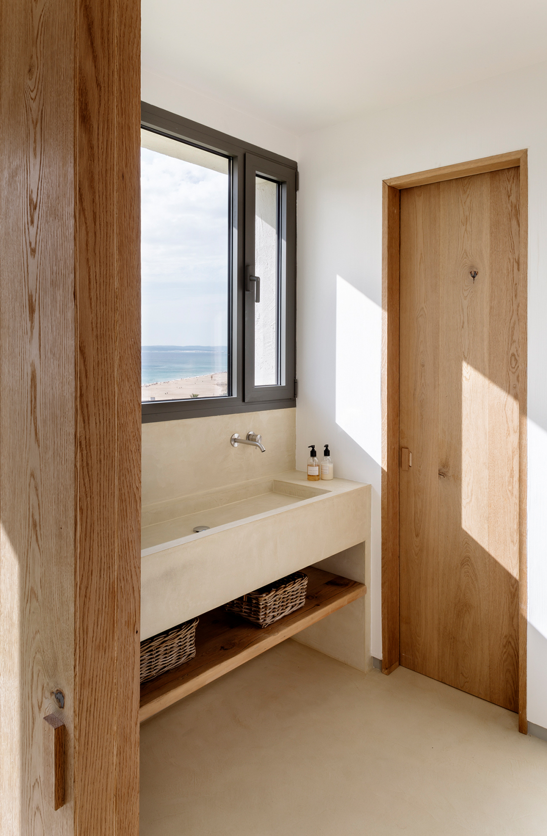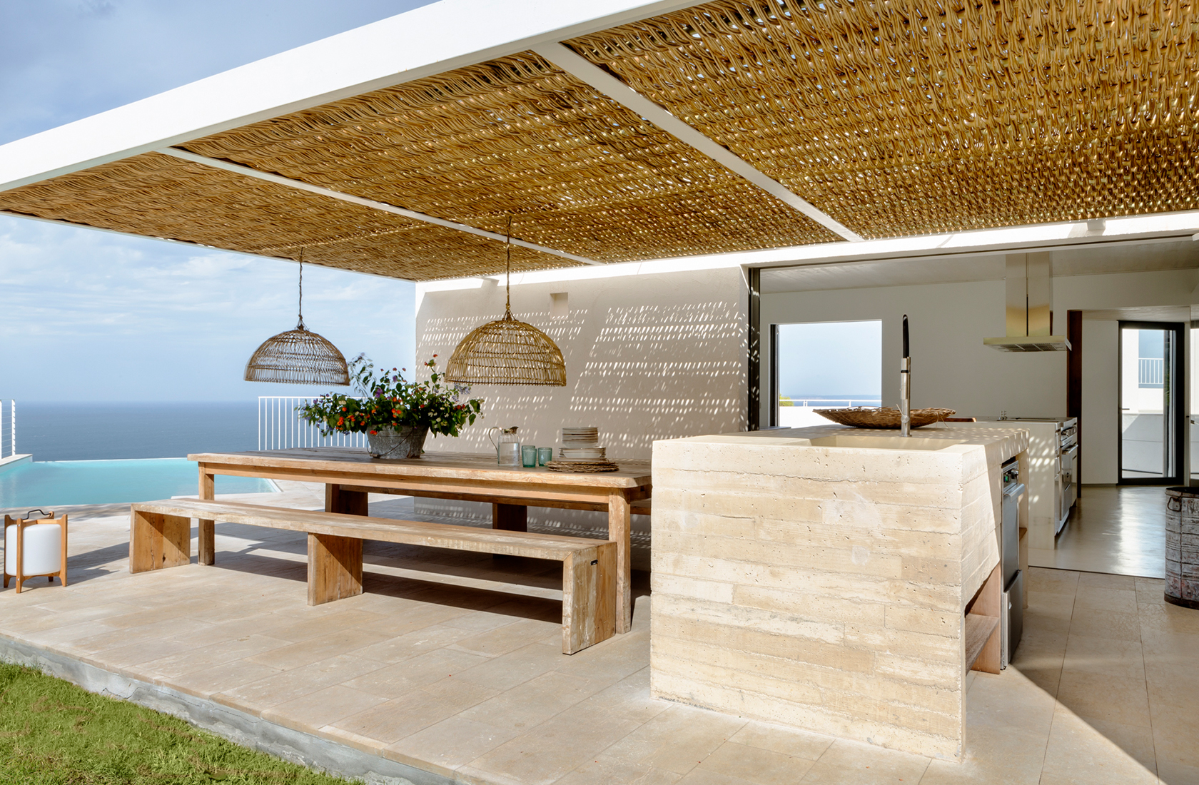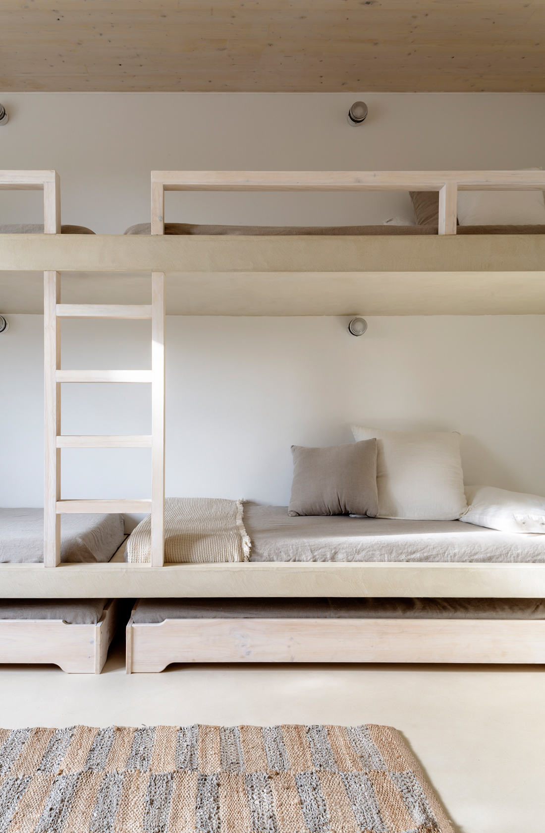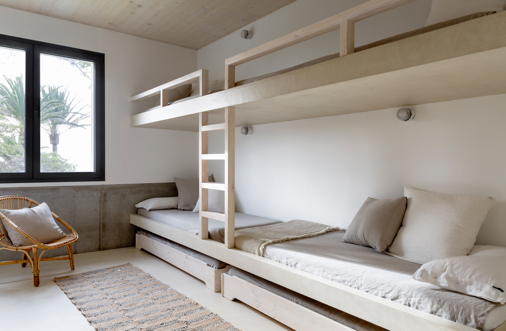 Large windows were designed for maximum opening and minimum profile carpentry to ensure the highest visual comfort. Spaces were linked as much as possible and we tried to break the boundaries inside/outside, except for the main entrance facade which is sheltered from external views and guarantees privacy. The infinity swimming pool, flying over the sea, is located on the upper floor, where there is also the kitchen which is divided into two parts, one totally covered and the other on the outside under a natural fibers handcrafted pergola. The bedrooms and bathrooms focus on the sea views. The living room is divided in two rooms separated by a step in the floor and split by the fireplace and its woodshelves that were designed specifically to highlight this division. A fun children’s bedroom was built with tailor-made bunk beds to host 6 guest children.