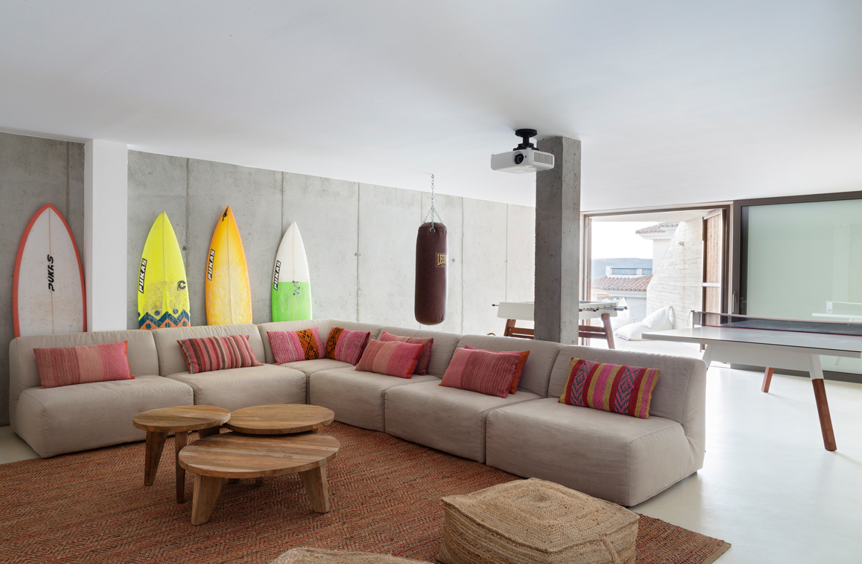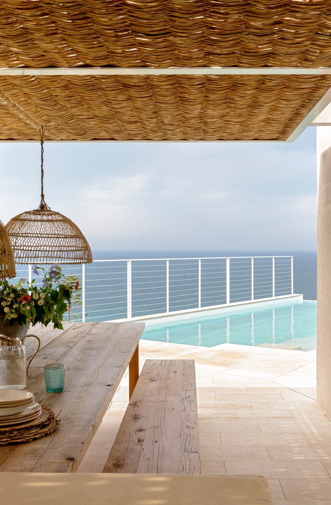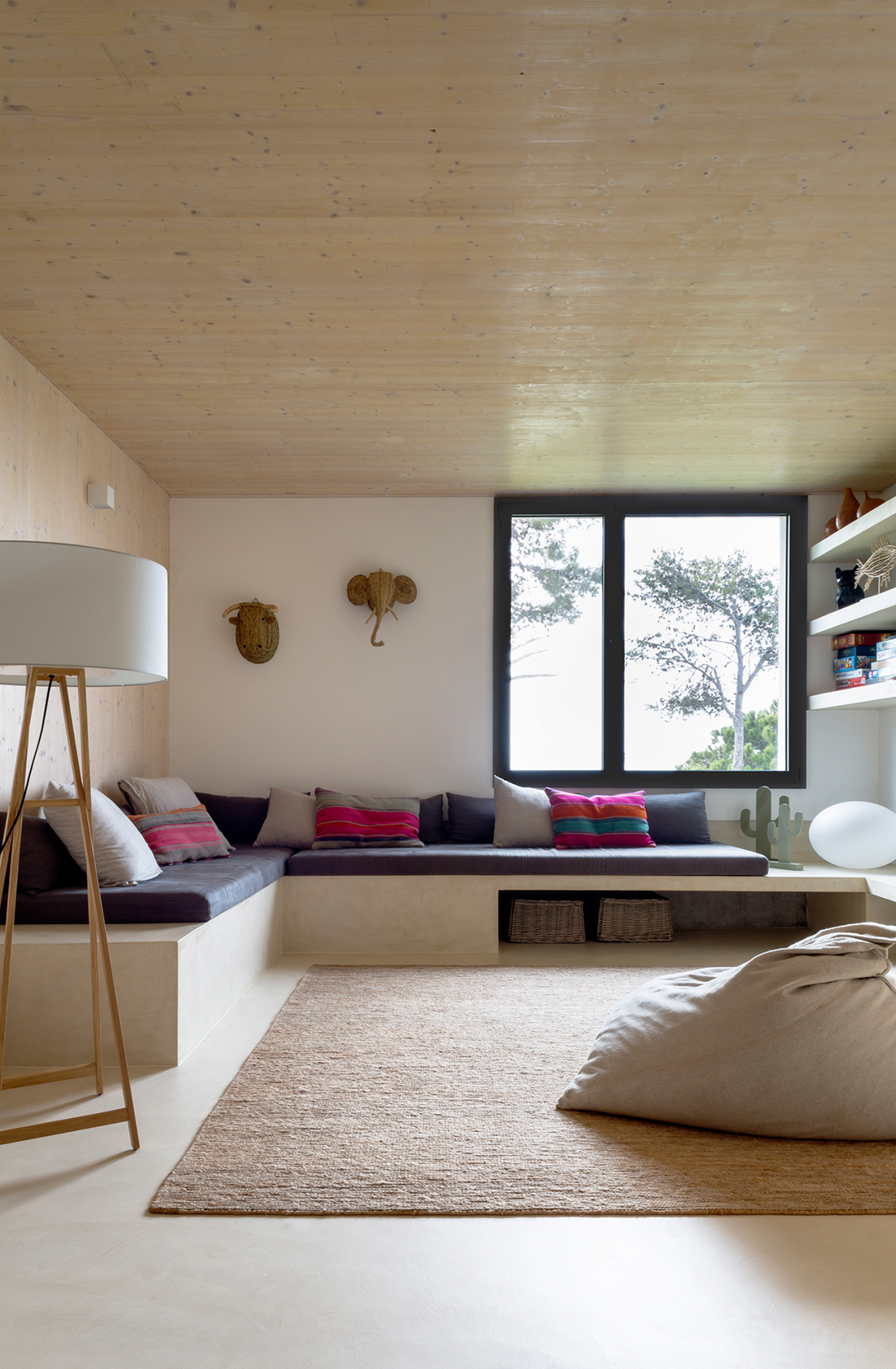 Large windows were designed for maximum opening and minimum profile carpentry to ensure the highest visual comfort. Spaces were linked as much as possible and we tried to break the boundaries inside/outside, except for the main entrance facade which is sheltered from external views and guarantees privacy. The infinity swimming pool, flying over the sea, is located on the upper floor, where there is also the kitchen which is divided into two parts, one totally covered and the other on the outside under a natural fibers handcrafted pergola. The bedrooms and bathrooms focus on the sea views. The living room is divided in two rooms separated by a step in the floor and split by the fireplace and its woodshelves that were designed specifically to highlight this division. A fun children’s bedroom was built with tailor-made bunk beds to host 6 guest children.