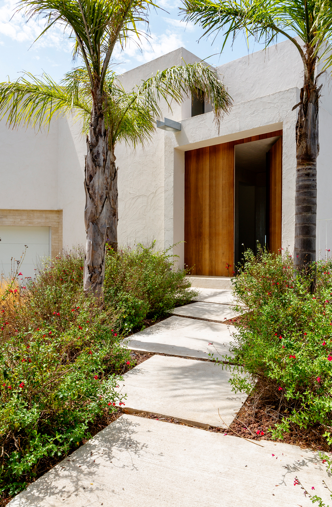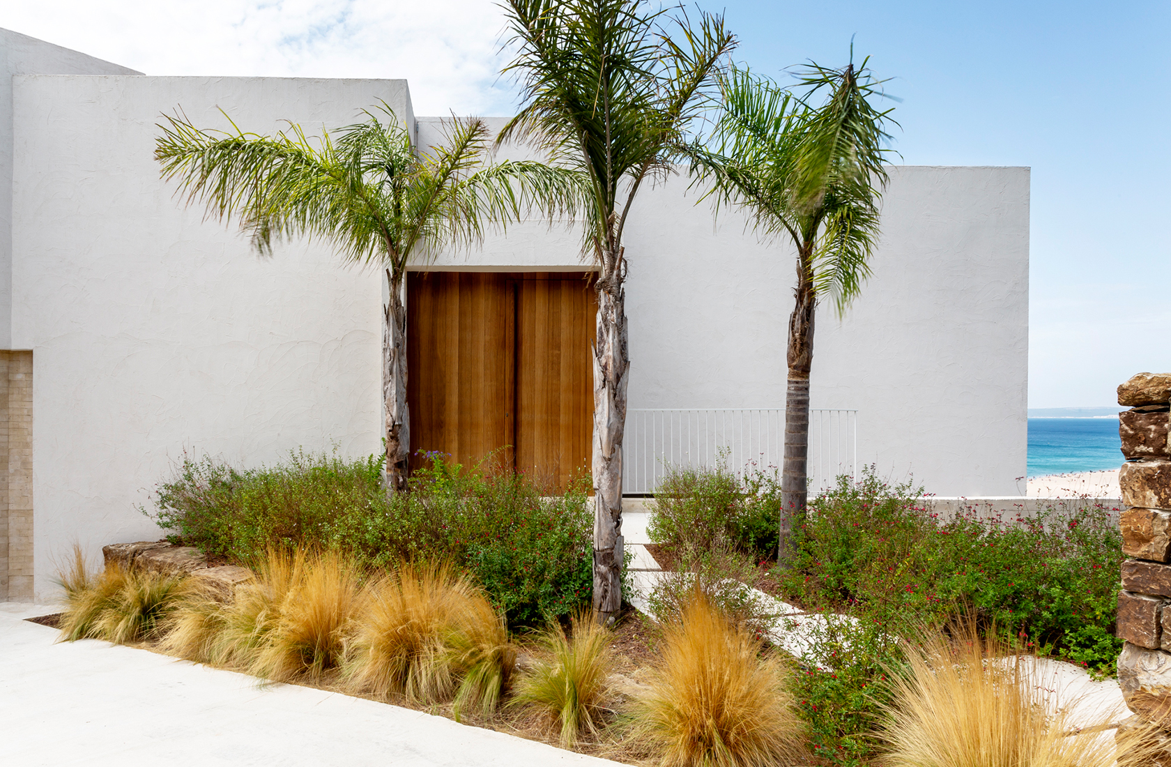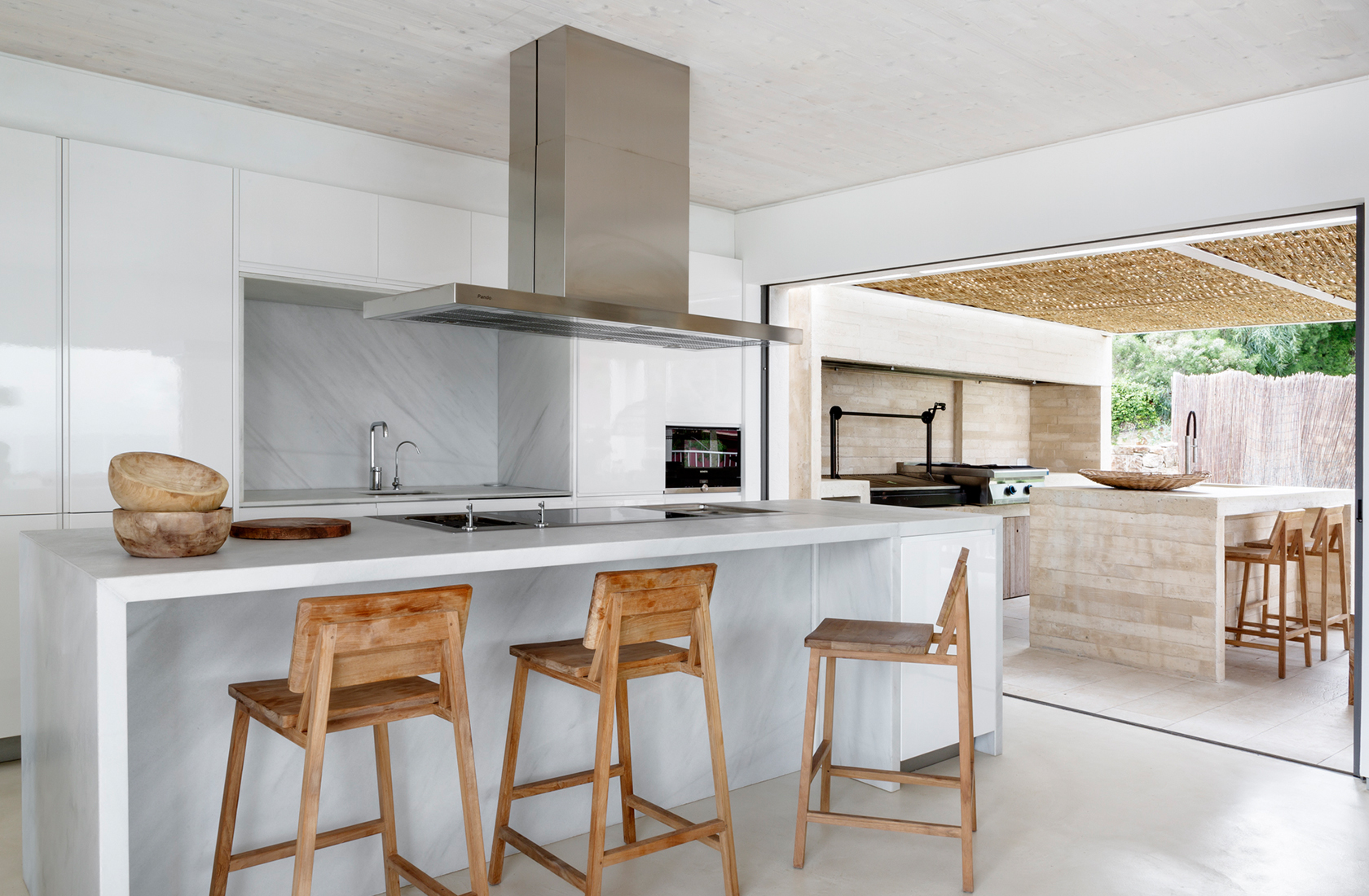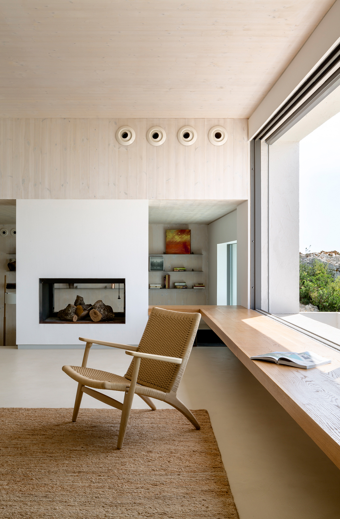 Large windows were designed for maximum opening and minimum profile carpentry to ensure the highest visual comfort. Spaces were linked as much as possible and we tried to break the boundaries inside/outside, except for the main entrance facade which is sheltered from external views and guarantees privacy. The infinity swimming pool, flying over the sea, is located on the upper floor, where there is also the kitchen which is divided into two parts, one totally covered and the other on the outside under a natural fibers handcrafted pergola. The bedrooms and bathrooms focus on the sea views. The living room is divided in two rooms separated by a step in the floor and split by the fireplace and its woodshelves that were designed specifically to highlight this division. A fun children’s bedroom was built with tailor-made bunk beds to host 6 guest children.