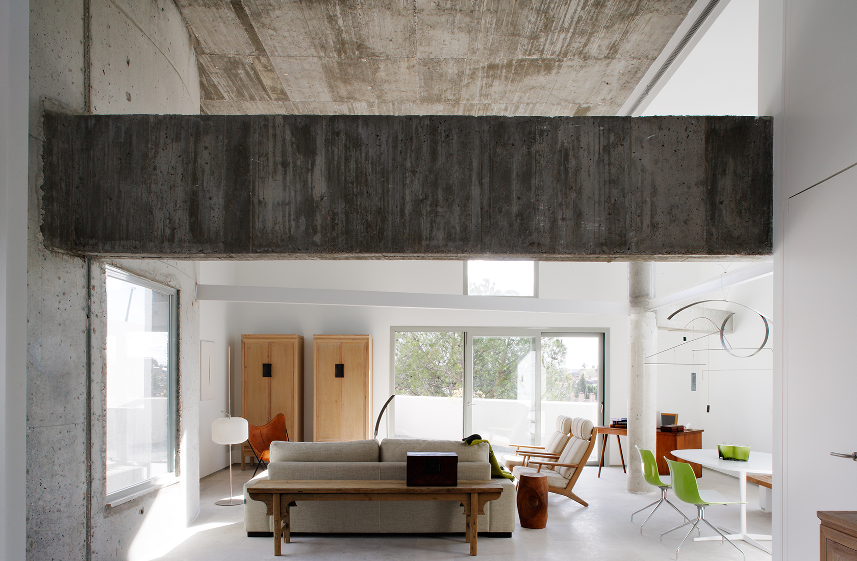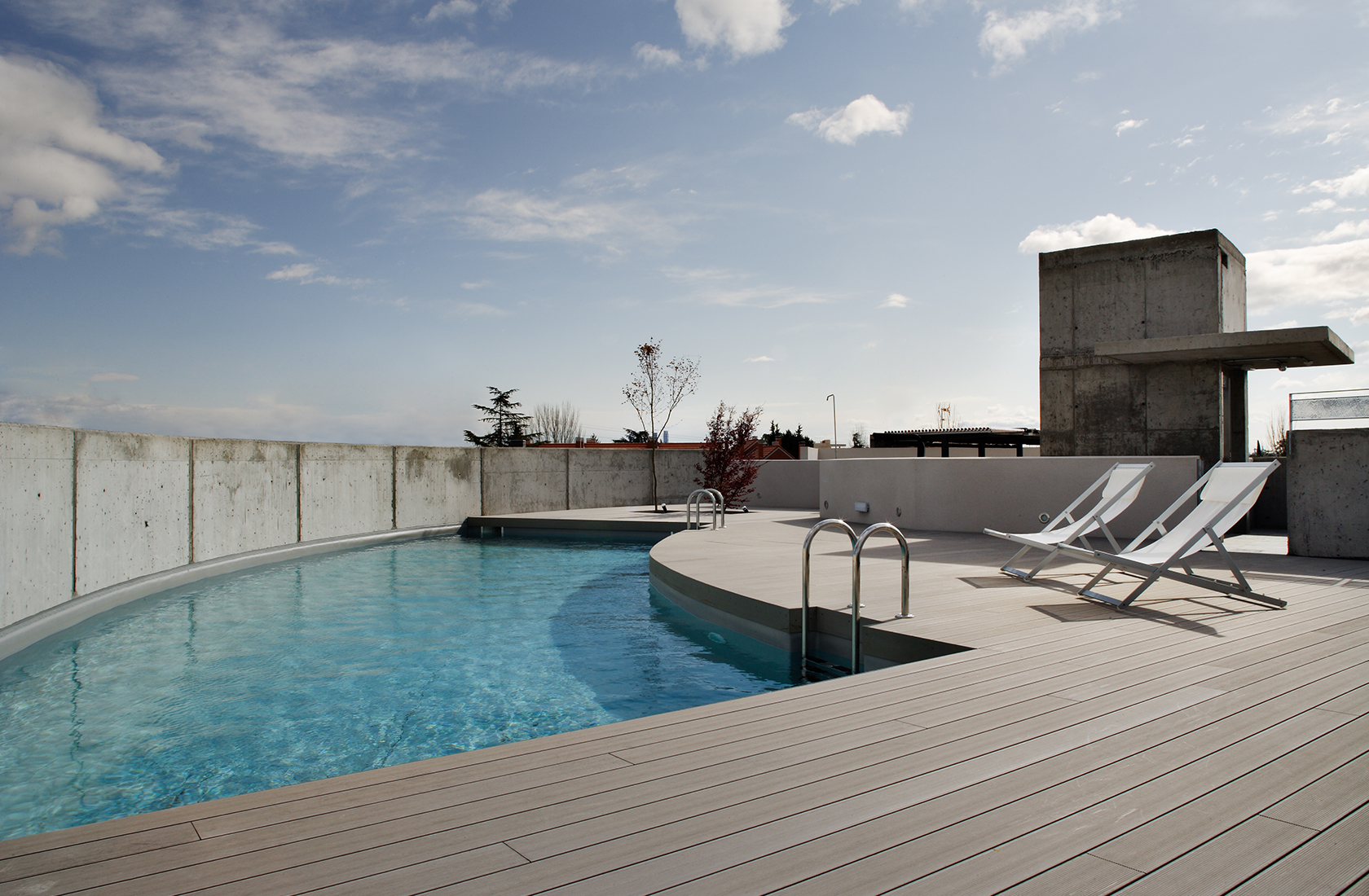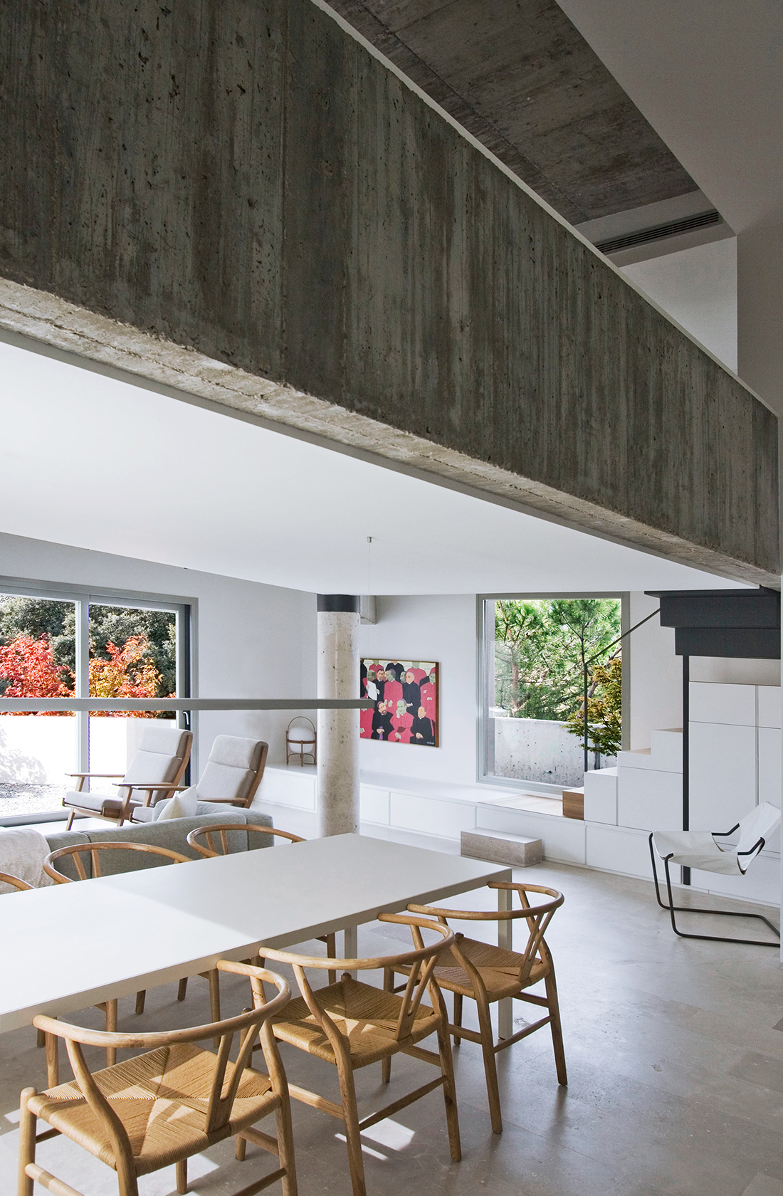 El objetivo fue conseguir la misma sensación que habitar una vivienda aislada para lo que se ajardinaron las terrazas. El material – en este caso hormigón – conforma la estructura y la piel del edificio. La vivienda se aisló acústicamente del resto de vecinos mediante losas de hormigón armado en los forjados. La escalera-escultura -compuesta por muebles y elementos de chapa de acero- destaca por su diseño.