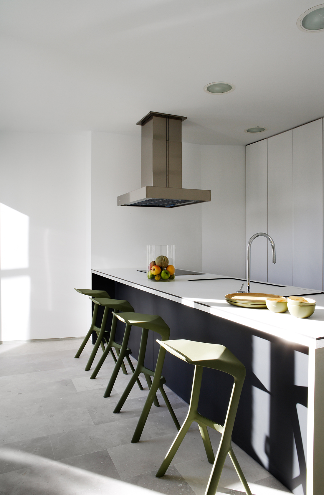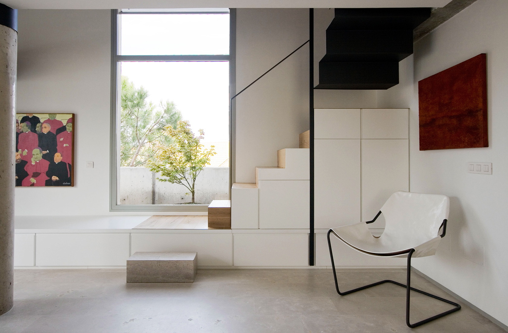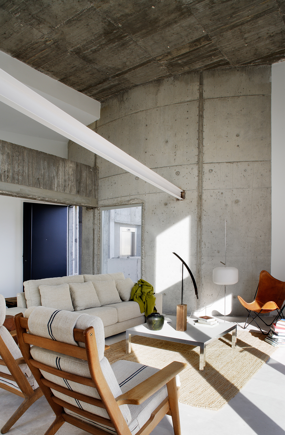 El objetivo fue conseguir la misma sensación que habitar una vivienda aislada para lo que se ajardinaron las terrazas. El material – en este caso hormigón – conforma la estructura y la piel del edificio. La vivienda se aisló acústicamente del resto de vecinos mediante losas de hormigón armado en los forjados. La escalera-escultura -compuesta por muebles y elementos de chapa de acero- destaca por su diseño.