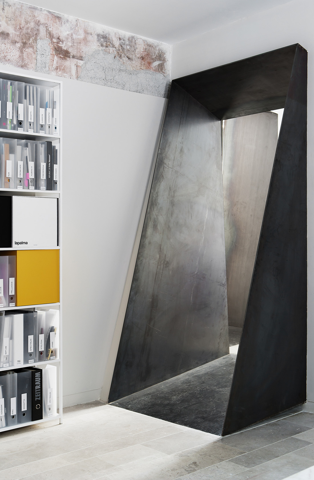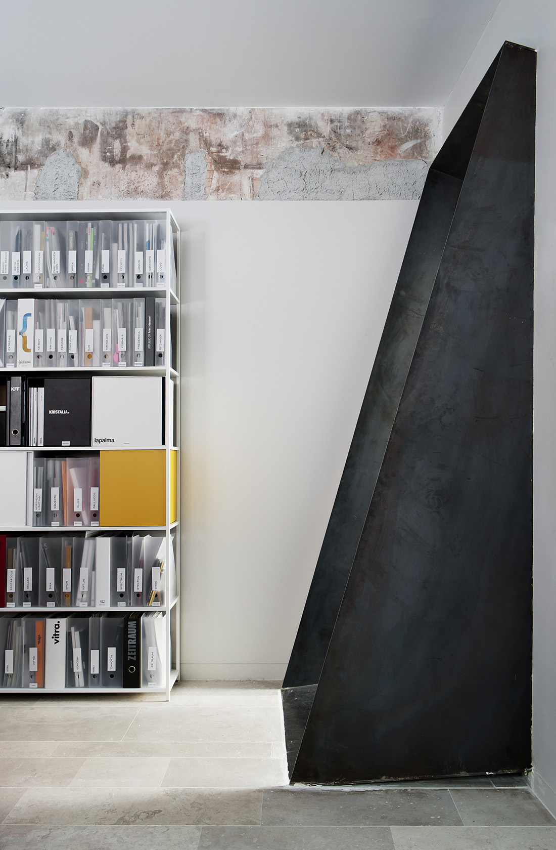 Para la reforma de esta nueva tienda de 400 m2, ÁBATON recibió el encargo de crear un espacio expositivo limpio y que al mismo tiempo revalorizara los elementos singulares que permanecían tras 110 años de uso como ferretería. Así, se han recuperado algunos de los suelos originales, paredes y estanterías, aunque también se ha querido destacar la intervención actual resolviendo el paso entre los diferentes espacios con unas rotundas embocaduras de acero que perforan los macizos muros de carga del palacio.