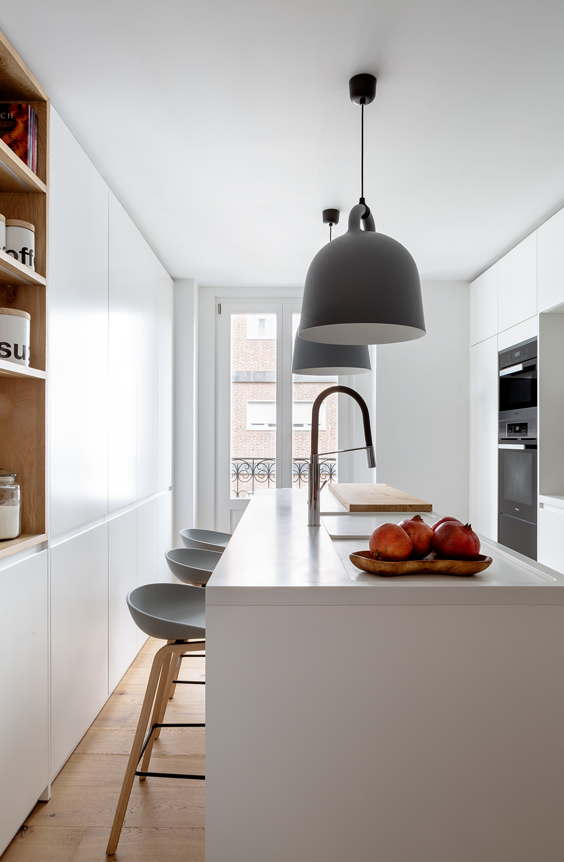 La cocina se plantea como un espacio de estar además de su función habitual. Para ello los materiales juegan un papel fundamental. El suelo y hornacina de madera de roble, la isla y los muebles blancos, el ventanal, consiguen la sensación de que pueda ser utilizada como una habitación más de la vivienda.