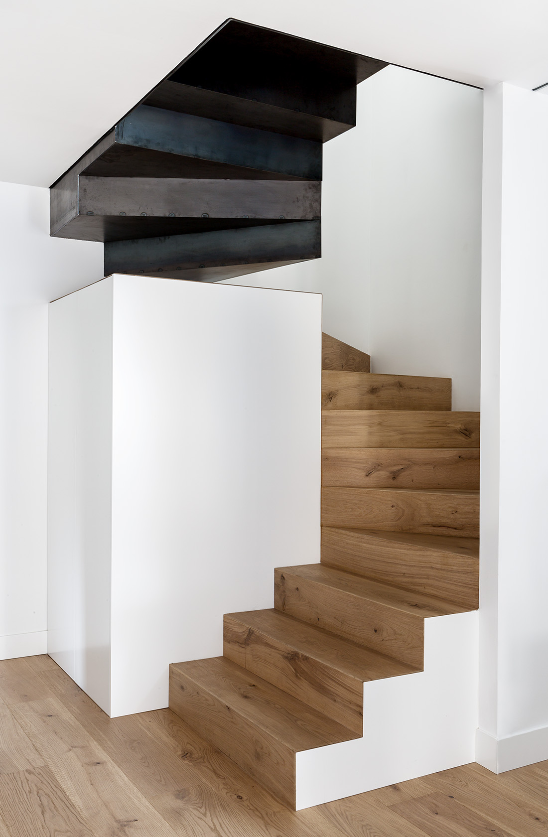 El elemento de la escalera, eje del proyecto y de la distribución de vivienda, se comprime mediante una formalización de caracol consiguiendo liberar el espacio de la entrada, que antes invadía. Se constituye por dos elementos: Un bloque macizo continuo con el suelo, que se encastra en la esquina de planta baja, contenedor de instalaciones y almacenamiento, y un elemento muy ligero, de chapa, en el último tramo.