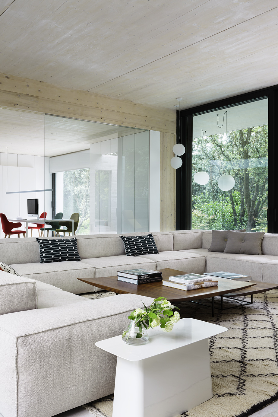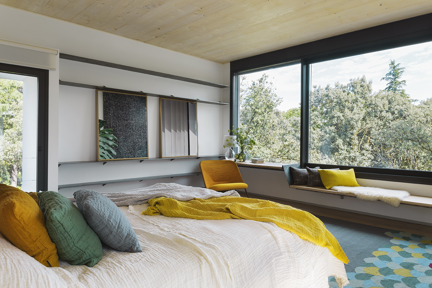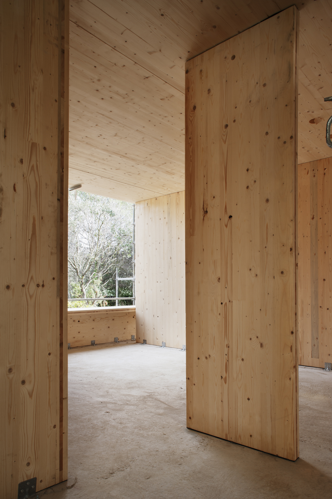 The construction used is based on a solid timber structure assembled with 12cm-thick structural walls which have the advantage of not requiring any columns nor any other visual interruptions.The floor slabs also achieve great spans with little thickness and do not interfere with the architecture. These are prefabricated, customised units with a numerical control which provide a perfect assembly on site whilst achieving very high energy efficiency levels for the dwelling). The exposed structural timber in some internal areas also adds a feeling of warmth and comfort.