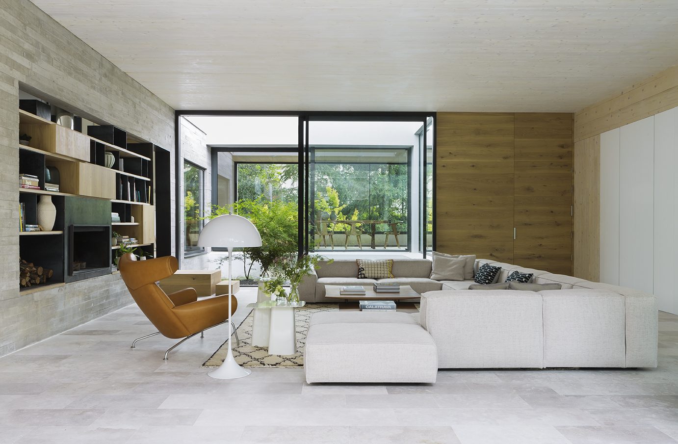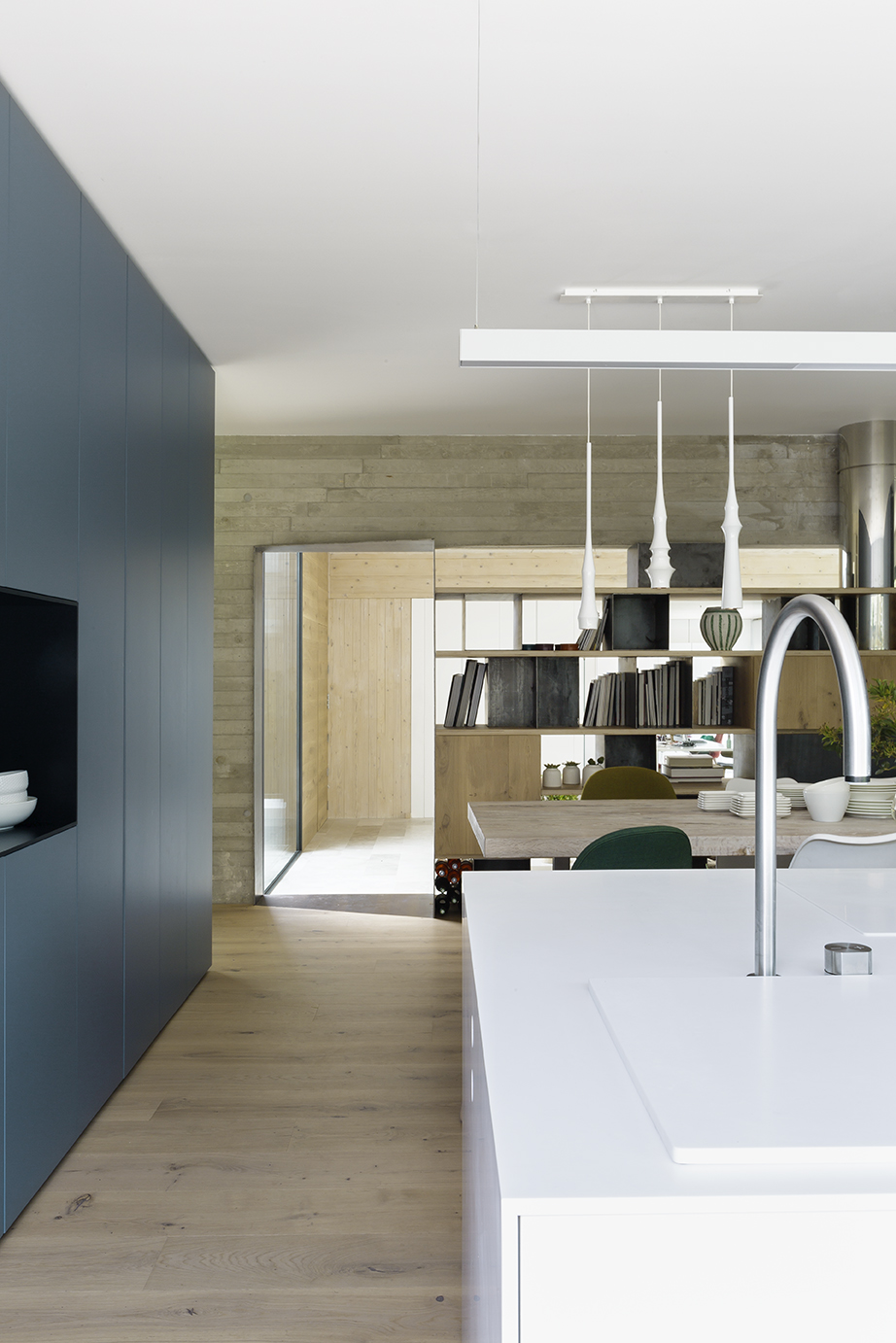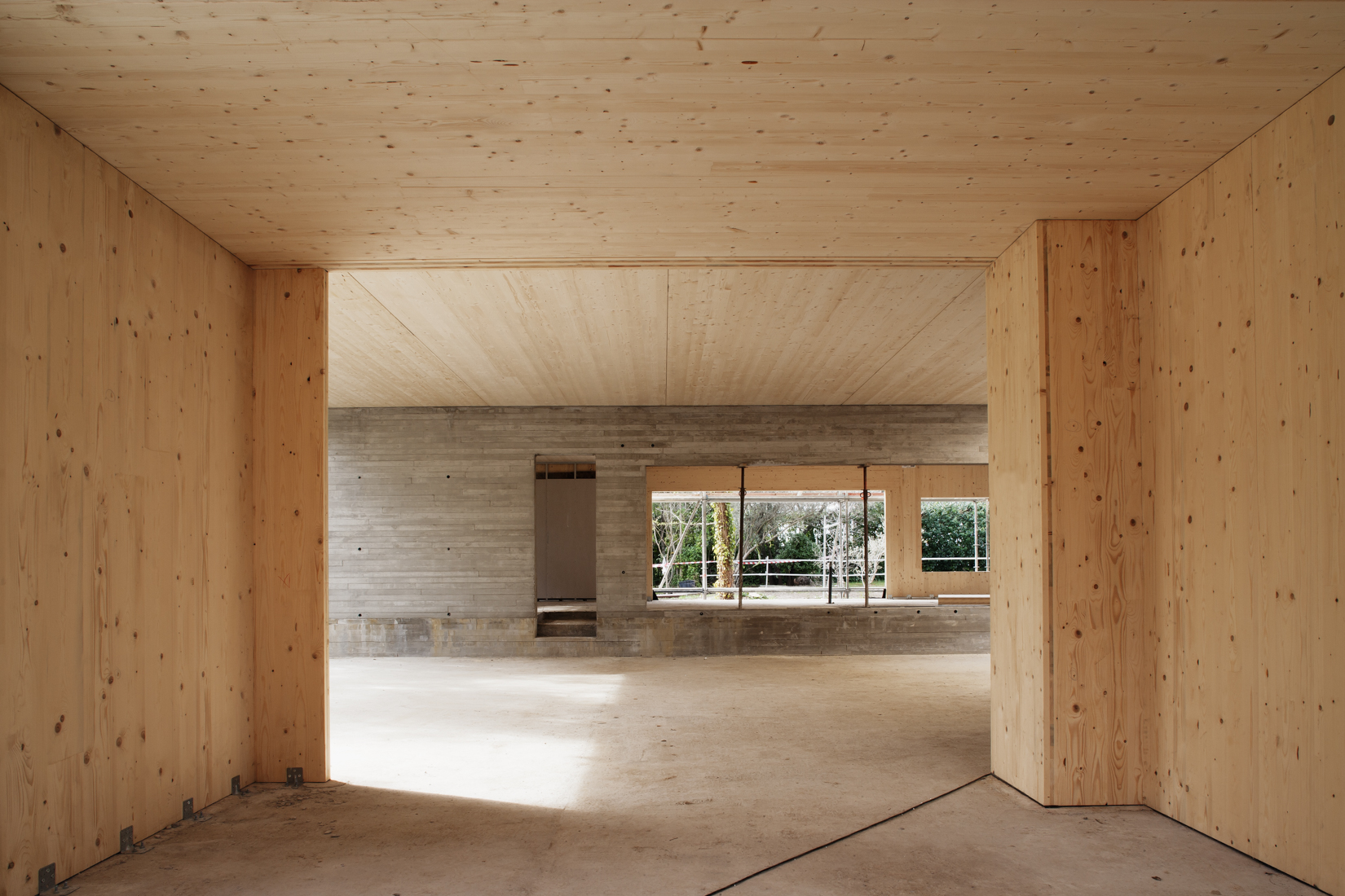 The construction used is based on a solid timber structure assembled with 12cm-thick structural walls which have the advantage of not requiring any columns nor any other visual interruptions.The floor slabs also achieve great spans with little thickness and do not interfere with the architecture. These are prefabricated, customised units with a numerical control which provide a perfect assembly on site whilst achieving very high energy efficiency levels for the dwelling). The exposed structural timber in some internal areas also adds a feeling of warmth and comfort.