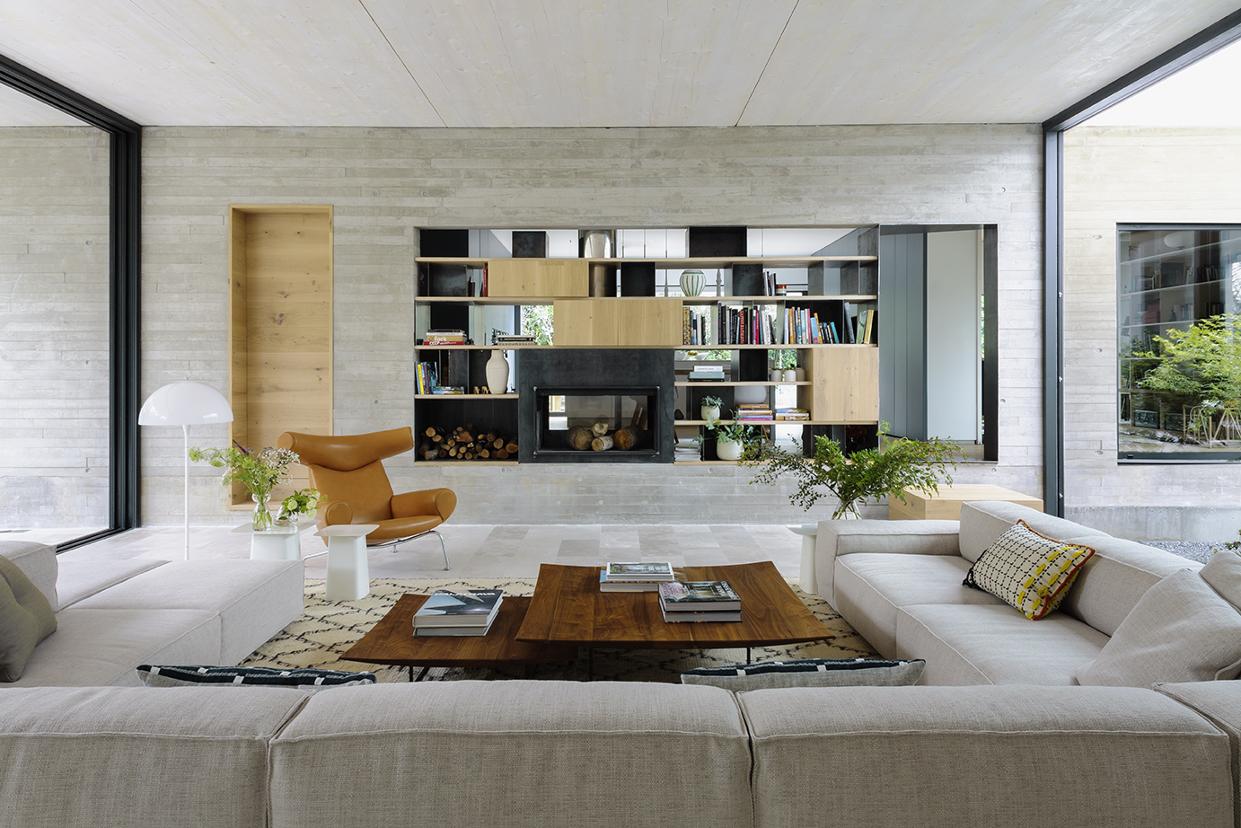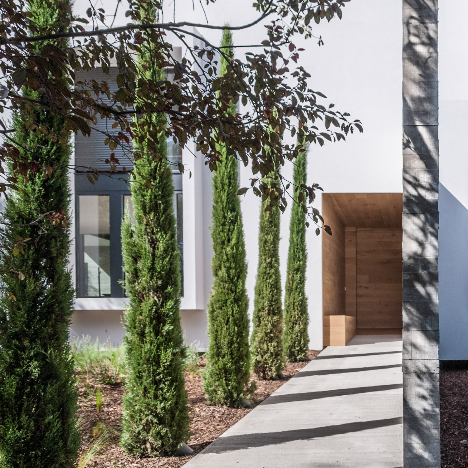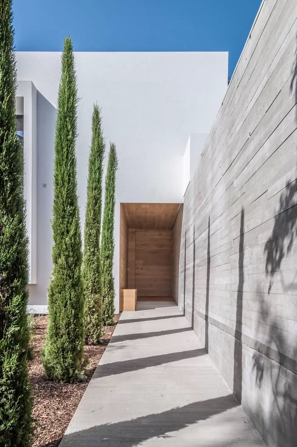 The house follows from the intersection of two exposed structural concrete walls cast in timber-board formwork. One wall leads to the entrance, generating an exterior path between the wall itself and a line of cypress trees while the other wall divides the kitchen and living areas and also extends outdoors into the open porch. The design of the dwelling follows from these two walls by adding different volumes which generate an internal central patio, a central feature of the house which provides a sequence of indoor-outdoor spaces that flow from the porch to the living room, patio to the dining room, and onwards to the outside.