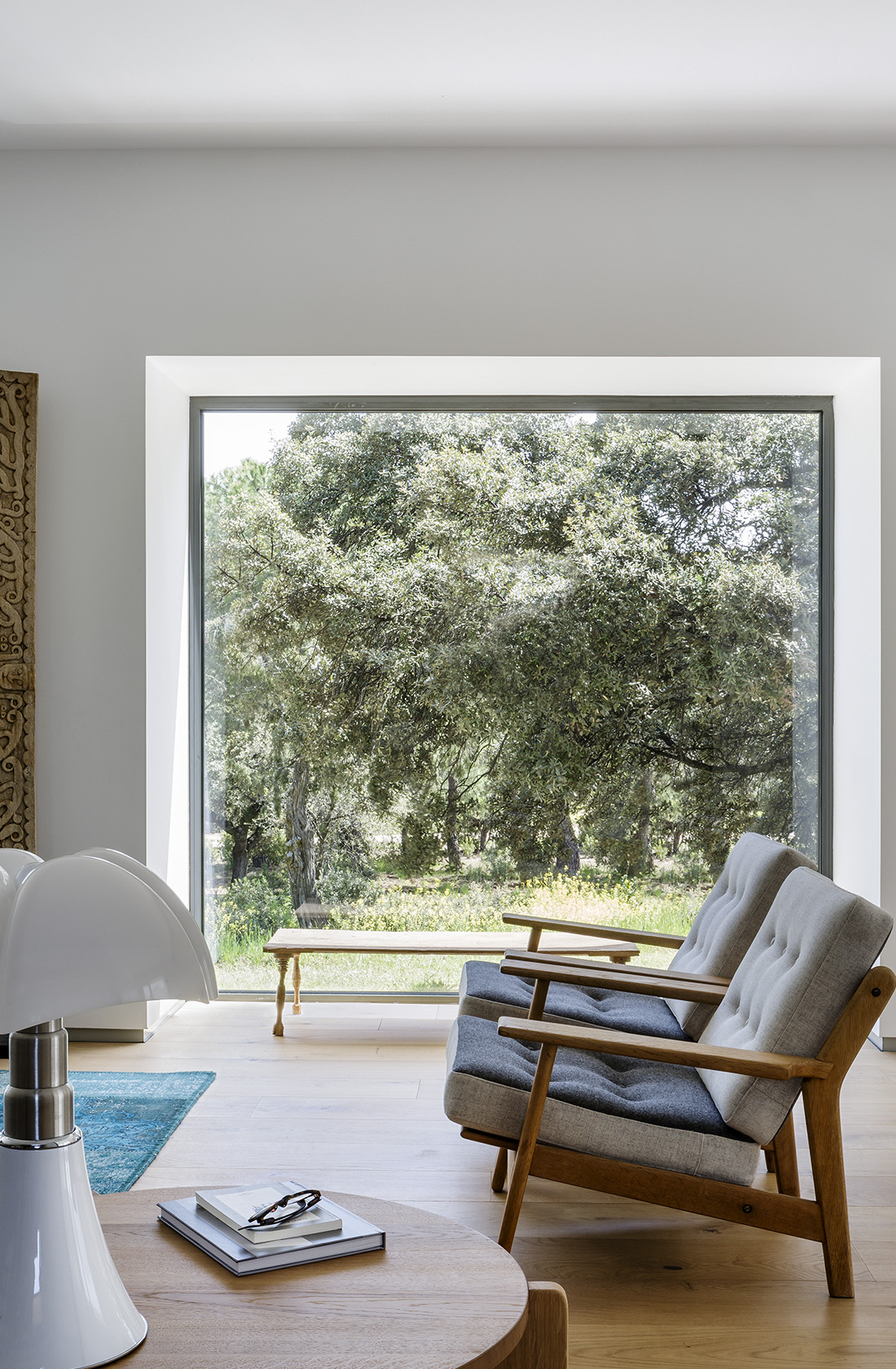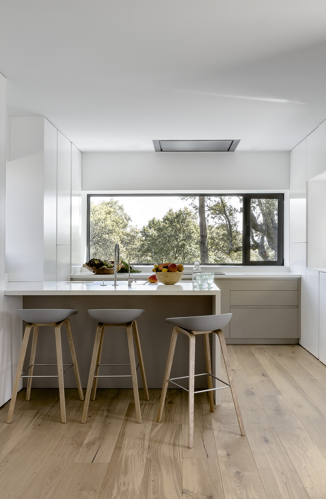 The ground floor is an open and versatile space. Two large sliding walls allow the owners to share the space in a unique huge or to separate rooms with different uses when required: kitchen – living room – study/guest room. The kitchen window focuses on the beautiful mountains rising behind a horizon of holm oak tops. The large window of the living room opens the views to the park t the south while the window of the study is focused on enjoying the large oak tree in that side.