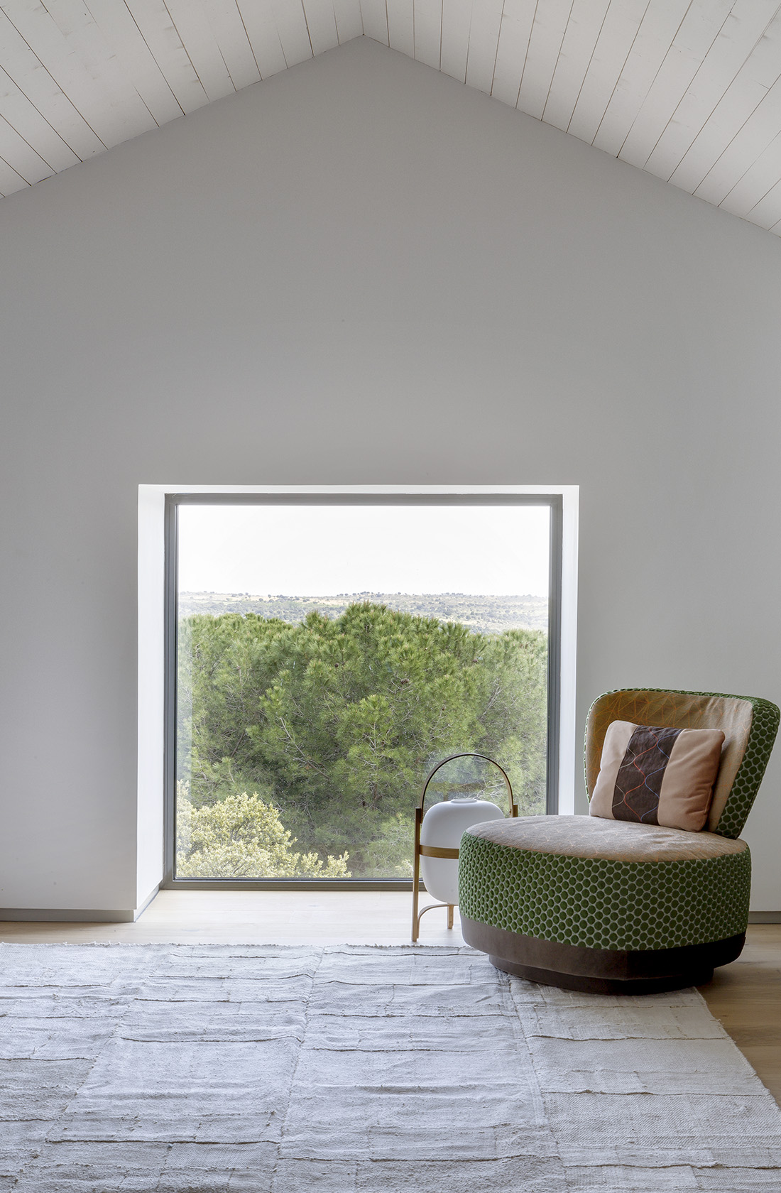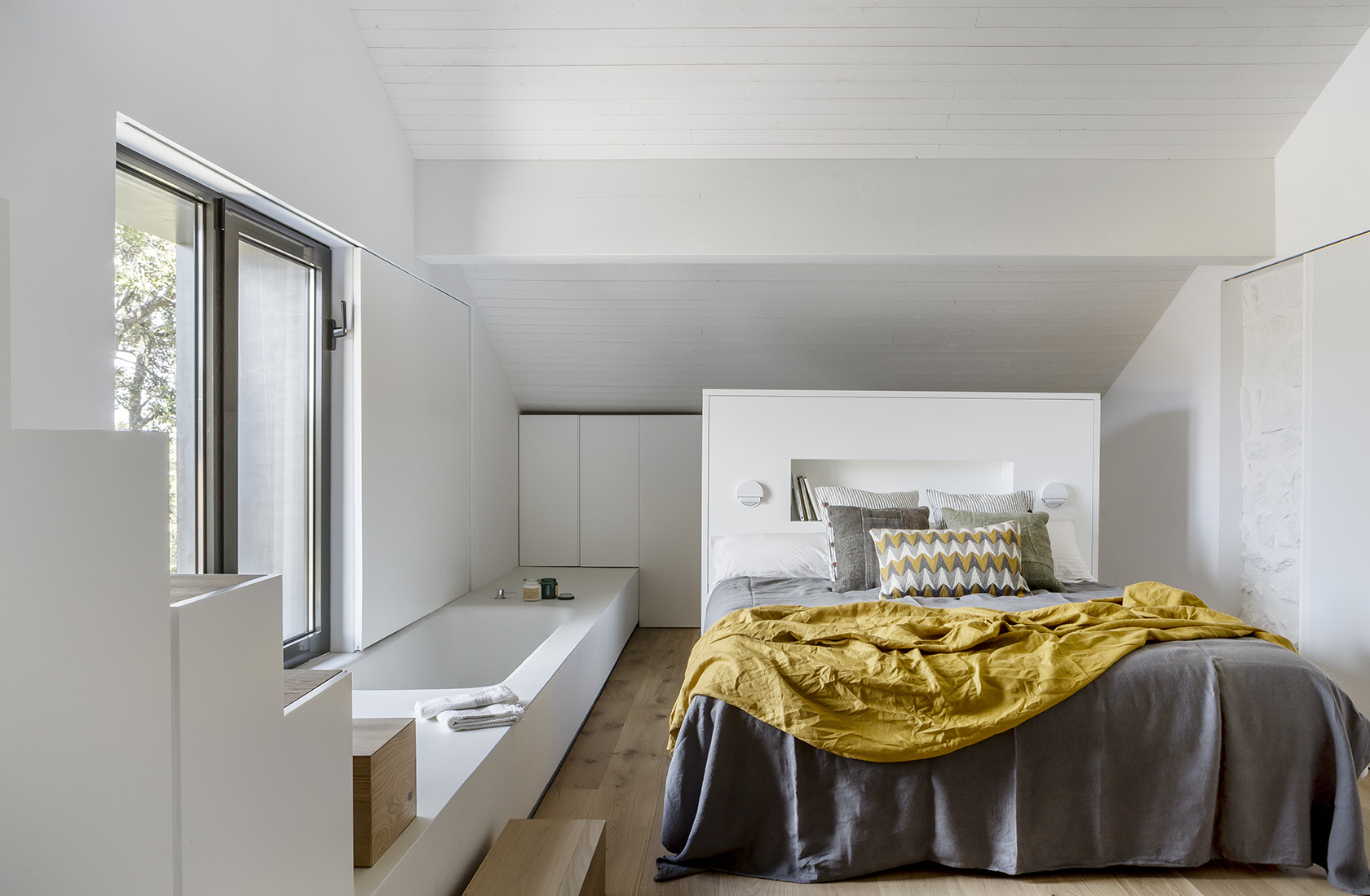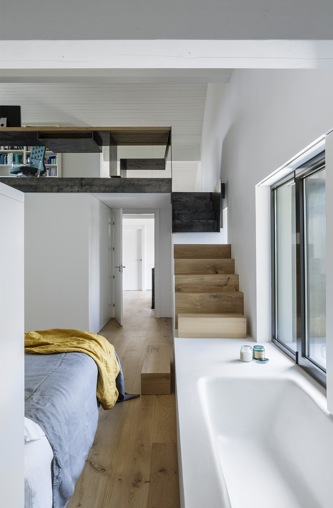 The master bedroom is divided into two floors connected with each other by the iron stairs that starts at a pedestal by the bathtub. The door to the bathroom and the shutter are made of wood. The original granite walls of the house can be discovered behind them. In the highest floor, the square window that frames the horizon towards Madrid is the center of a peaceful retreat room for parents.