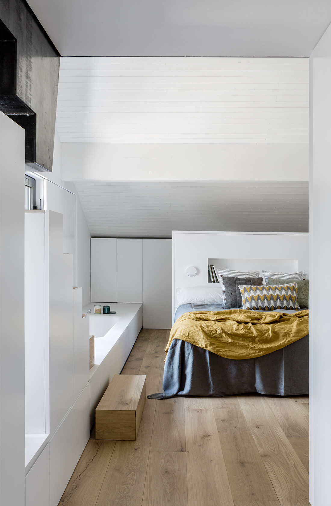 In the guest house, the spaces are positioned around a special closet. This is, at the same time, kitchen, wall, staircase and bed headboard, as well as structure support for the top floor penthouse. One single element acting as the main character in the layout of the house.