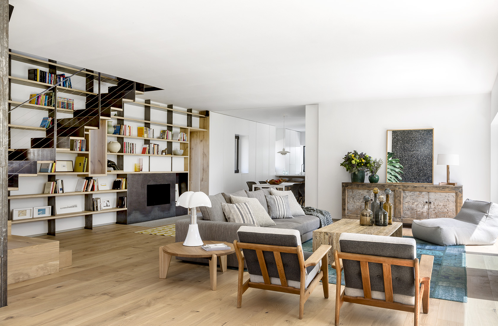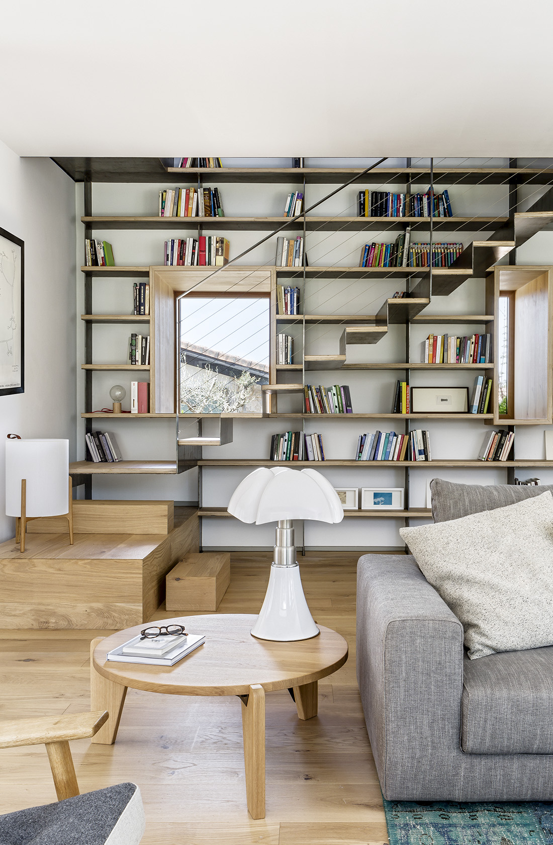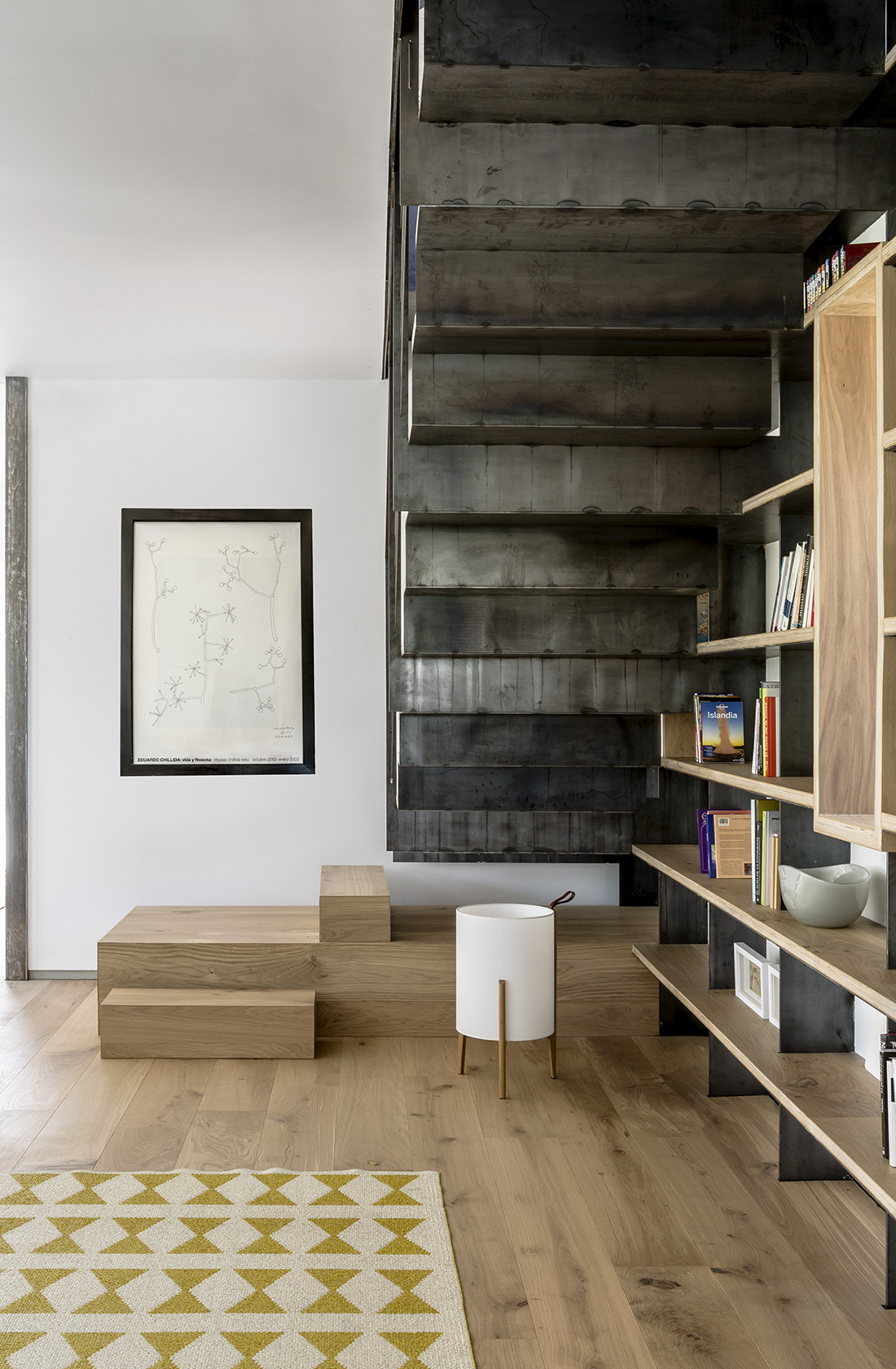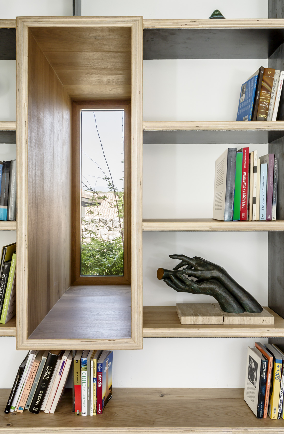 Within the perforated stone mass, the space has been distributed through an independent structure with three floors that merge through a continuous space. The bookshelf-staircase is the central part of the house and represents the essence of the house in which the structure becomes the finish, the windows become part of the rooms and the three floors merge in only one common space.