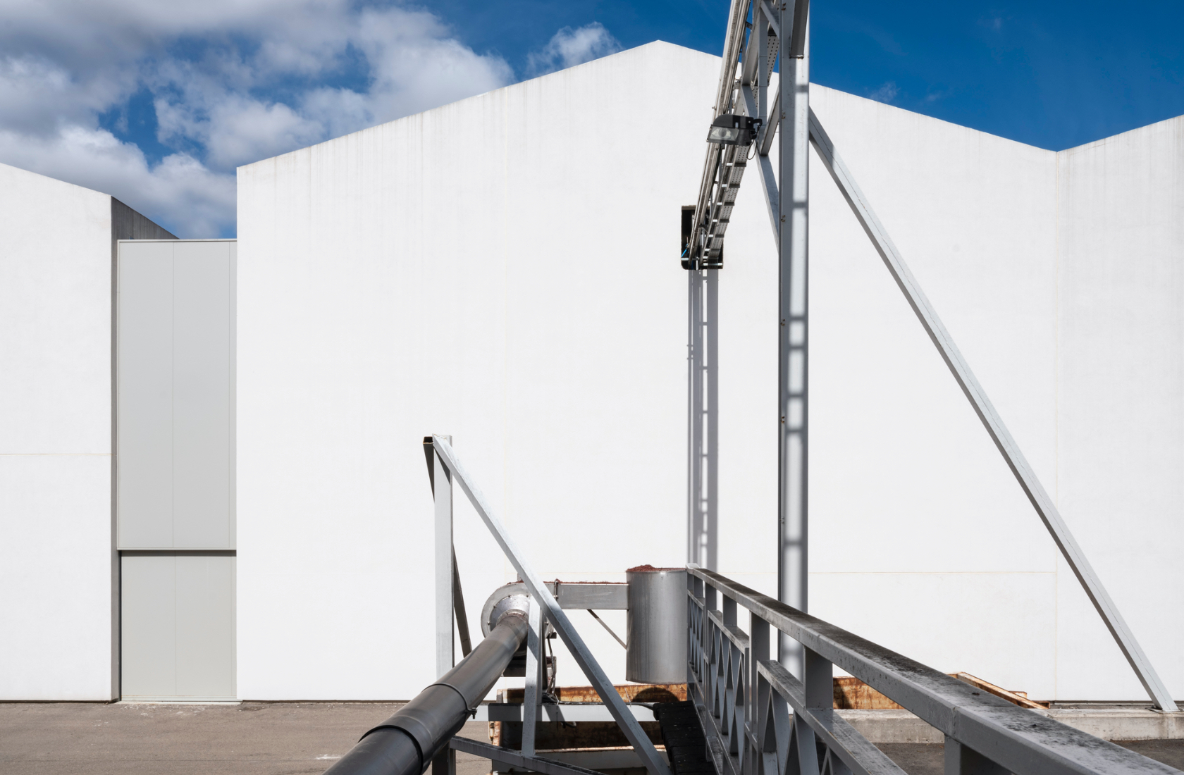 Para conectar las naves blancas, entre sí y con las edificaciones existentes, ÁBATON recurrió a filtros, es decir, a espacios construidos que conectan las diferentes piezas y acogen las instalaciones, pasarelas, almacenes, servicios, muelles de carga, oficinas, etc. Los filtros adquieren distintas materialidades, metálicos y brillantes entre las naves, y de hormigón mate en el contacto con los edificios existentes.