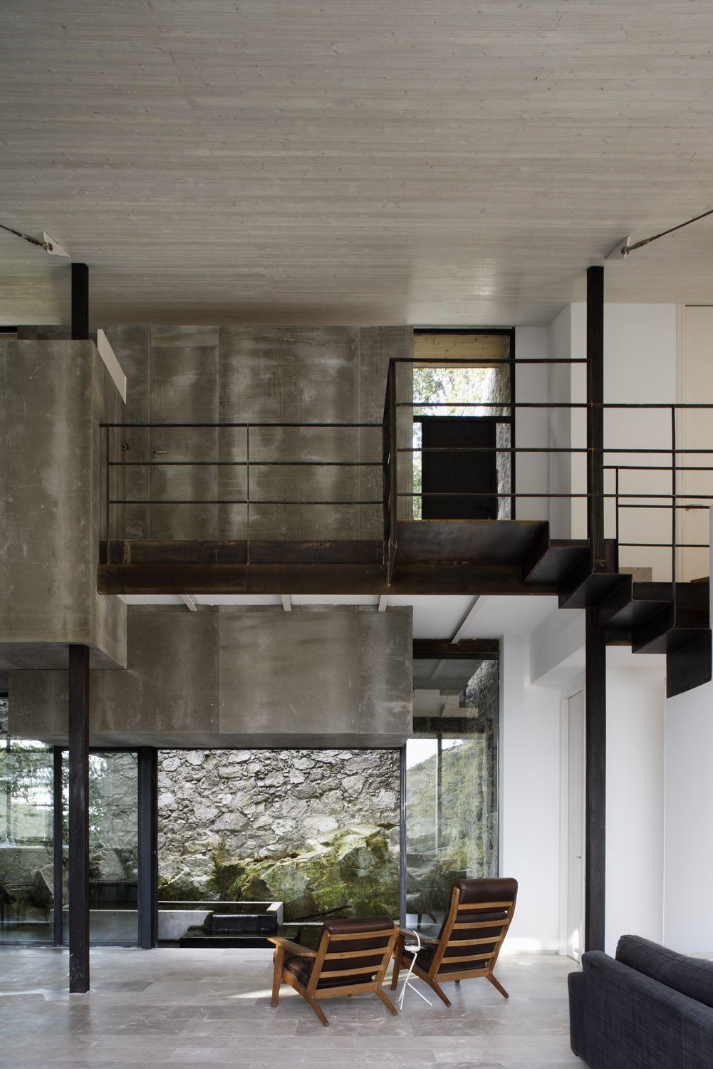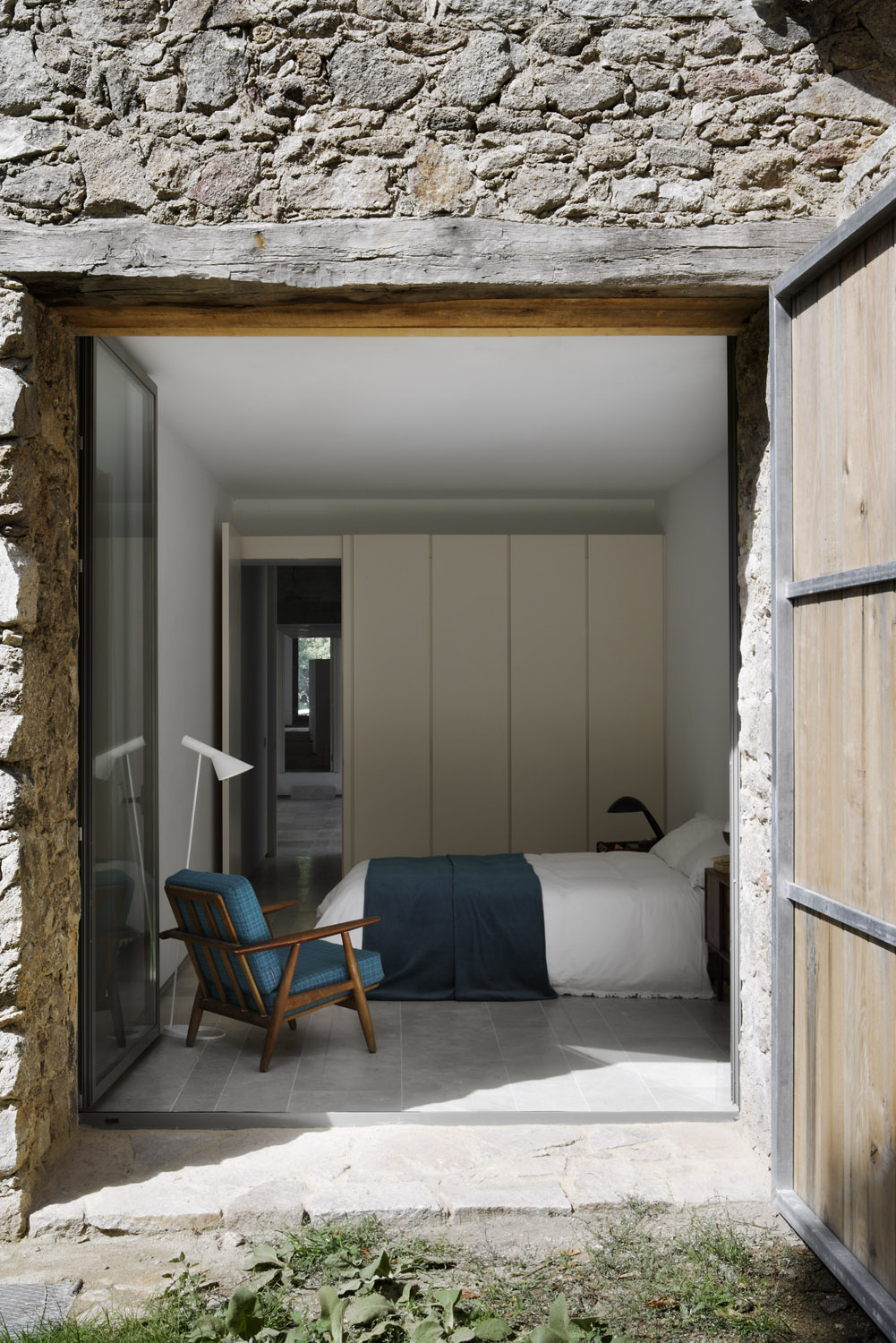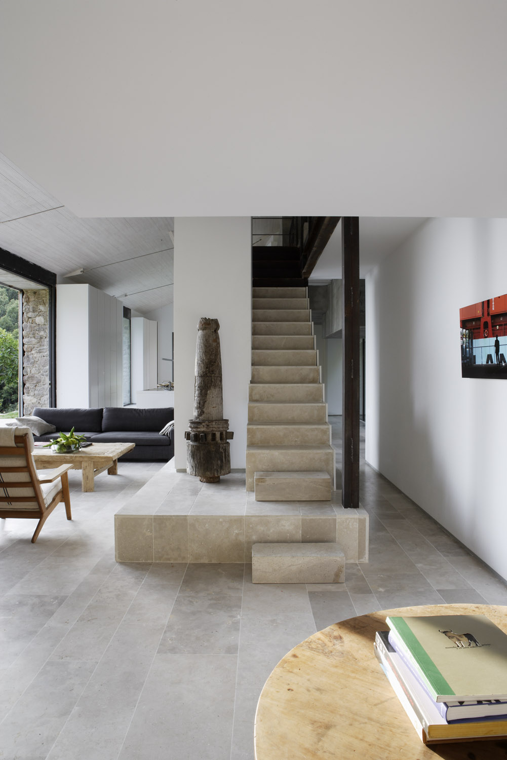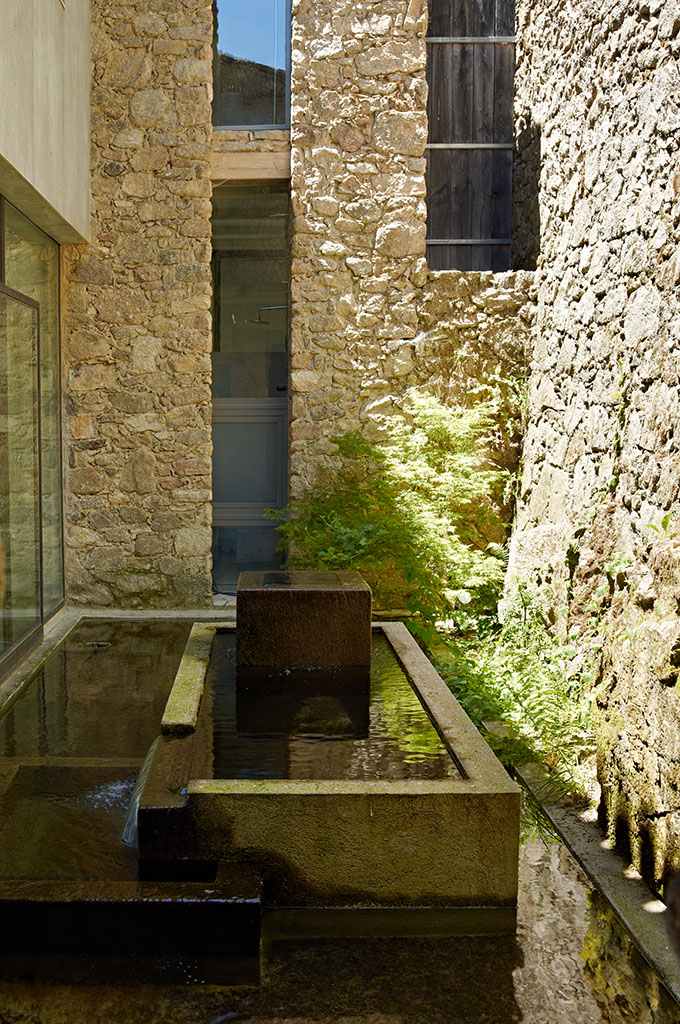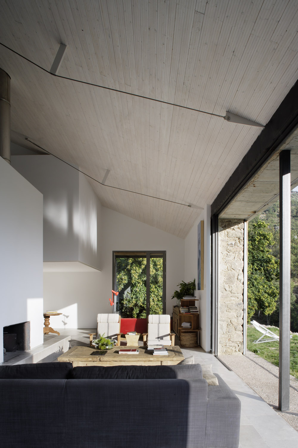 Se construye un gran espacio central para el salón y la cocina, alrededor del cual se ordenan las distintas piezas destinadas a habitaciones. Se trabajan materiales básicos: agua, hierro, cemento y la piedra existente; se aligera el interior sustituyendo los muros de carga por ligeros pilares metálicos. En el patio se construye una fuente donde, de manera natural, brota el agua de una roca contribuyendo a refrescar la vivienda en los meses más cálidos. El espacio central se abre completamente norte-sur para potenciar las vistas al valle y la sensación de vivir en el exterior.