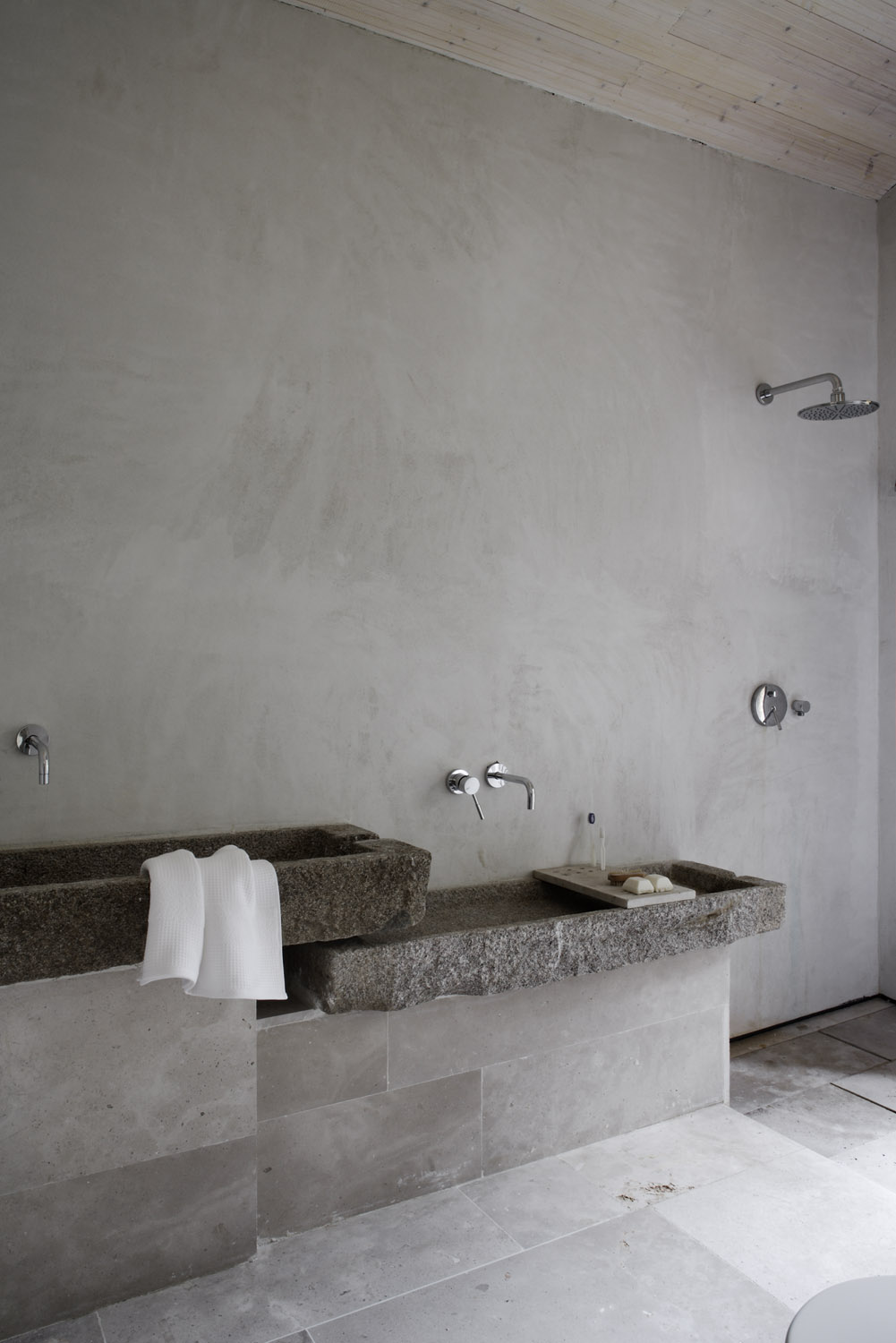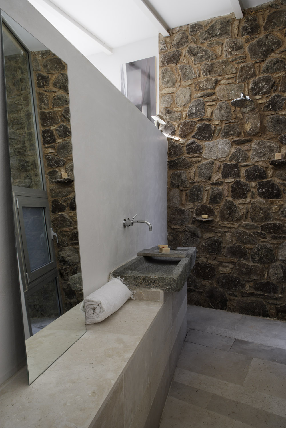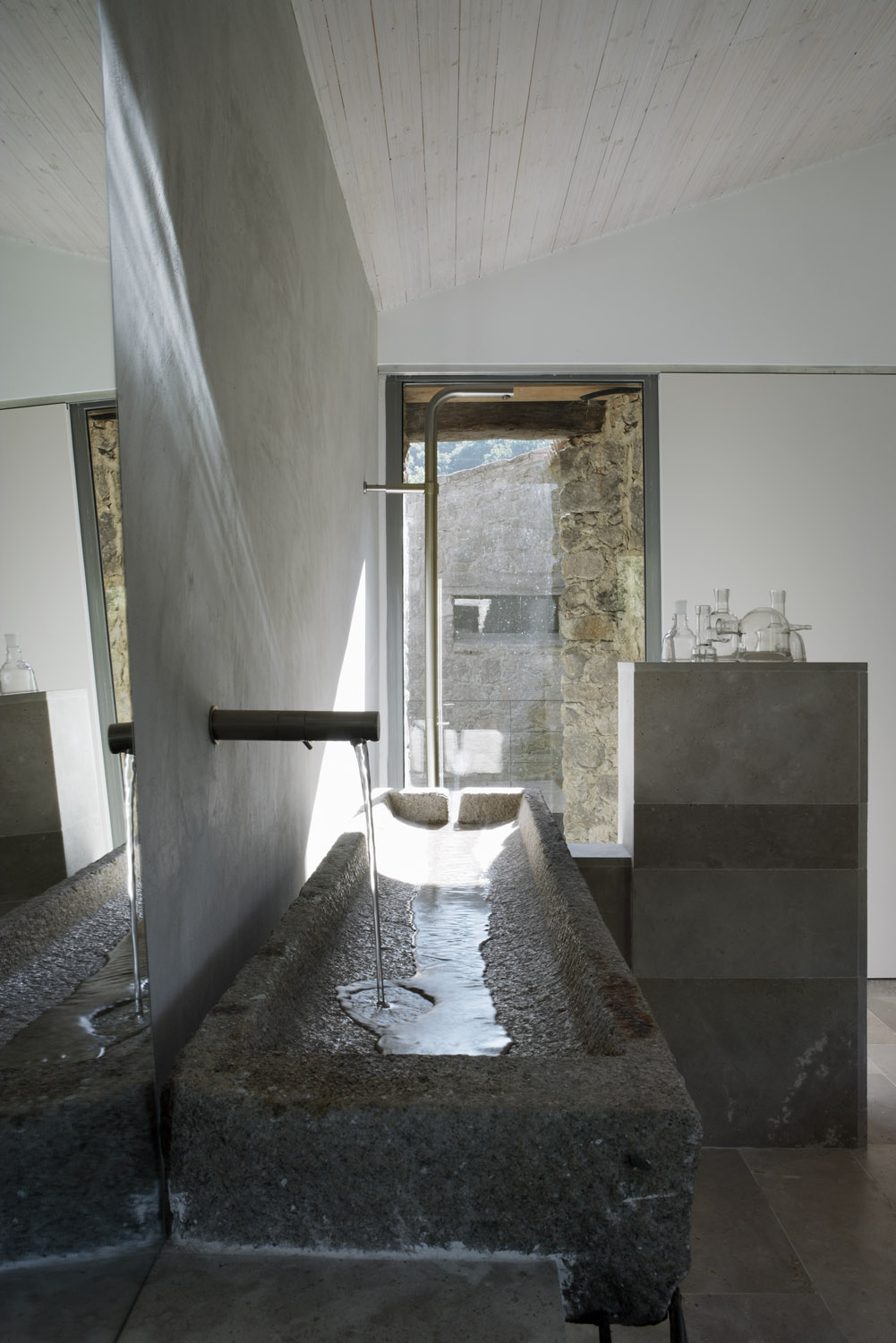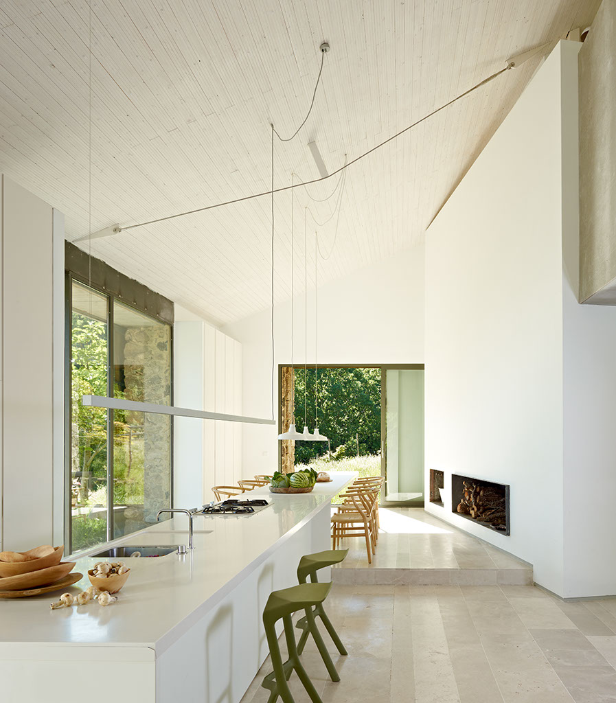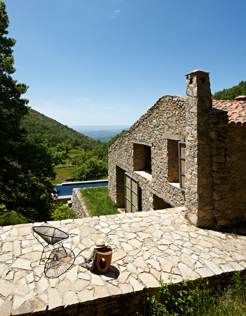 Se construye un gran espacio central para el salón y la cocina, alrededor del cual se ordenan las distintas piezas destinadas a habitaciones. Se trabajan materiales básicos: agua, hierro, cemento y la piedra existente; se aligera el interior sustituyendo los muros de carga por ligeros pilares metálicos. En el patio se construye una fuente donde, de manera natural, brota el agua de una roca contribuyendo a refrescar la vivienda en los meses más cálidos. El espacio central se abre completamente norte-sur para potenciar las vistas al valle y la sensación de vivir en el exterior.