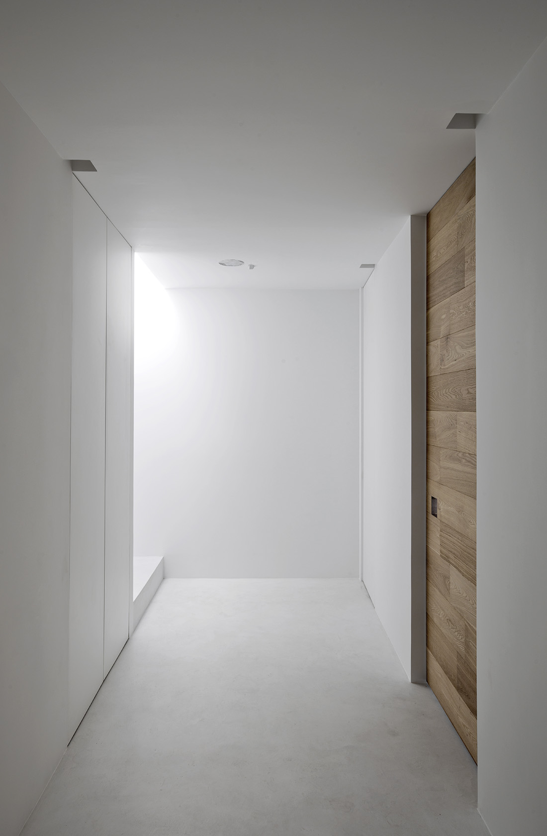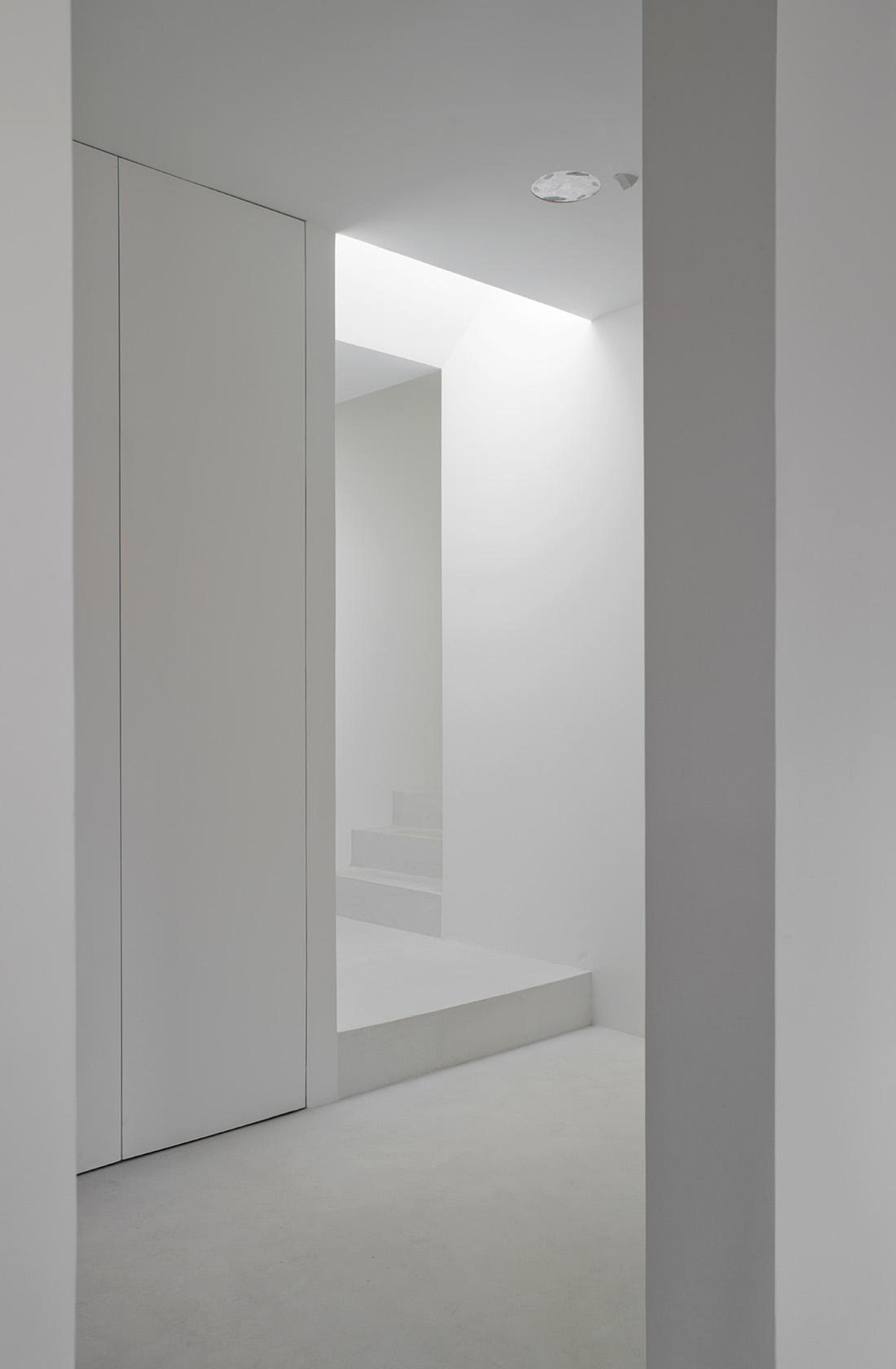 To connect the two floors, the entrance hall, the corridor and the master bedroom at the 6th floor area are also designed in the modern minimalistic way. Once entering the apartment the modern ambiance invites you and a skylight admits natural light to enter in the centre of the apartment and it also leads to the upper floor. To create a union the white colour is used for everything like walls, ceilings, floors and doors.