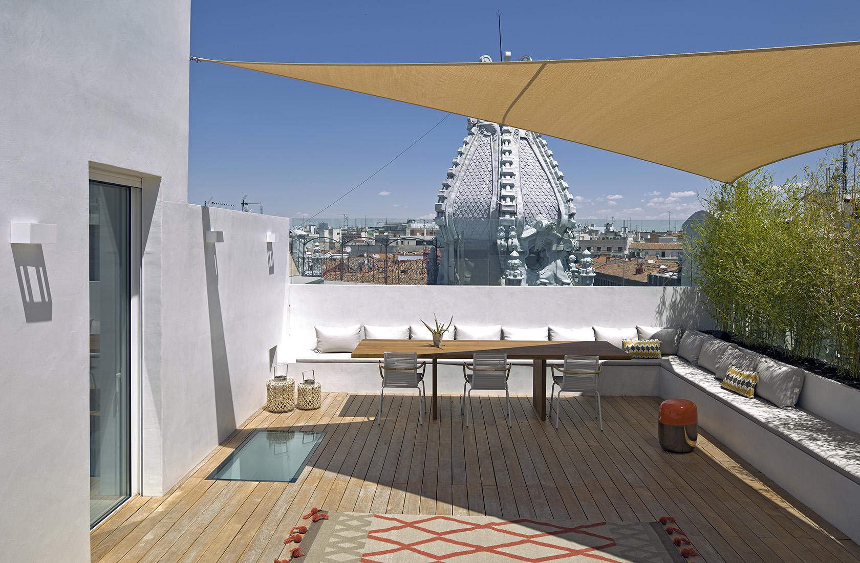 at the upper floor, the 7th floor, there was a unused attic, whiteout any tradition, but which offered the great potential to be used as the main living space, with direct access to the roof terrace. The concept attempts to connect the two floors and to join the tradition with the modern spirit to gain a union.