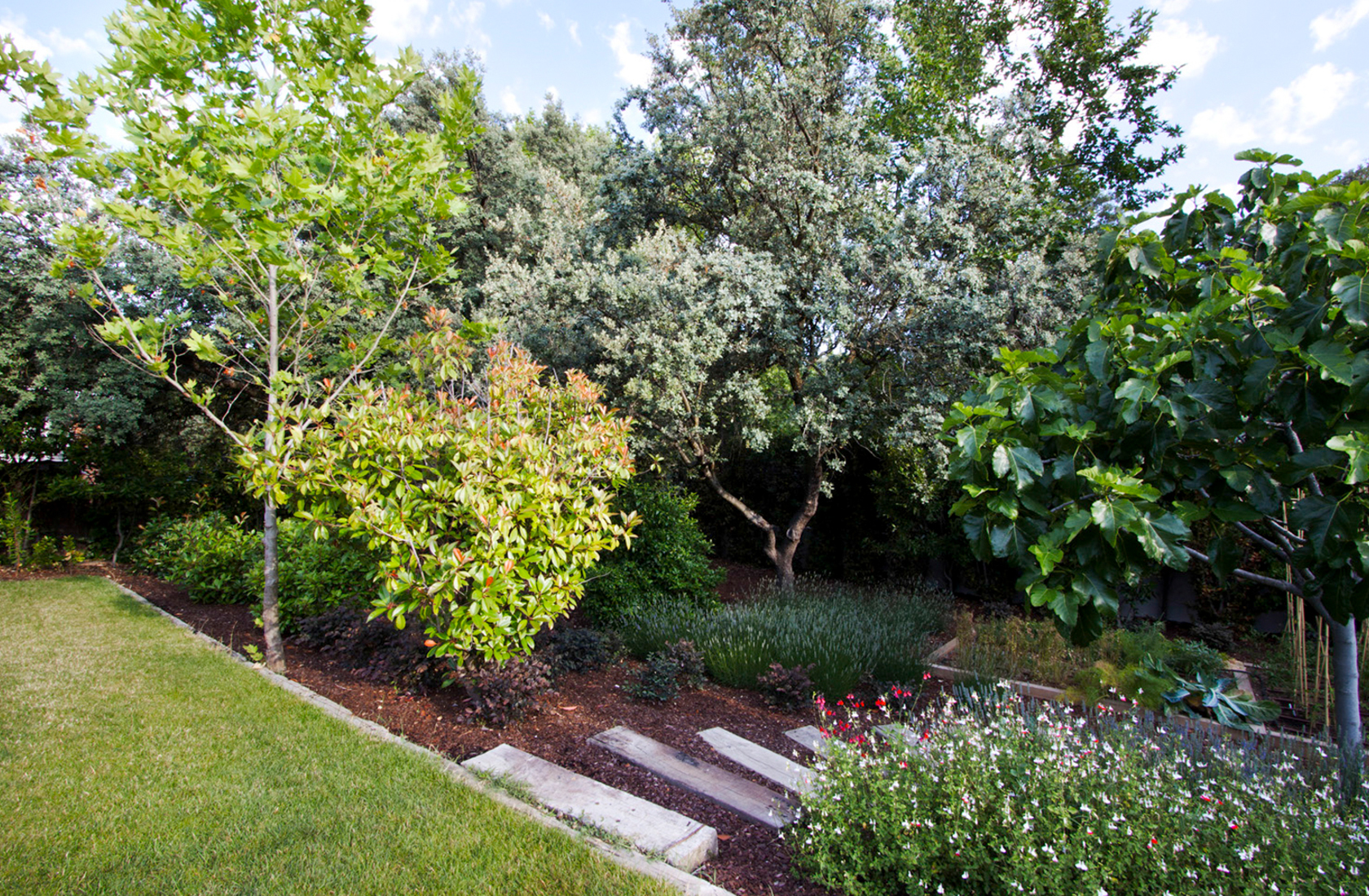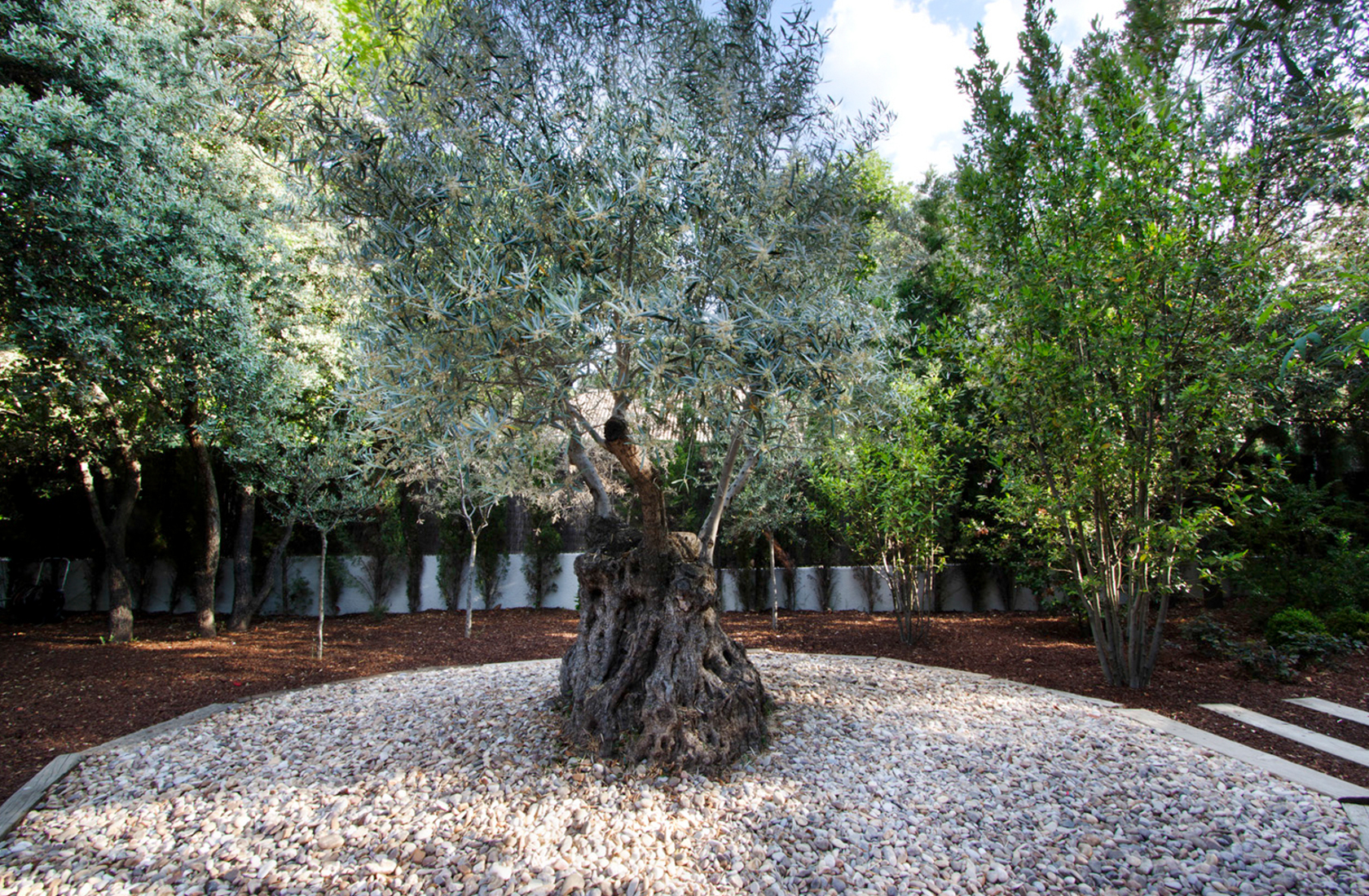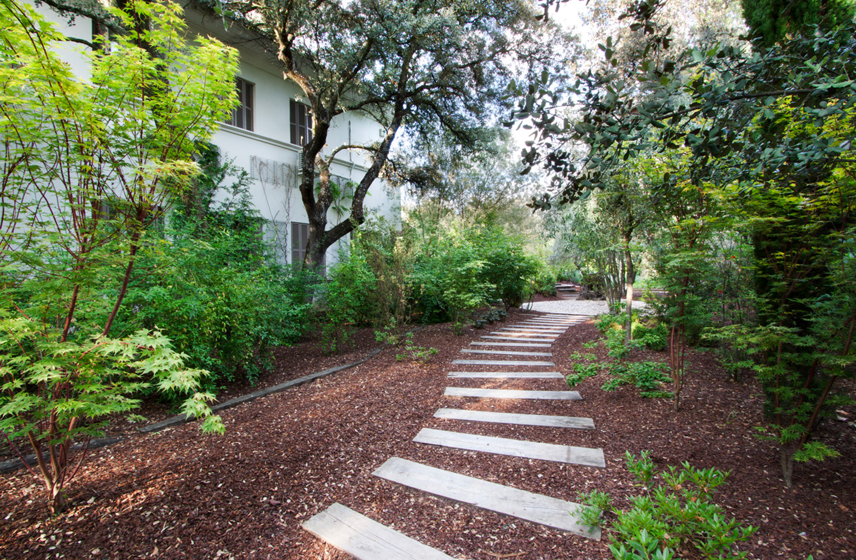 El objetivo fue organizar las plantaciones de la entrada a base de flores blancas (salvia y azaleas) y uno de los accesos laterales, que se rediseñó en forma de camino peatonal serpenteante con especies japonesas de hoja roja y amarilla, y azaleas rosas y rojas.