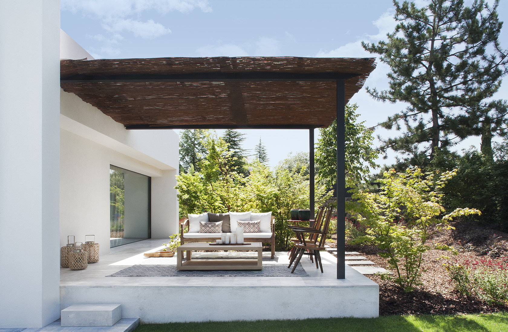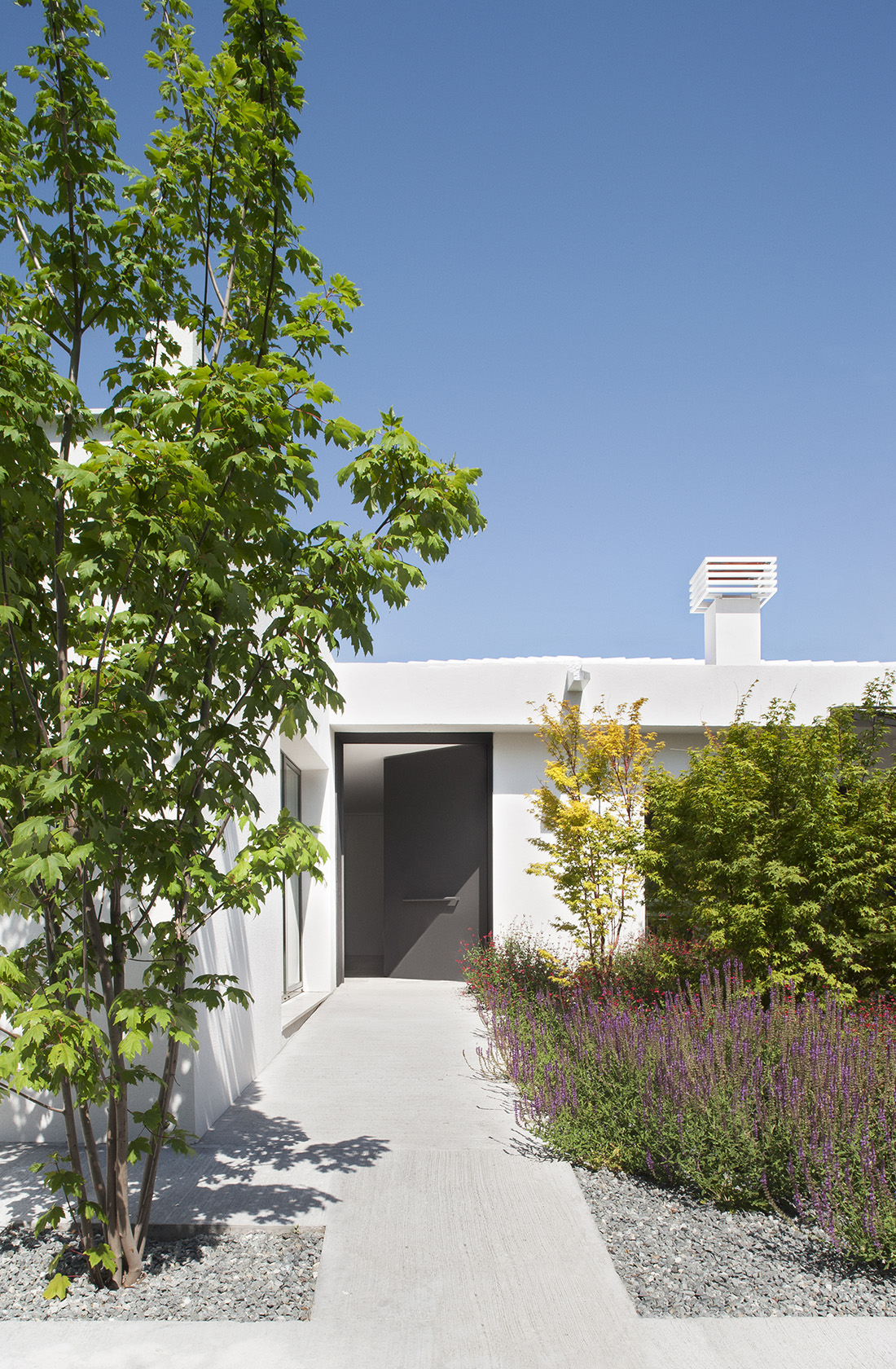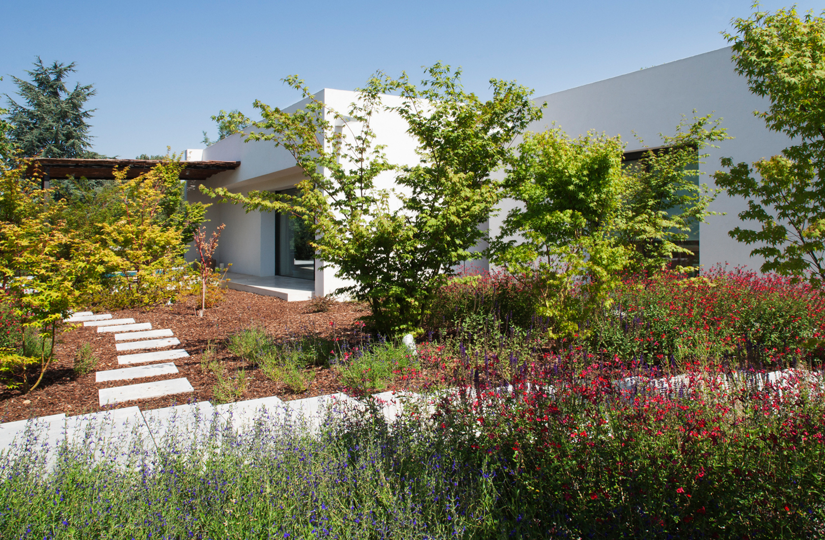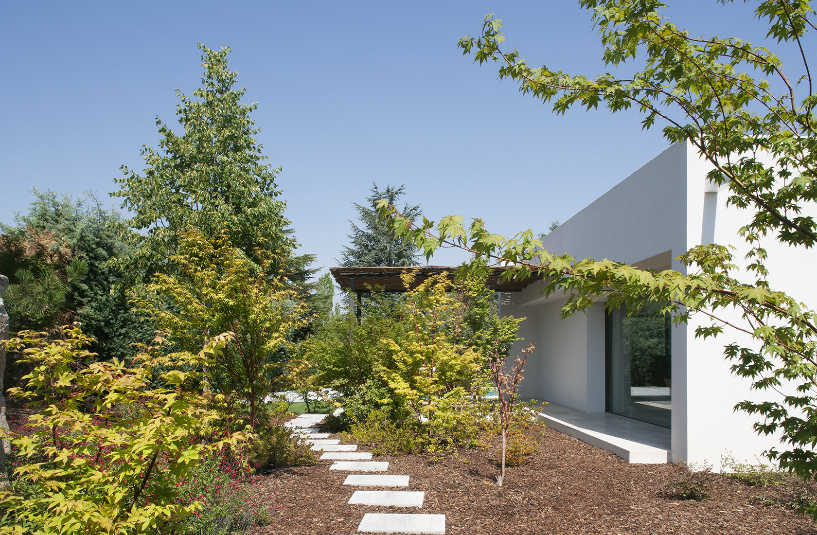 En partes de la casa en las que la arquitectura abre grandes ventanales al jardín, hay plantadas variedades de arces japoneses que en primavera tienen verdes claros y en otoño cambian a tonos desde el amarillo intenso al rojo vivo, como los acer palmatum ‘sango kaku’ y acer palmatum ‘osakazuki’. Unas buenas compañeras de los arces japoneses son las azaleas, que al principio de la primavera tienen una floración explosiva en las zonas de sombra del jardín y las variedades de hoja perenne y brillante como la ‘hino crimson’ mantienen la hoja durante todo el invierno.
