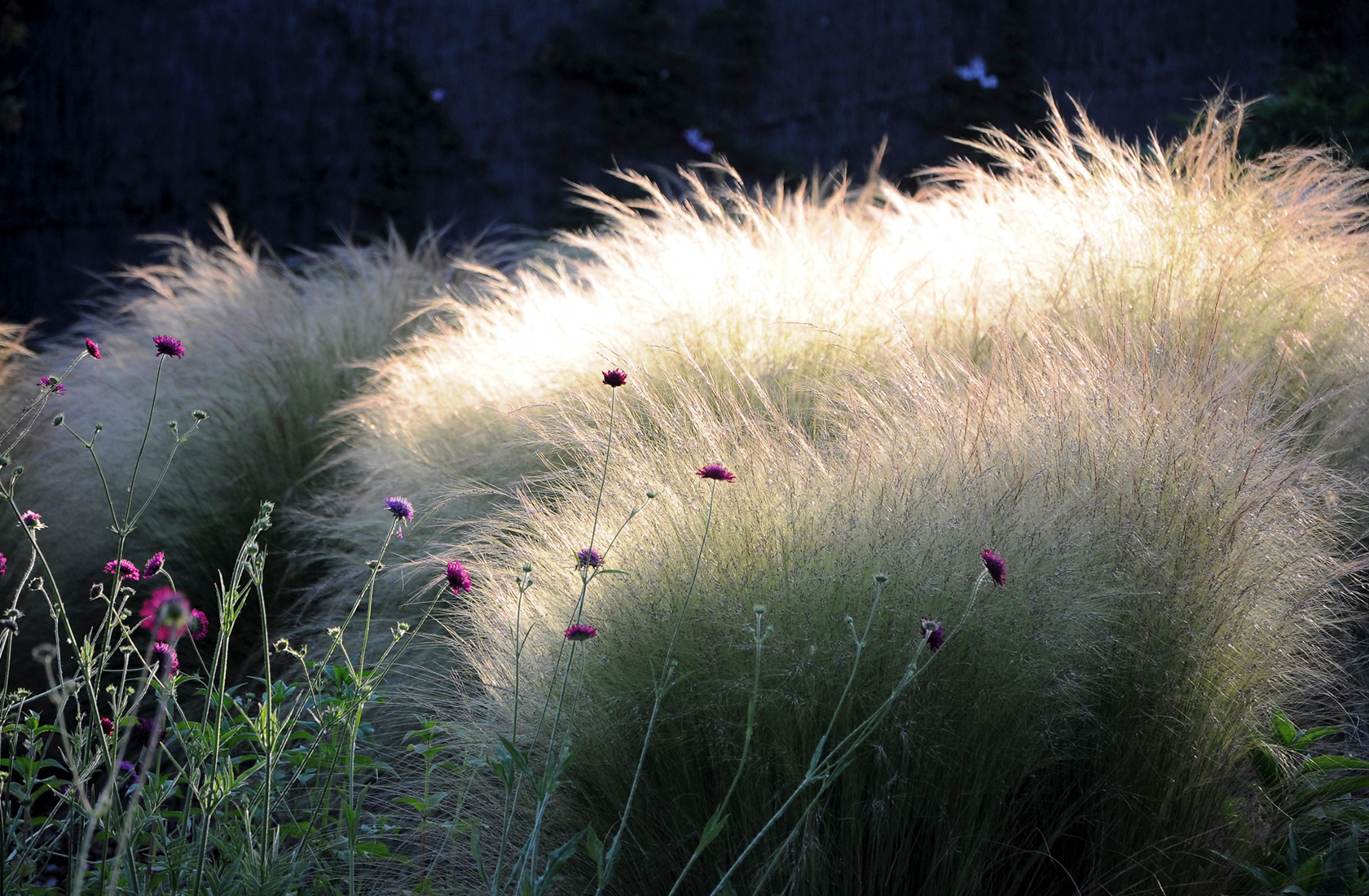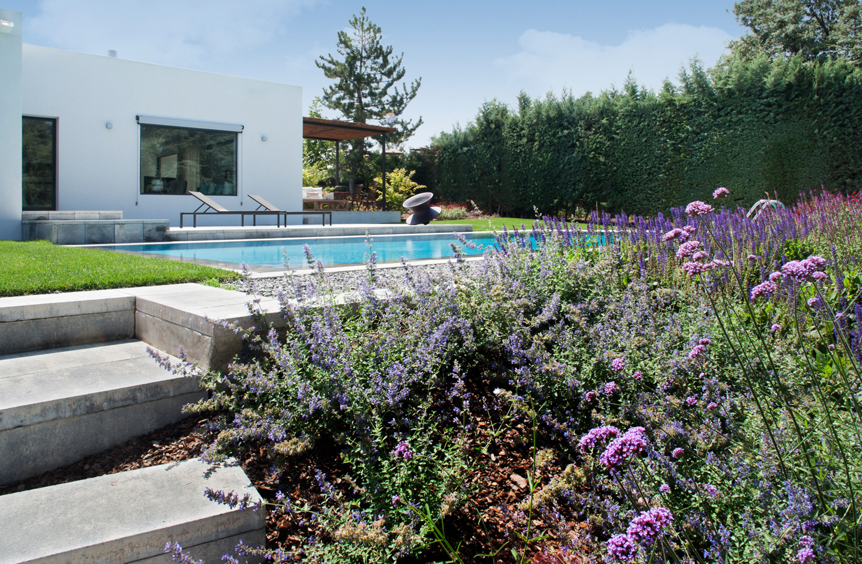 Las zona de la piscina mantiene su alegría incluso pasado el verano, rodeándose de grandes masas de gauras rosas, moteadas por los morados de las flores altas de las verbenas bonariensis.