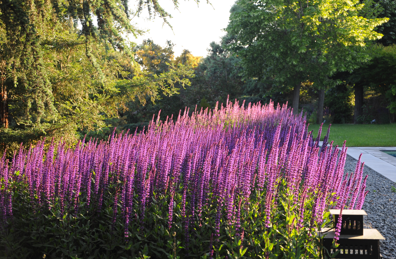 Las salvias ‘royal bumble’ y ‘blue note’ permanecen en flor desde el mes de abril, acompañando los colores cambiantes de los arces japoneses. En el diseño se cuida mucho la armonía de especies, combinando las vivaces en función de su altura, periodo de floración y color, dando masas de arbustos con texturas uniformes que bordean los caminos de entrada a las casas y hacen muy agradables los paseos diarios por los senderos del jardín.