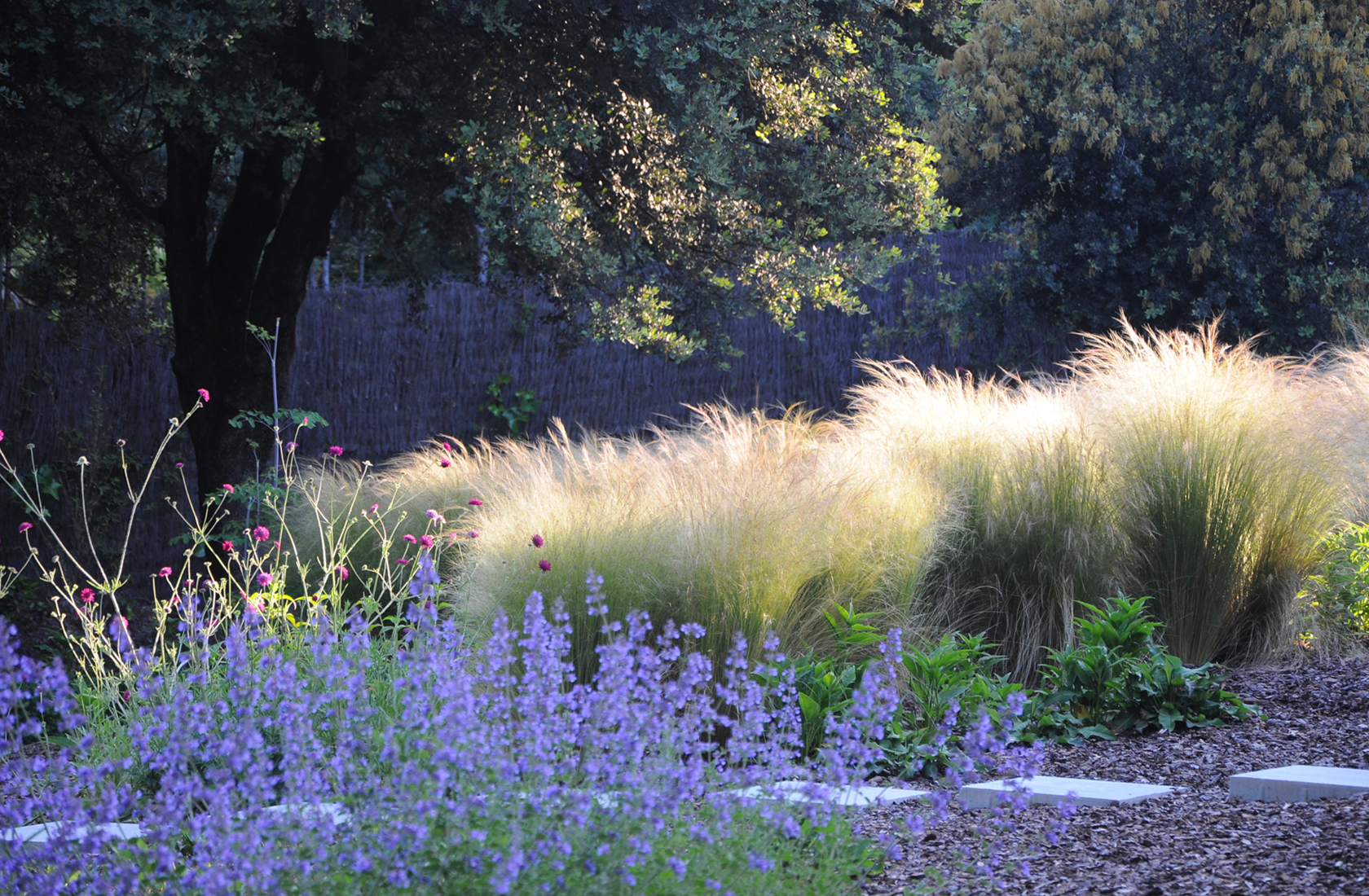 También se reservan zonas para el descanso y la lectura. Alejadas de la casa y a la sombra de grandes encinas, se diseñan terrazas entre las verbenas bonariensis, agastaches, persicarias y monaras haciendo que tengas la sensación de estar en medio del campo en primavera.