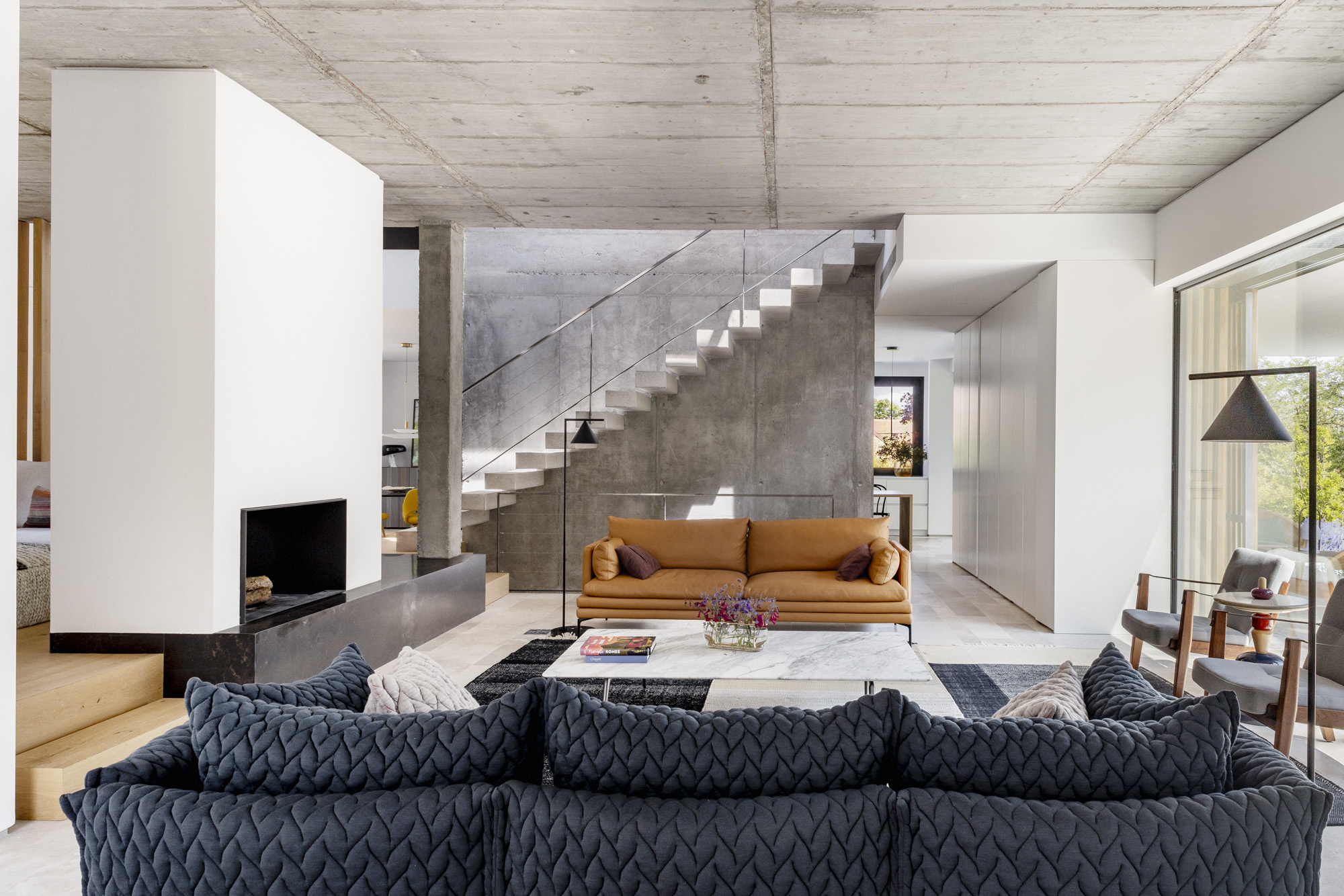 El acceso principal, guiado por un sendero bordeado por vegetación, conduce al espacio principal de la casa. Con una doble altura, este espacio está presidido por la escalera, diseñada con una volumetría escultórica que añade personalidad y carácter y ejerce como unión de los espacios.