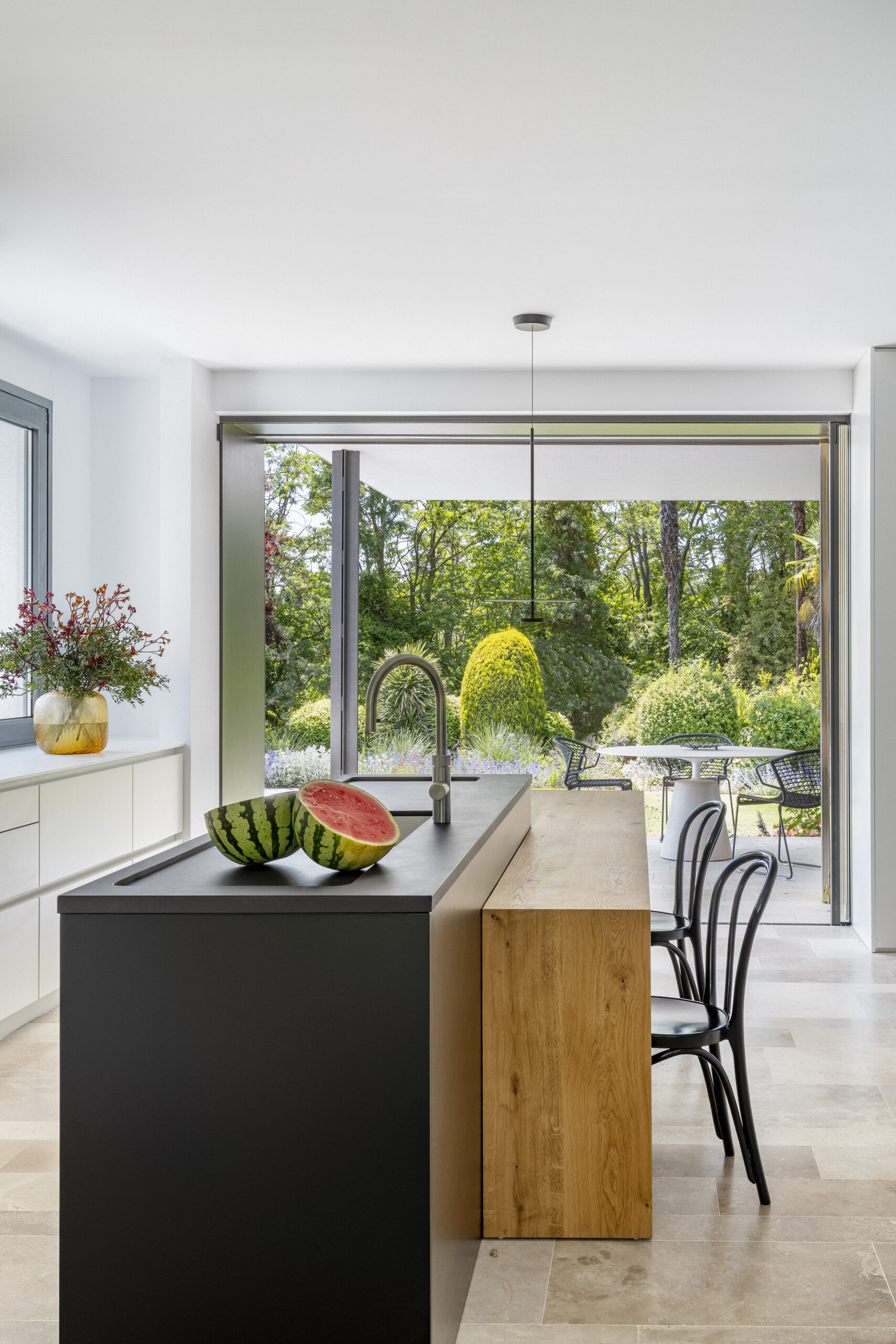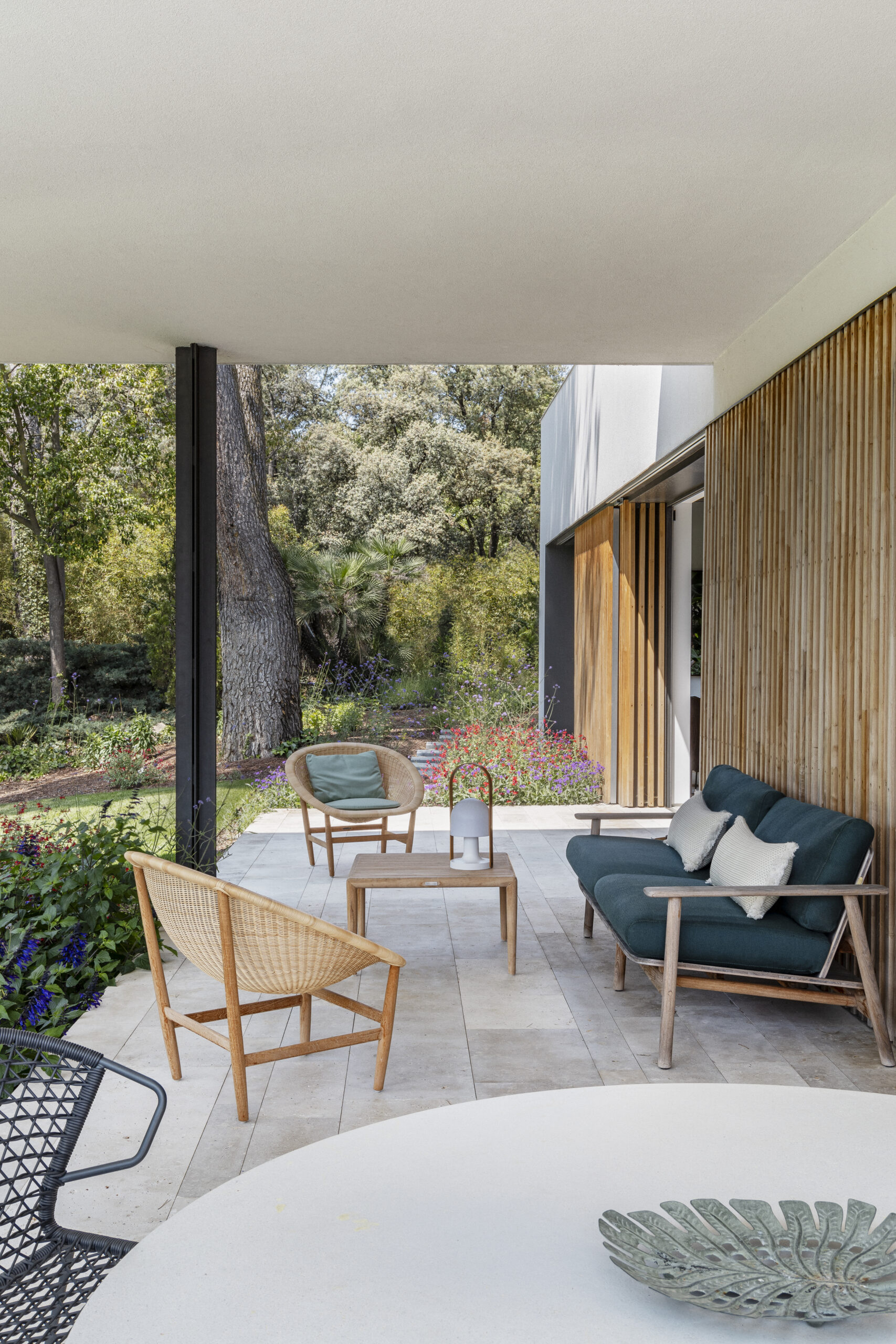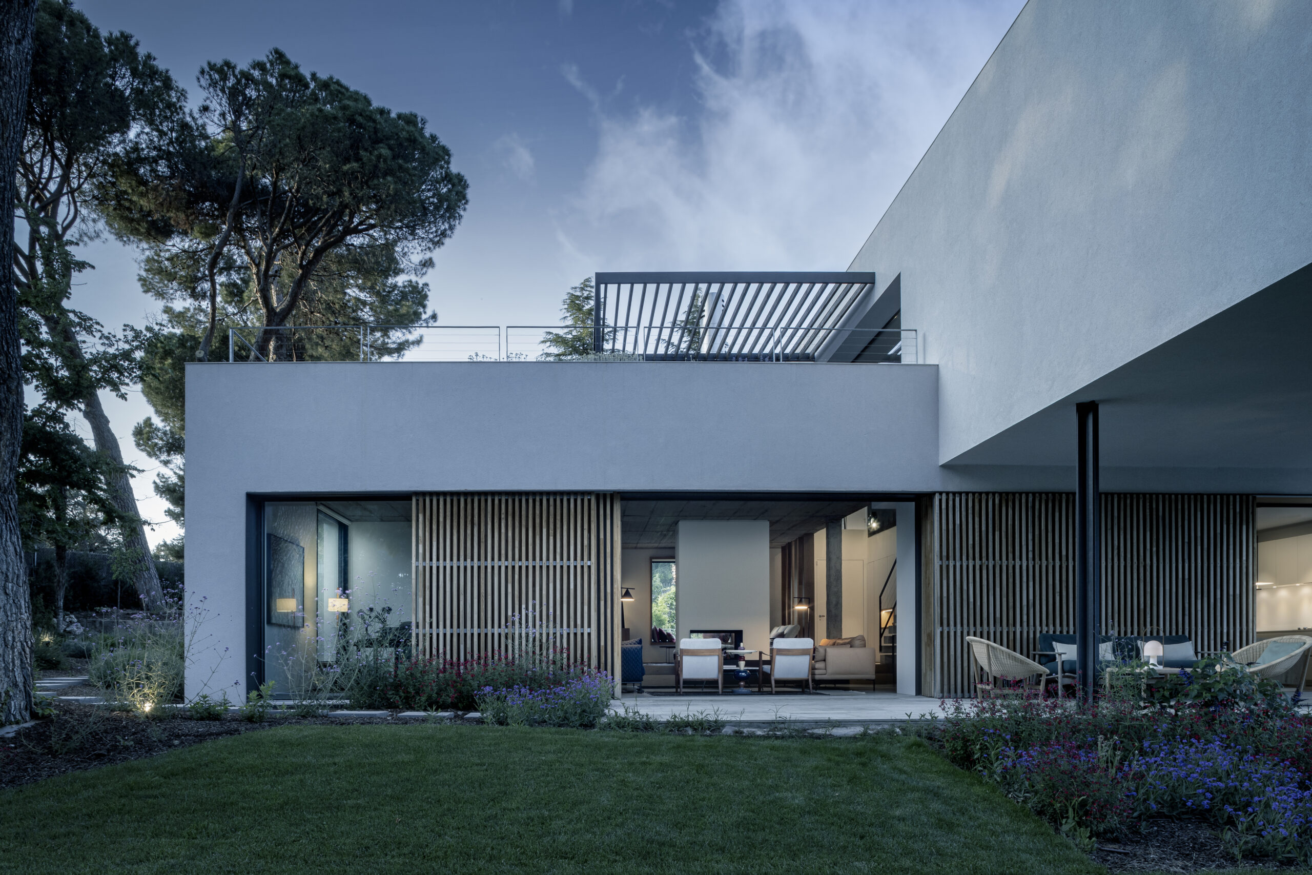 This volumetric play also enabled the development of a landscaped upper terrace that integrates vegetation into the home and invites rest.