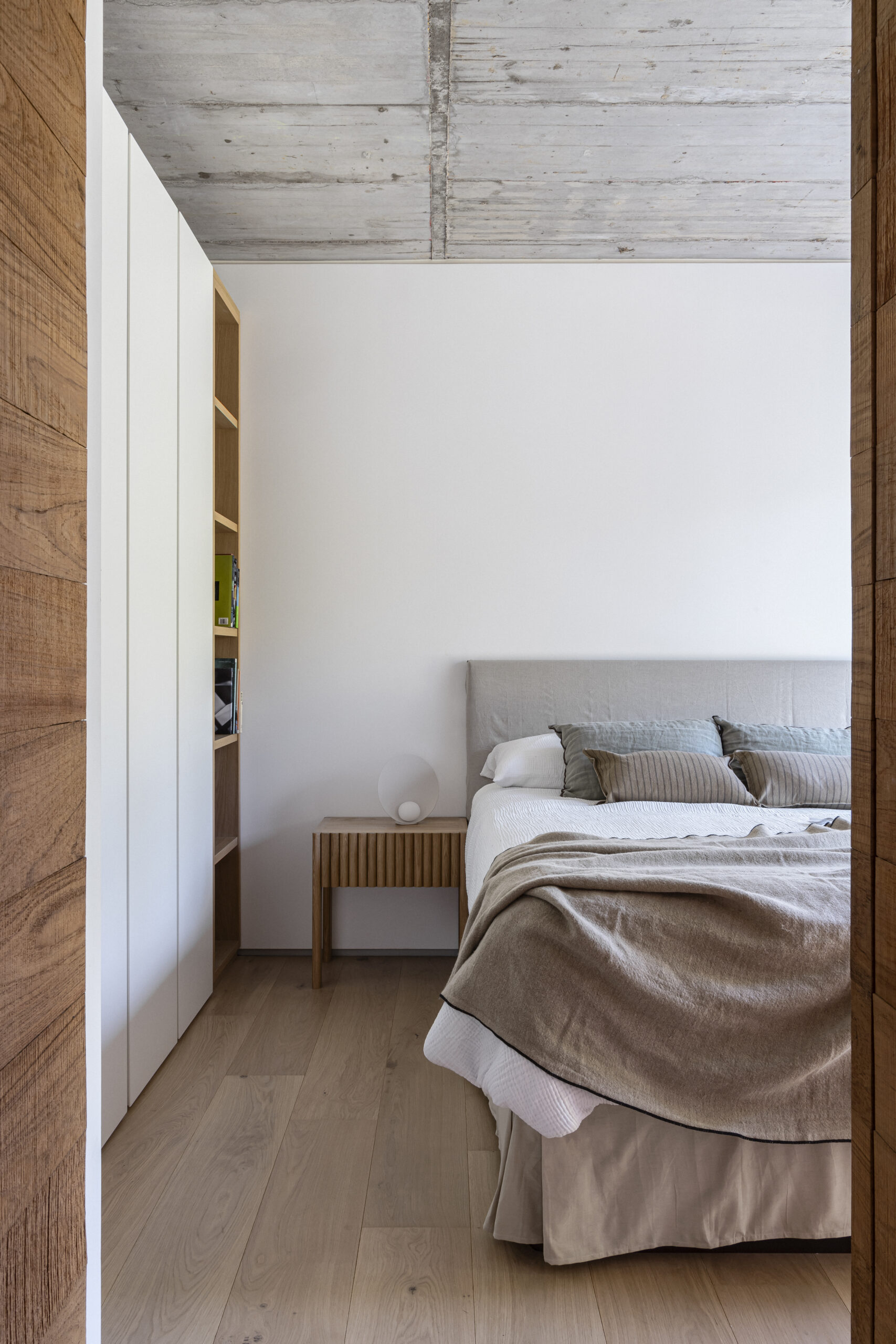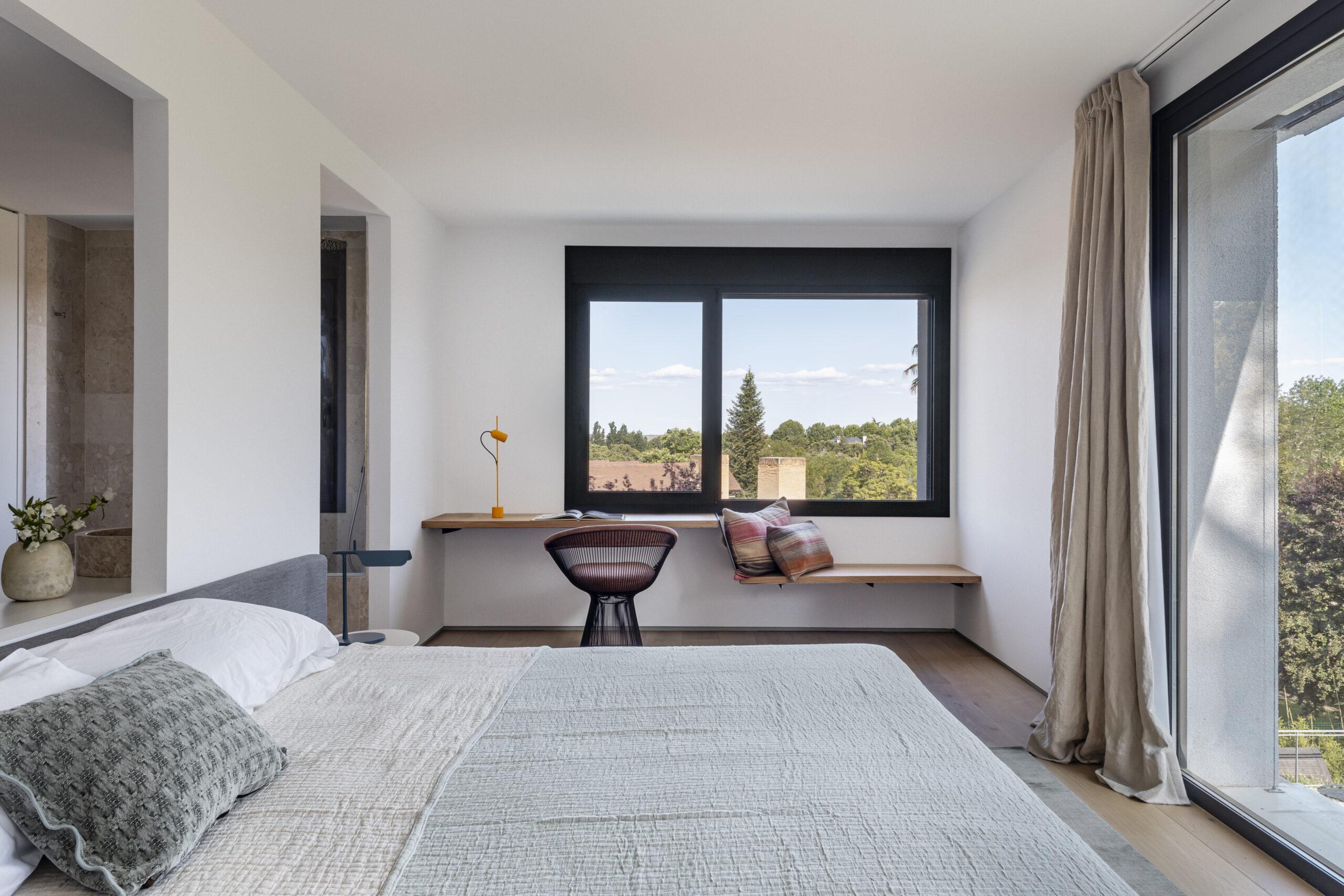 La planta alta recoge las habitaciones privadas. No obstante, la distribución se planteó de forma que los espacios invitaran a la convivencia y la interacción familiar, por lo que se proyectó una estancia para el encuentro social que reúne el acceso a los dormitorios. Entre ellos, destaca la habitación principal por sus amplias vistas a la vegetación, un marco que captura una imagen natural y cambiante.