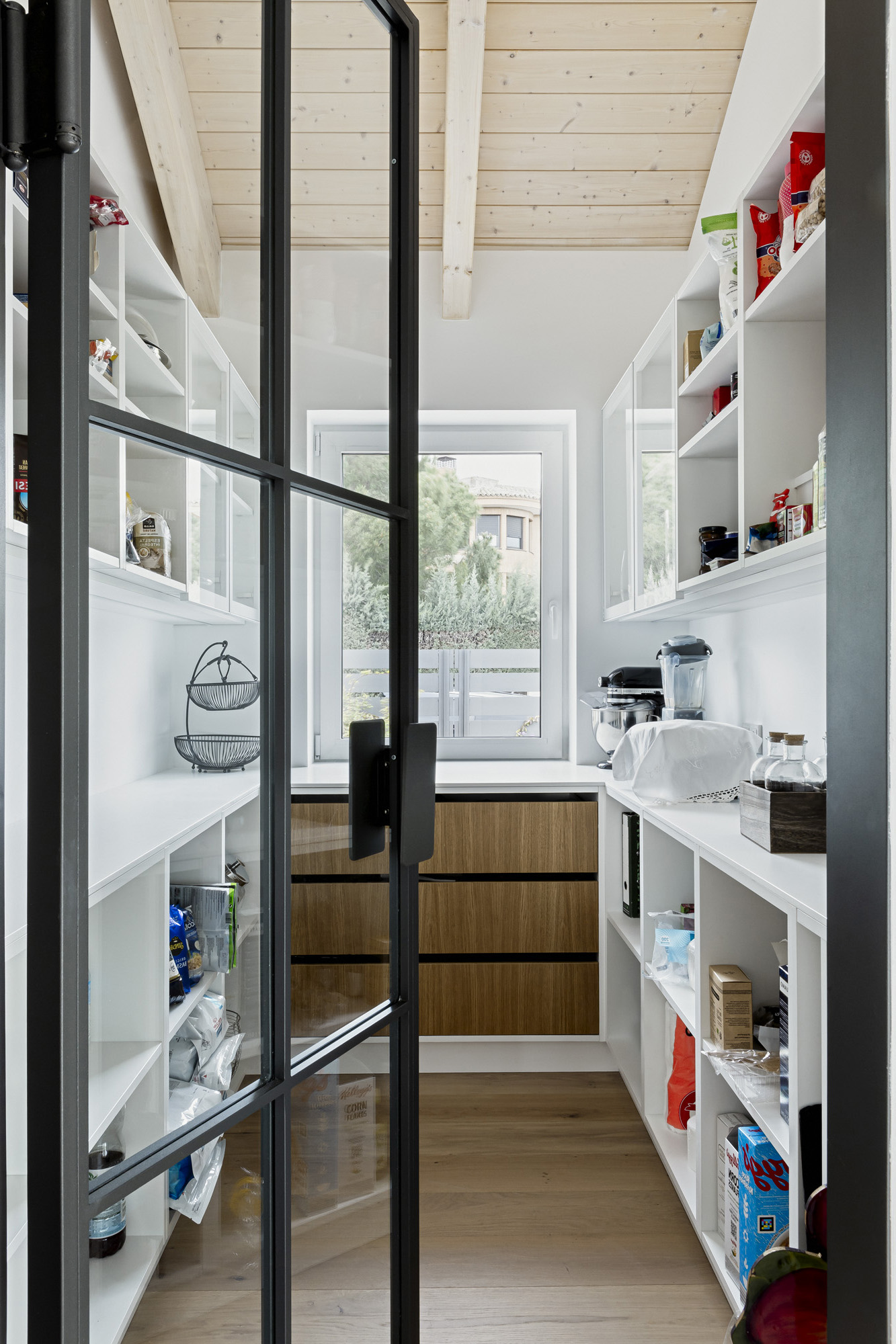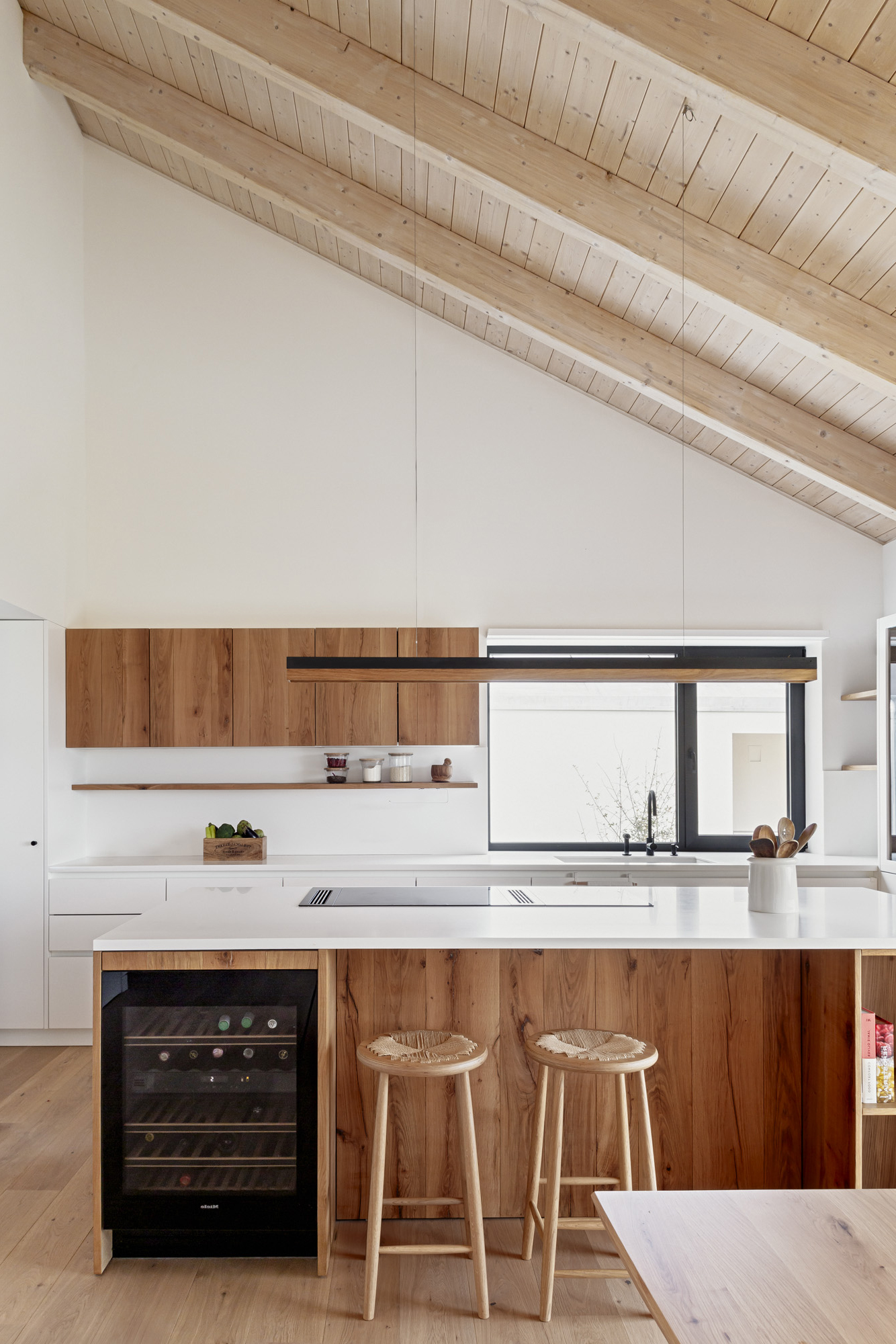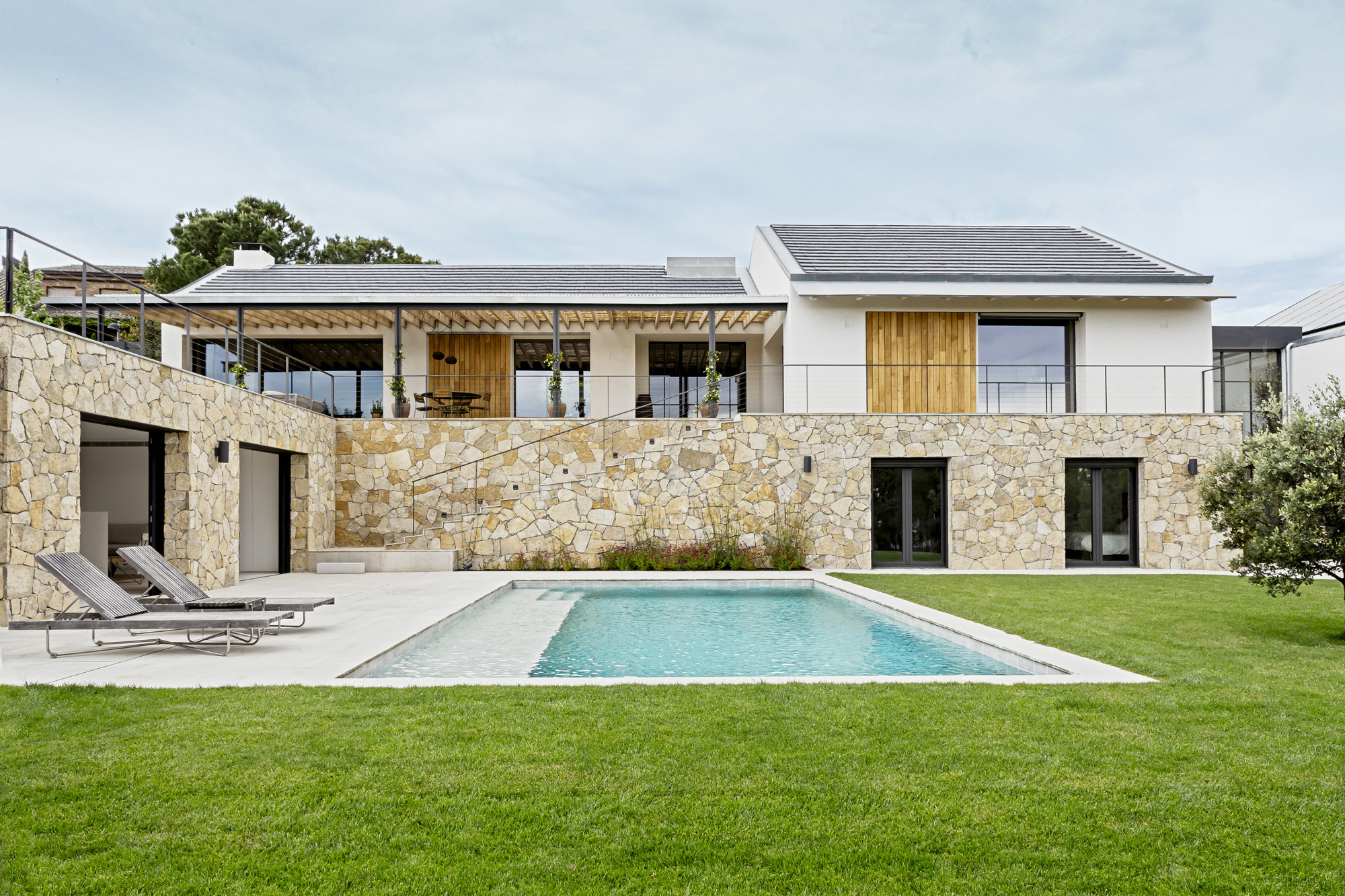 El volumen superior aloja los usos más públicos (cocina, comedor, salón…), el dormitorio principal y una zona de estar donde hacer la vida en familia. Bajo los mismos se encuentran la zona de servicio, la de invitados y los dormitorios de los niños con salida directa a la piscina y a la zona de la barbacoa.
