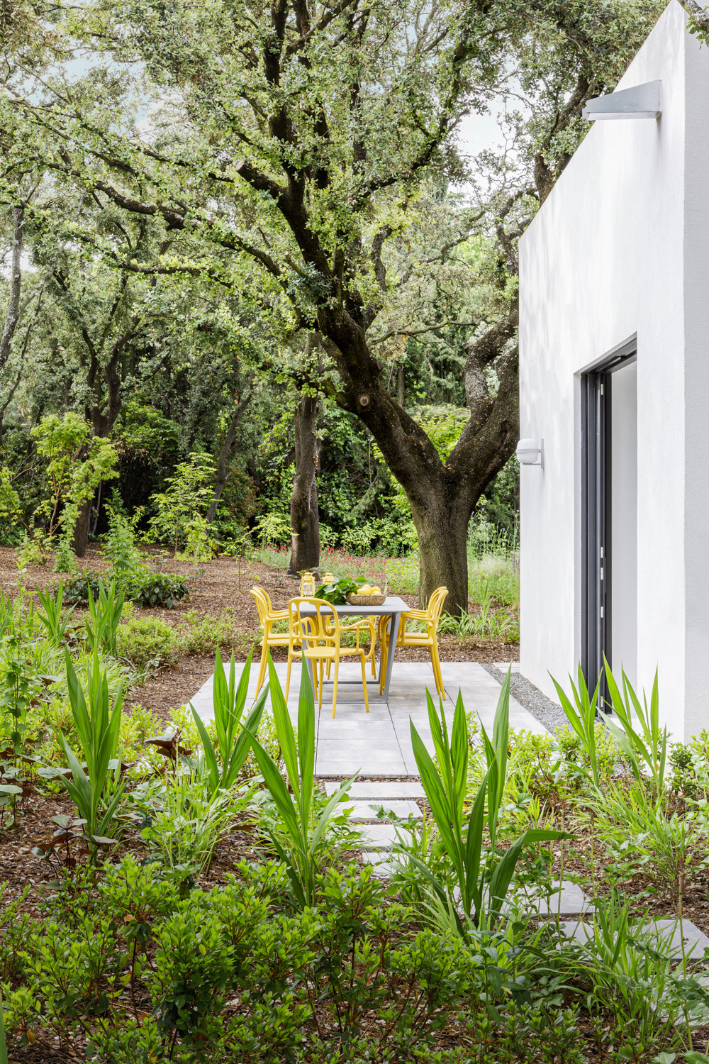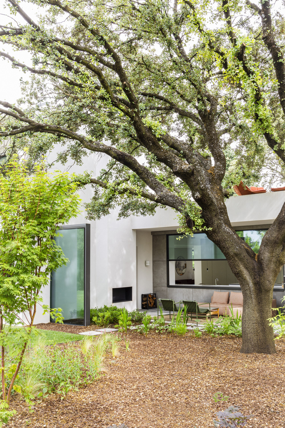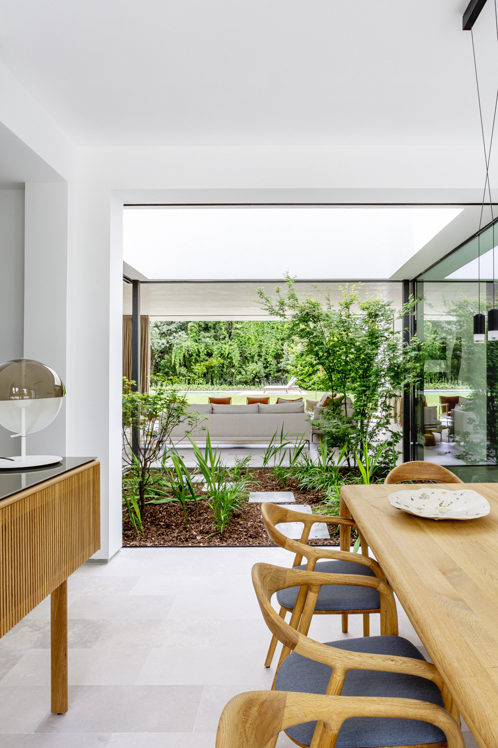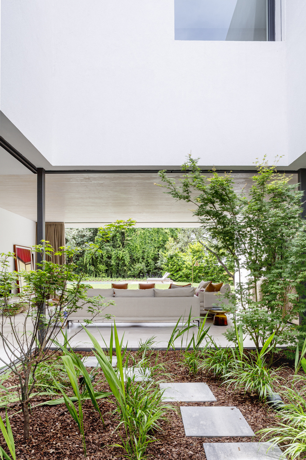 Para ello, mantuvimos los módulos este y oeste de la estructura y demolimos la parte central, generando así las volumetrías que necesitábamos para los espacios principales de la casa: salón, comedor y cocina en planta baja y dormitorio principal en planta alta. En esta zona, se consiguió una altura de techos de más de 3 m donde antes no llegaban a los 2,40m y generamos un patio central ajardinado entorno al cual se estructuran los usos principales de la casa provocando así una entrada de luz natural en el centro de la vivienda. Además del aporte de luz, este patio mejora la eficiencia energética de la casa, ya que permite su apertura durante las noches de verano sin comprometer la seguridad, refrescando toda la casa de forma natural. La frontera interior-exterior desaparece aquí, ya que se remató el perímetro con grandes ventanas correderas que desaparecen por completo, inundando la casa de luz un espacio continuo en toda la planta. Se concibe también como un espacio de paso entre el salón y el comedor o entre la cocina y la sala de estar. Buscamos la sensación de meter el jardín dentro de casa para conseguir una vinculación constante con la naturaleza.  En este proyecto se cuidó mucho el proyecto de paisajismo, para disfrutar de multitud de variedades vegetales desde cada rincón de la casa, que van cambiando de color con el paso de las estaciones. Con nuestra intervención, intentamos arropar la casa poniendo en valor además la apabullante vegetación preexistente.