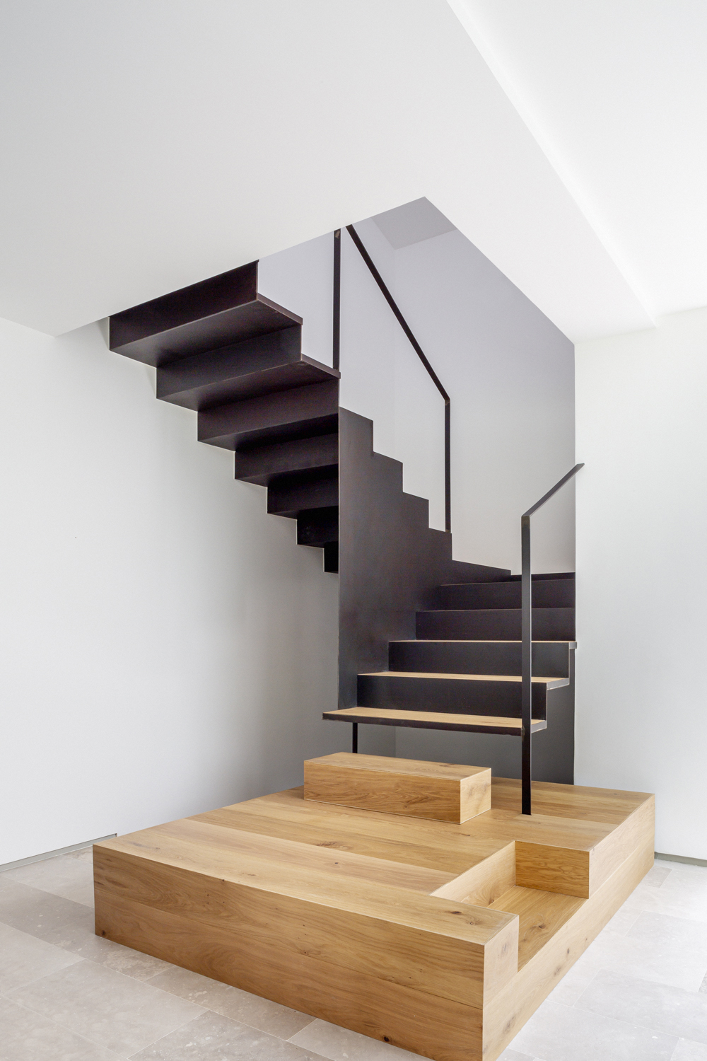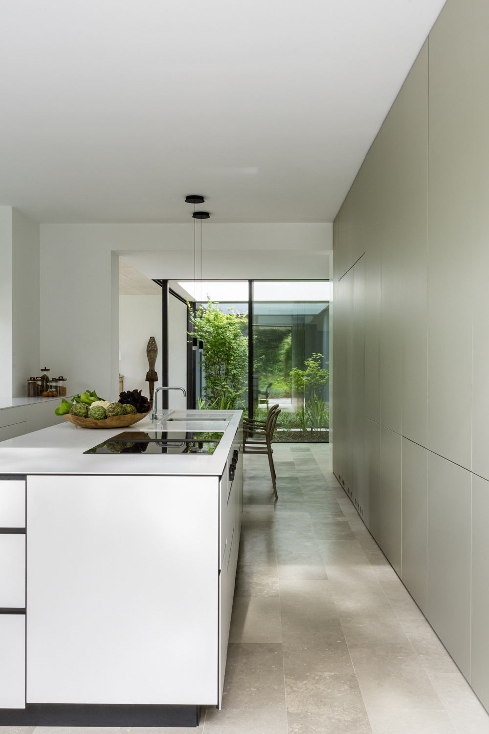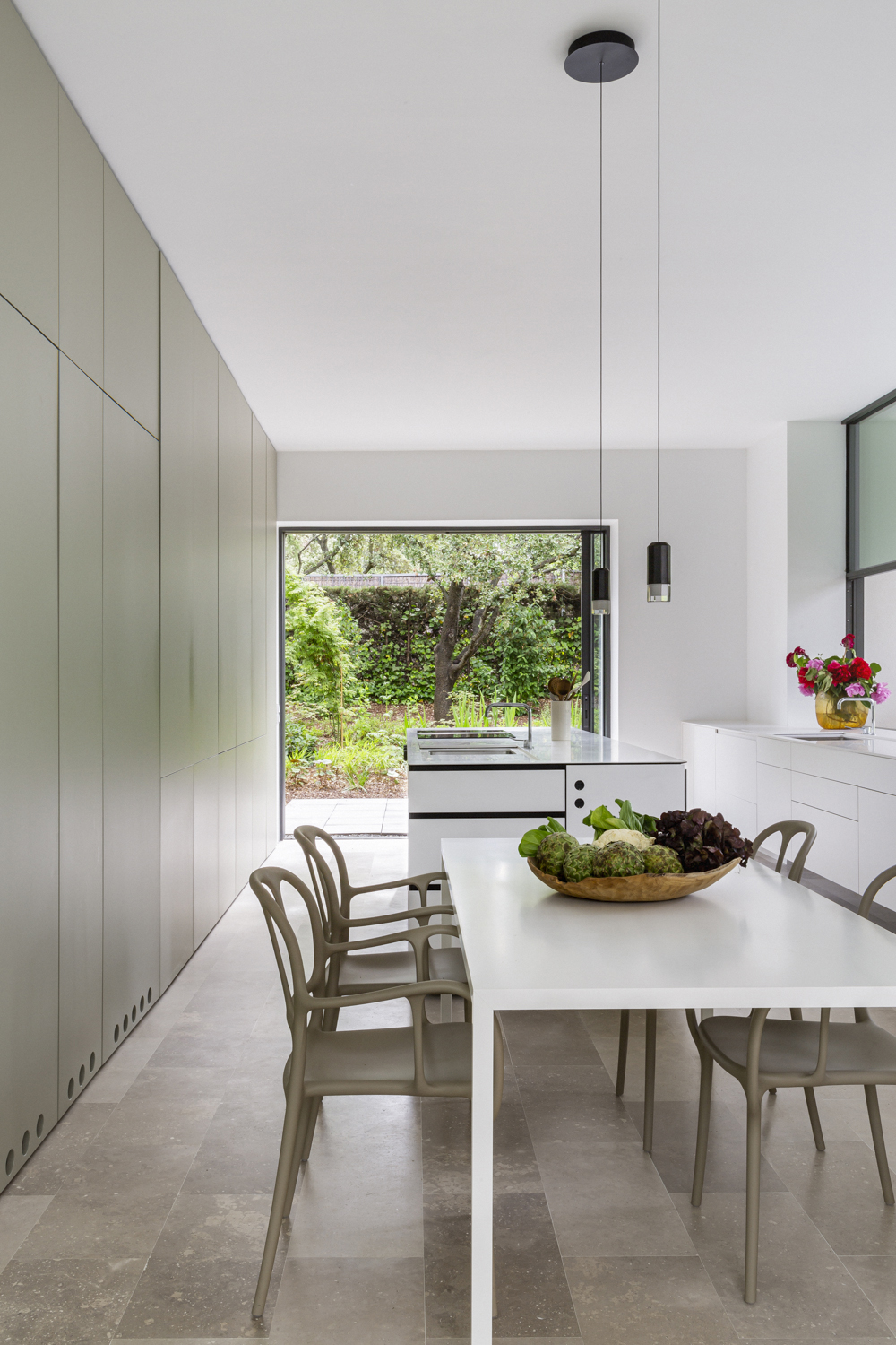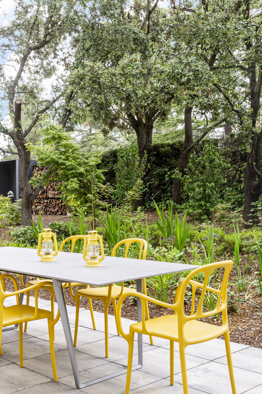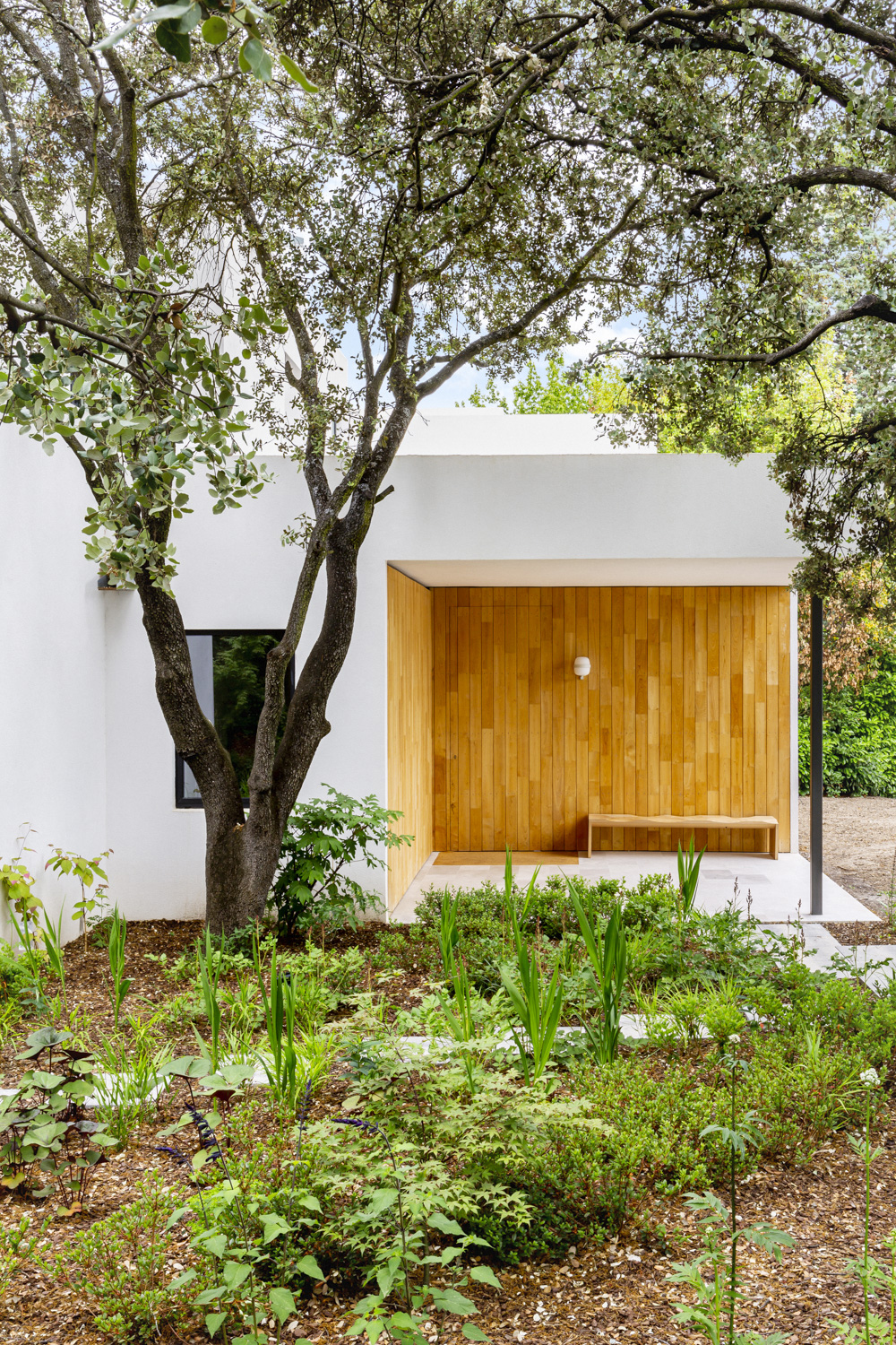 Para ello, mantuvimos los módulos este y oeste de la estructura y demolimos la parte central, generando así las volumetrías que necesitábamos para los espacios principales de la casa: salón, comedor y cocina en planta baja y dormitorio principal en planta alta. En esta zona, se consiguió una altura de techos de más de 3 m donde antes no llegaban a los 2,40m y generamos un patio central ajardinado entorno al cual se estructuran los usos principales de la casa provocando así una entrada de luz natural en el centro de la vivienda. Además del aporte de luz, este patio mejora la eficiencia energética de la casa, ya que permite su apertura durante las noches de verano sin comprometer la seguridad, refrescando toda la casa de forma natural. La frontera interior-exterior desaparece aquí, ya que se remató el perímetro con grandes ventanas correderas que desaparecen por completo, inundando la casa de luz un espacio continuo en toda la planta. Se concibe también como un espacio de paso entre el salón y el comedor o entre la cocina y la sala de estar. Buscamos la sensación de meter el jardín dentro de casa para conseguir una vinculación constante con la naturaleza.  En este proyecto se cuidó mucho el proyecto de paisajismo, para disfrutar de multitud de variedades vegetales desde cada rincón de la casa, que van cambiando de color con el paso de las estaciones. Con nuestra intervención, intentamos arropar la casa poniendo en valor además la apabullante vegetación preexistente.