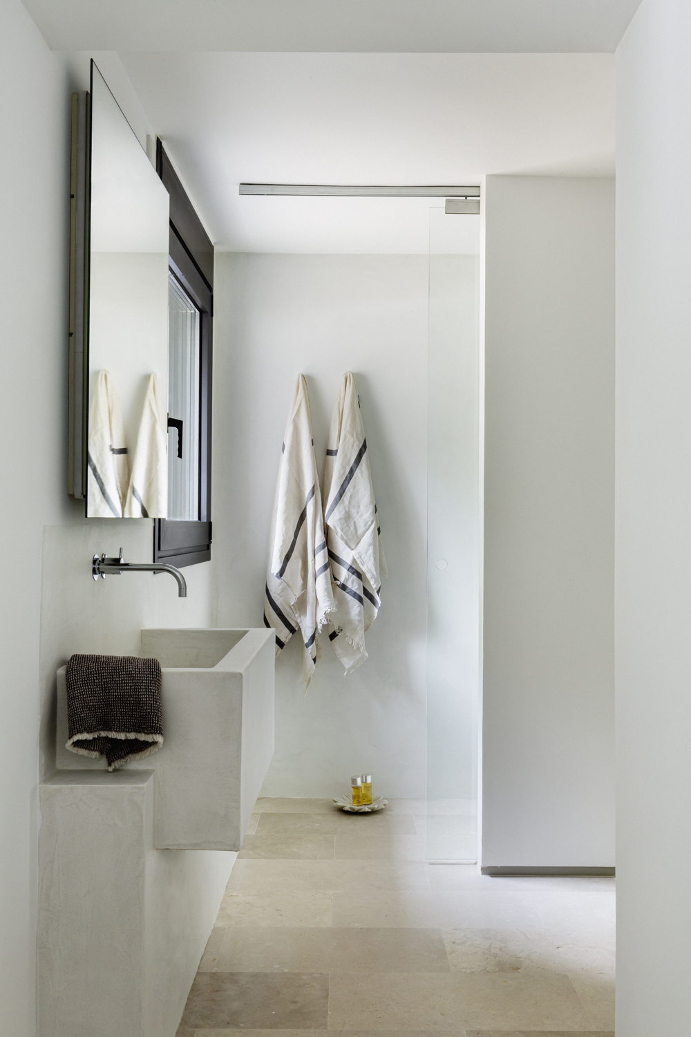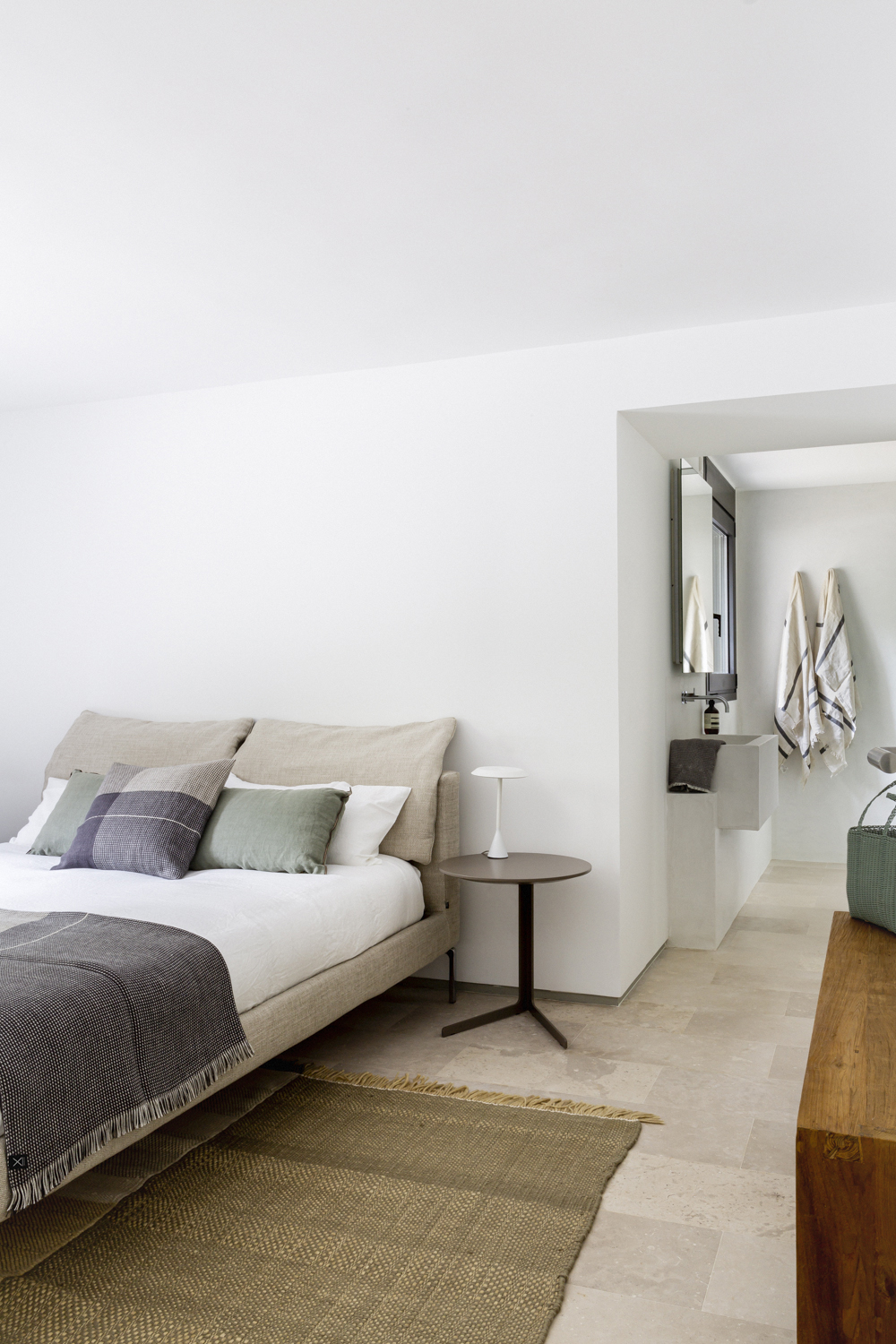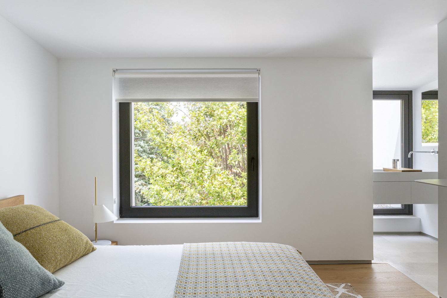 The bedrooms are distributed on the upper floor. The main one has a huge window that allows the complete opening of the south façade to the outside, both in the bedroom space and in the bathroom. Both spaces are visually united, since they are only set aside by a wardrobe that does not reach the ceiling, expanding the feeling of space in the two rooms.