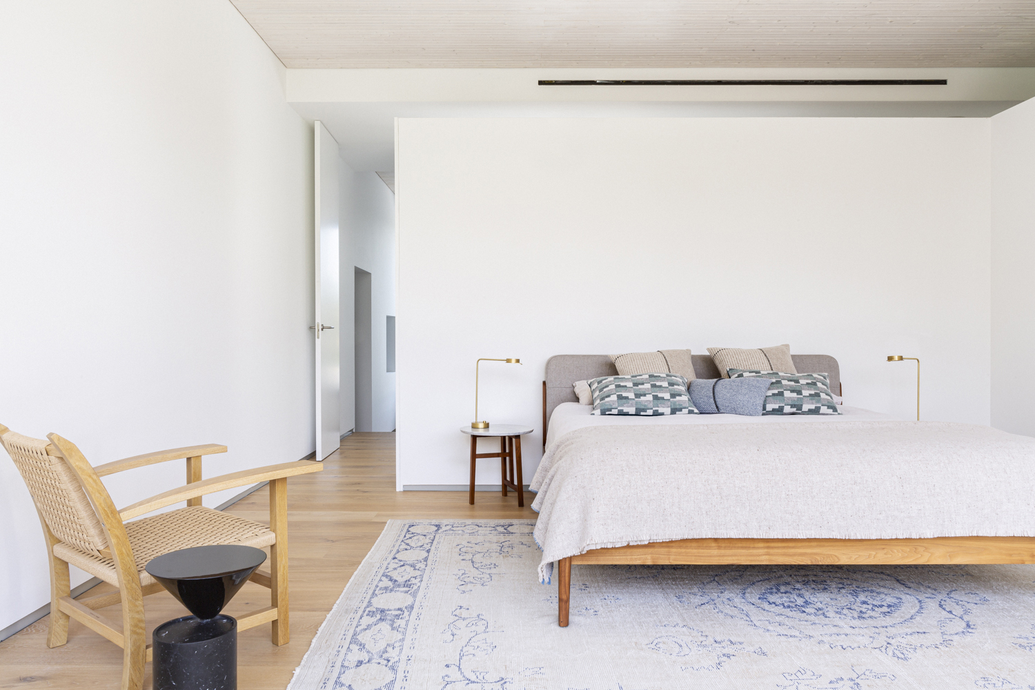 En la planta alta se distribuyeron los dormitorios. El principal cuenta con un enorme ventanal que permite la apertura completa de la fachada sur al exterior, tanto en el espacio de dormitorio como en el cuarto de baño.  Ambos espacios están unidos visualmente, ya que sólo los separa un armario que no llega hasta el techo, ampliando la sensación de espacio en las dos estancias.