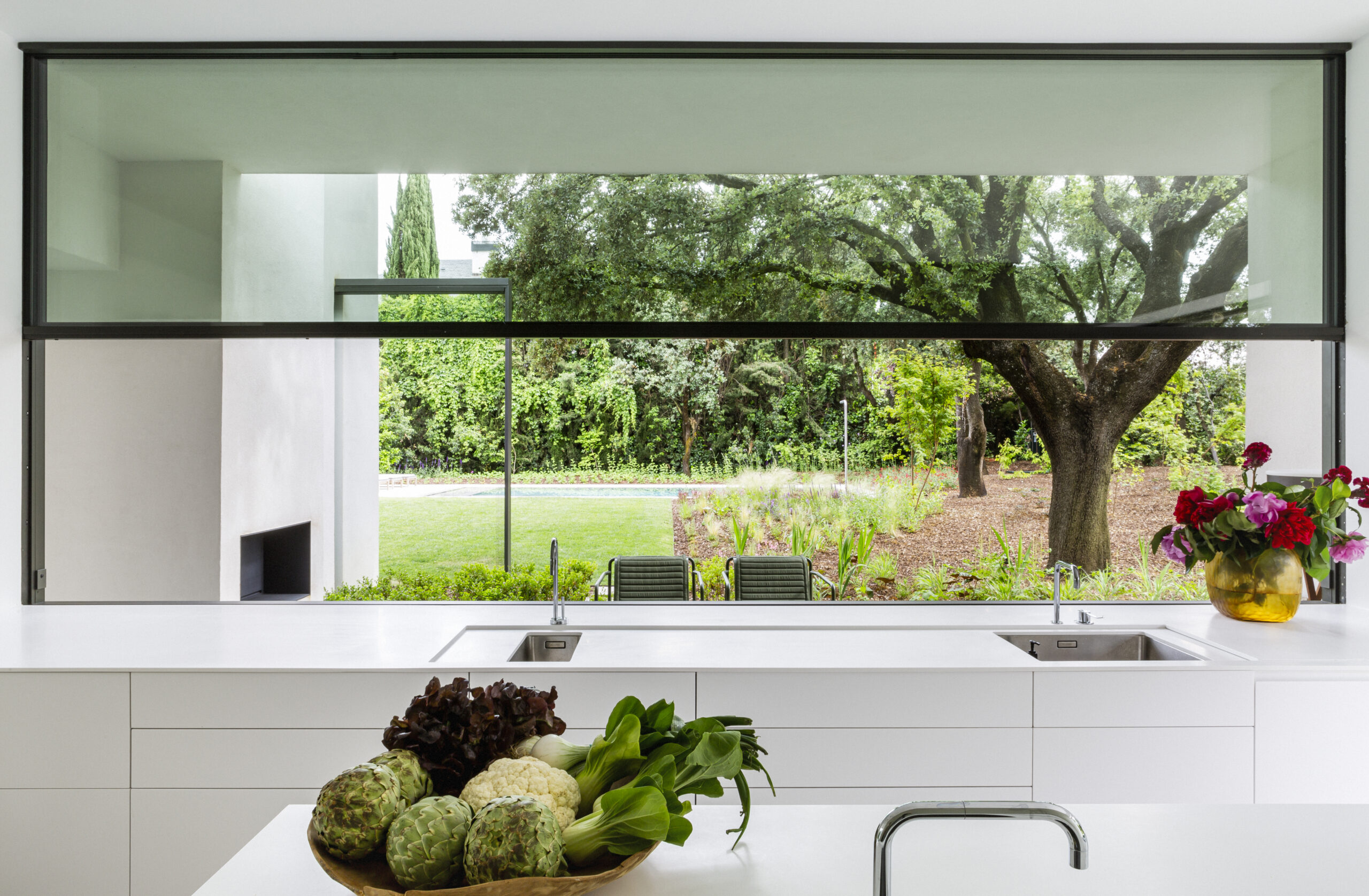 To do this, we kept the east and west modules of the structure and demolished the central part, thus generating the volumes we needed for the main spaces of the house: living room, dining room and kitchen on the ground floor and the master bedroom on the upper floor. In this area, a ceiling height of more than 3 m was achieved where before they did not reach 2.40 m and we generated a central landscaped patio around which the main uses of the house are structured, causing an entrance of natural light in the housing center. In addition to providing light, this patio improves the energy efficiency of the house, as it allows it to be opened during summer nights without compromising safety, cooling the entire house naturally. The interior-exterior border disappears here, since the perimeter was top off with large sliding windows that disappear completely, flooding the house with light in a continuous space throughout the floor. It is also conceived as a passage space between the living room and the dining room or between the kitchen and the living room. We seek the sensation of introducing the garden into the house to achieve a constant connection with nature. In this project, great care was taken in the landscaping project, to enjoy a multitude of plant varieties from every corner of the house, which change color with the passing of the seasons. With our intervention, we try to clothe the house, also adding value to the overwhelming pre-existing vegetation.
