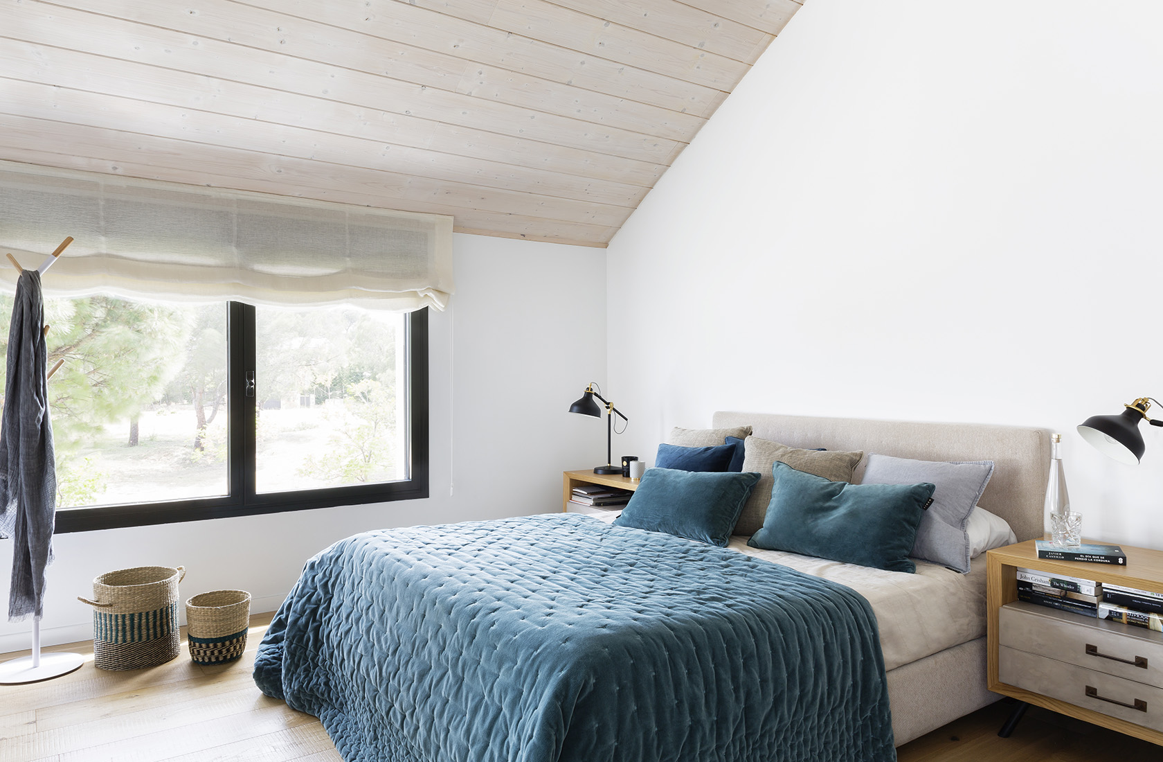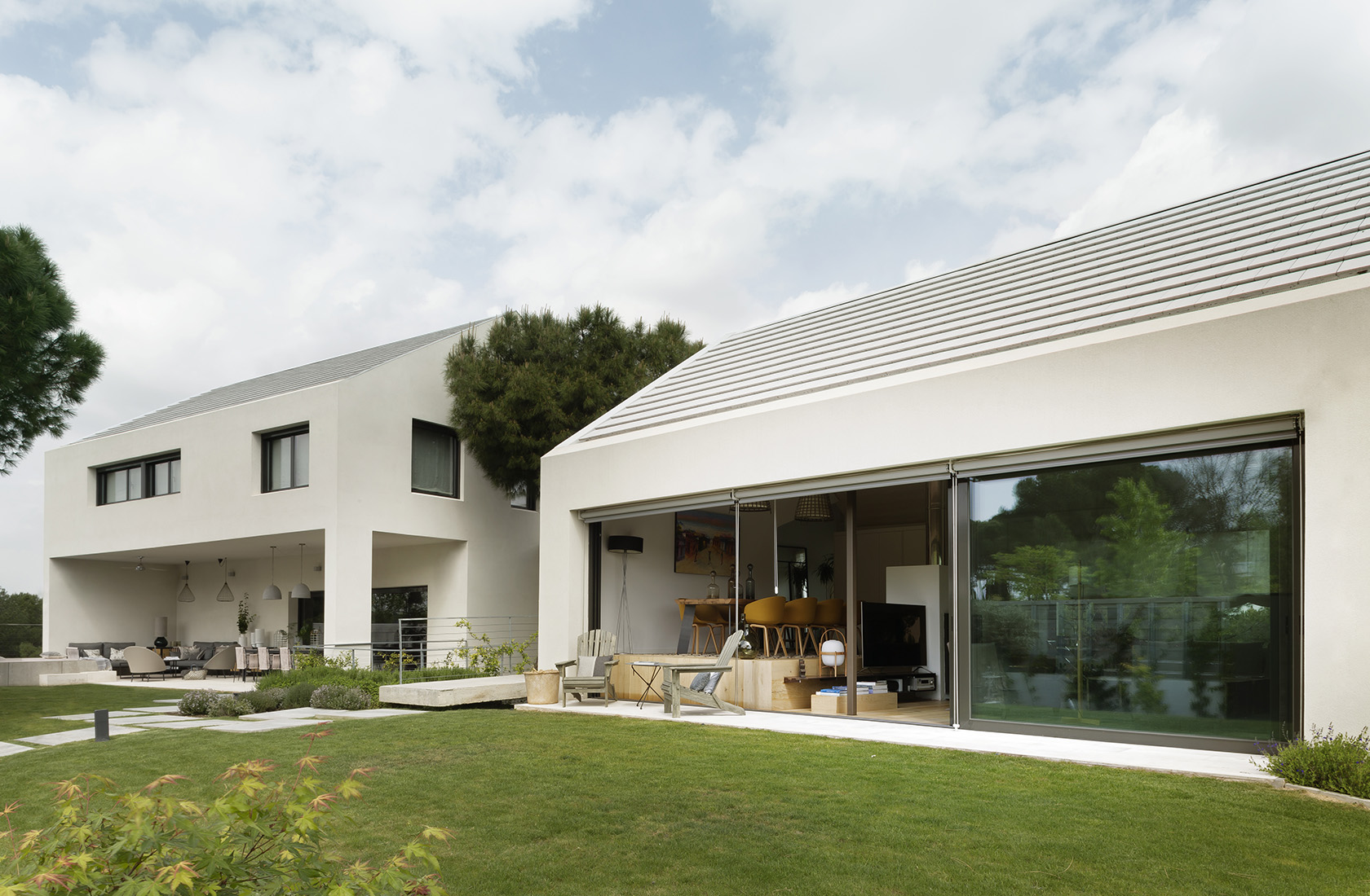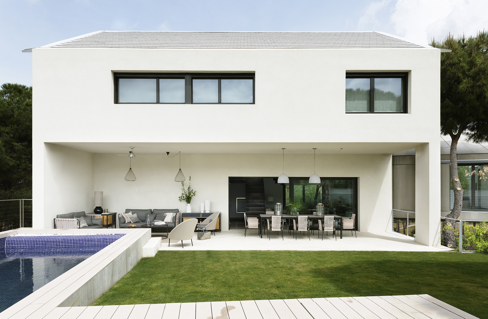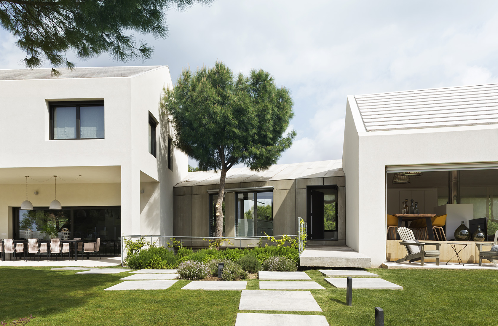 The concept of double-pitched roof architecture tries to recover the iconic traditional home, together with a unique envelope which avoids mixing colours and materials, so as to achieve a feeling of homogeneity in all of its volumes. Also, the lower rooms provide more intimate spaces, whilst the high-ceiling areas generate spaces of great amplitude.