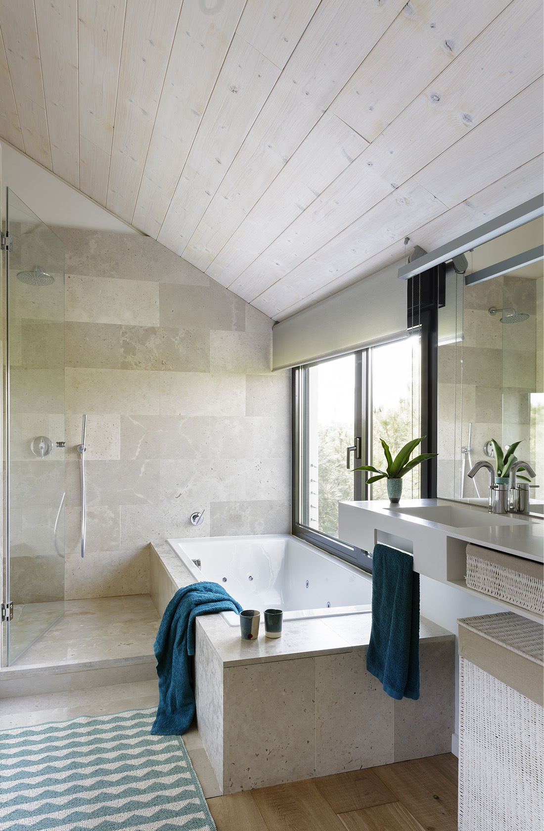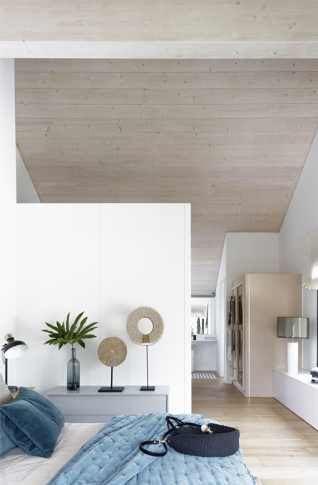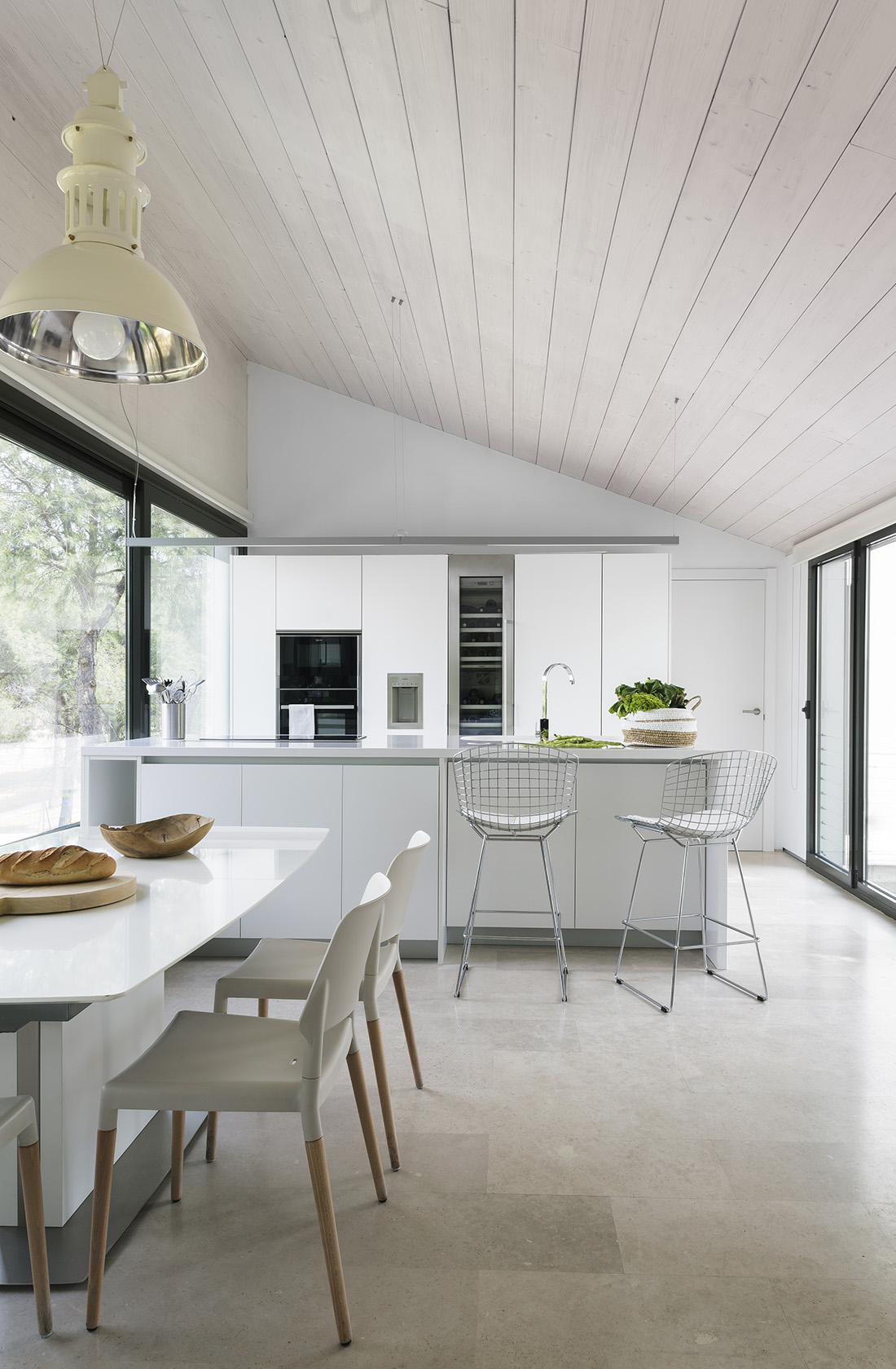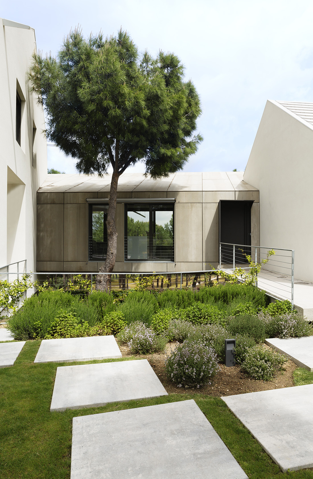 The concept of double-pitched roof architecture tries to recover the iconic traditional home, together with a unique envelope which avoids mixing colours and materials, so as to achieve a feeling of homogeneity in all of its volumes. Also, the lower rooms provide more intimate spaces, whilst the high-ceiling areas generate spaces of great amplitude.